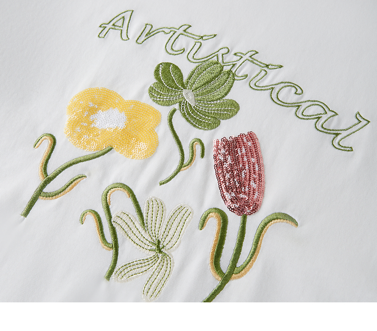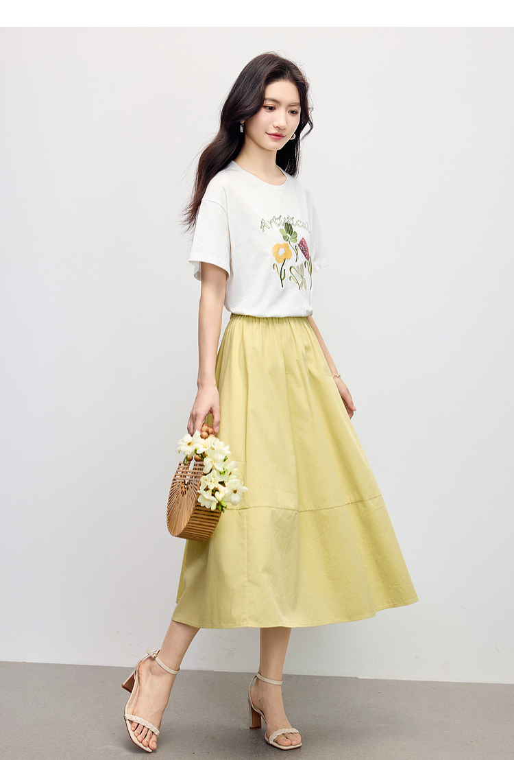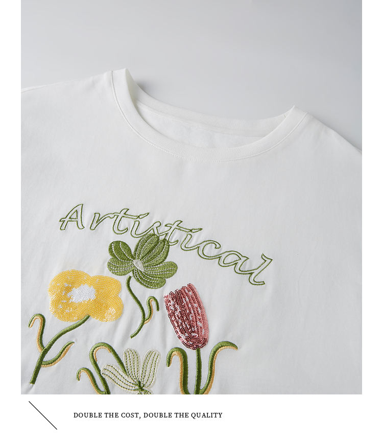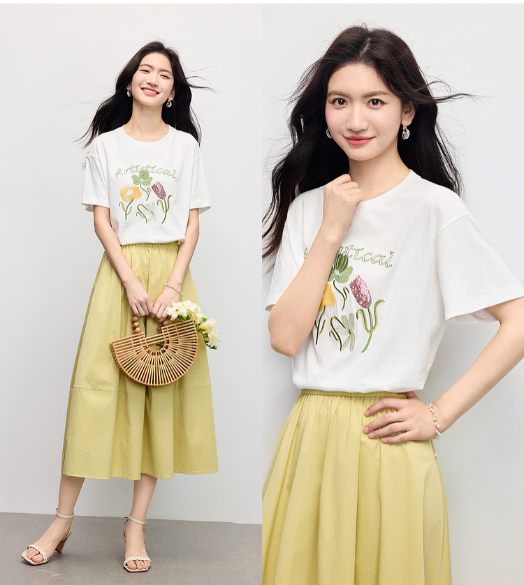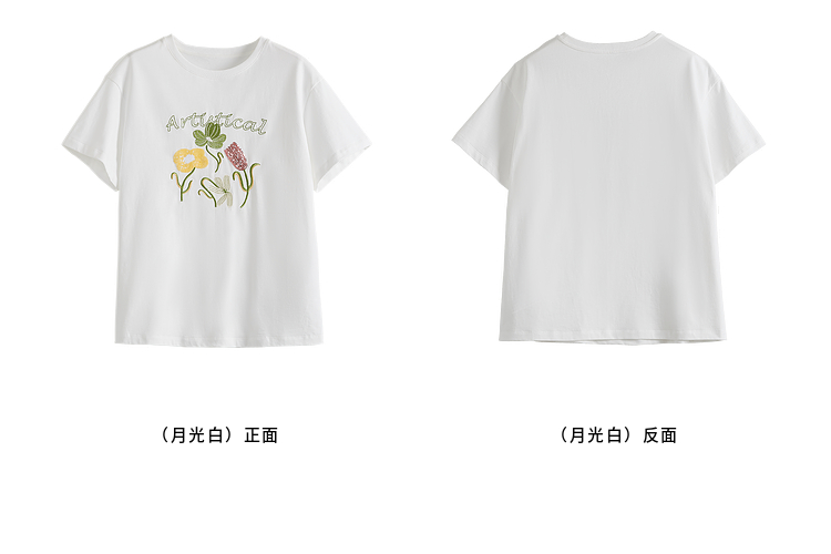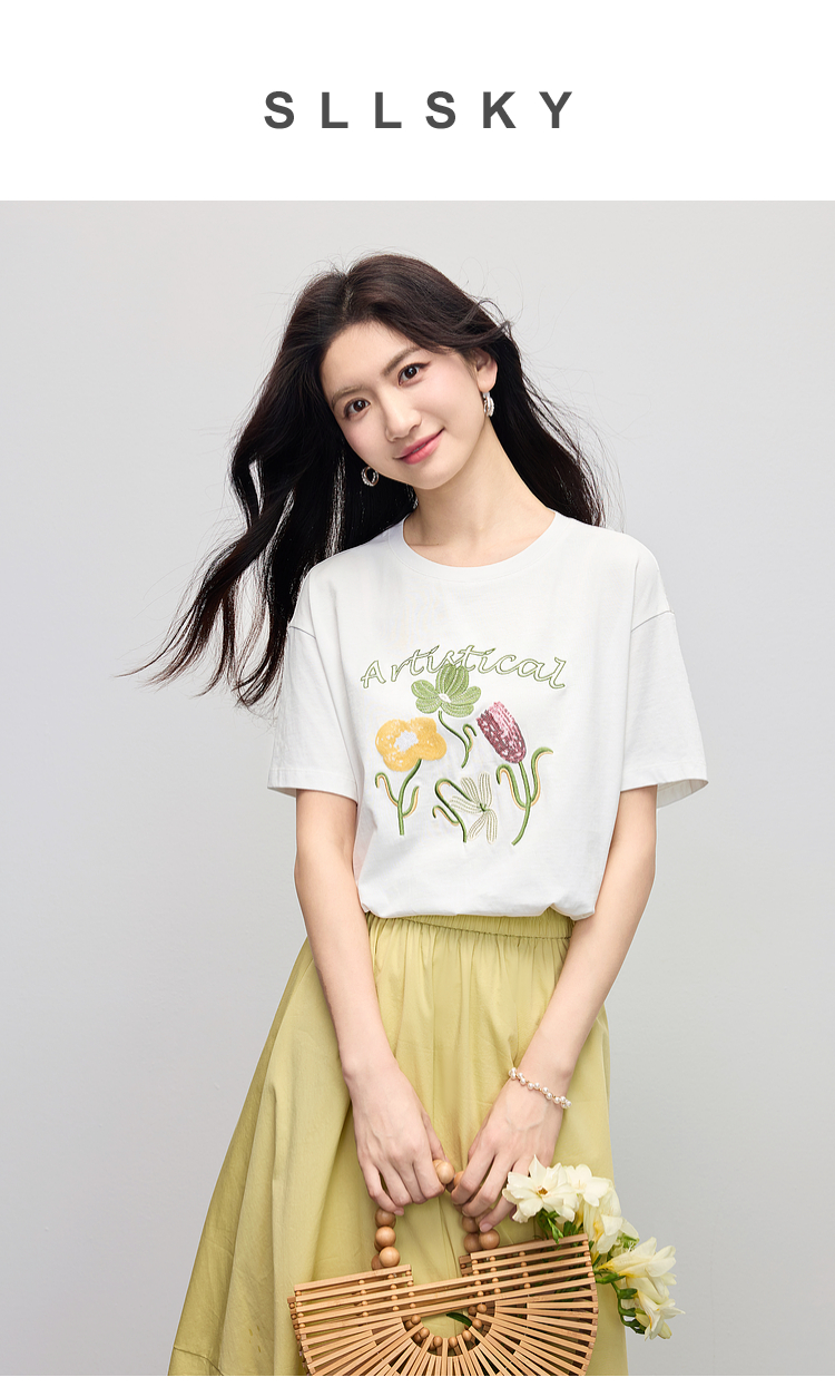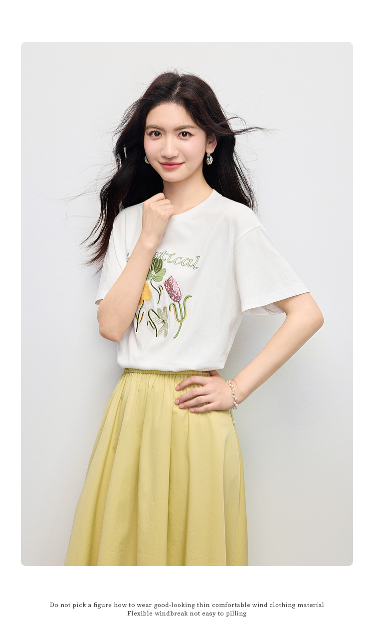 【专属特价】熙世界100%长绒棉绣花T恤短袖女2025夏季新款圆领宽松白体恤上衣
