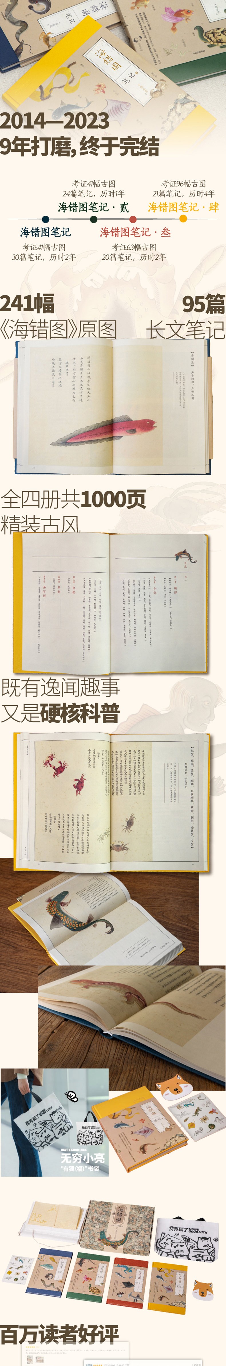 第四本确实不好写。好写的都在前三本写完了,就剩一堆零零碎碎的物种,或者怪力乱神的生物,什么长六条腿的龟、长鸡冠子的鱼啥的。我的原则是,太虚头巴脑的就不考证了,谁知道当时是哪个村头老太太编的。至于那些能鉴定出来,但是除了名字就没故事的,我也放弃了一些,毕竟我写的是文章,不是词条。我找到一条条主线,用它们串起尽可能多的物种。这样能让碎的东西显得规整一点。所以第四册虽然只有21篇文章,但每篇体量可不小,而且考证了96种《海错图》中的生物,比一册和第二册的总和还要多。我的目标是《海错图笔记》系列每一册都要比前一册更好,到了第四册,好不好我说了不算,至少先做到给得多。