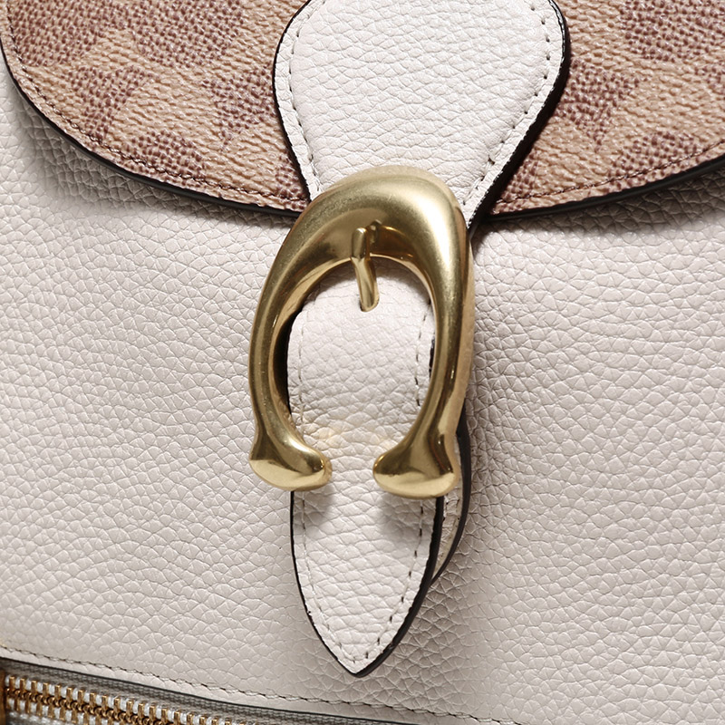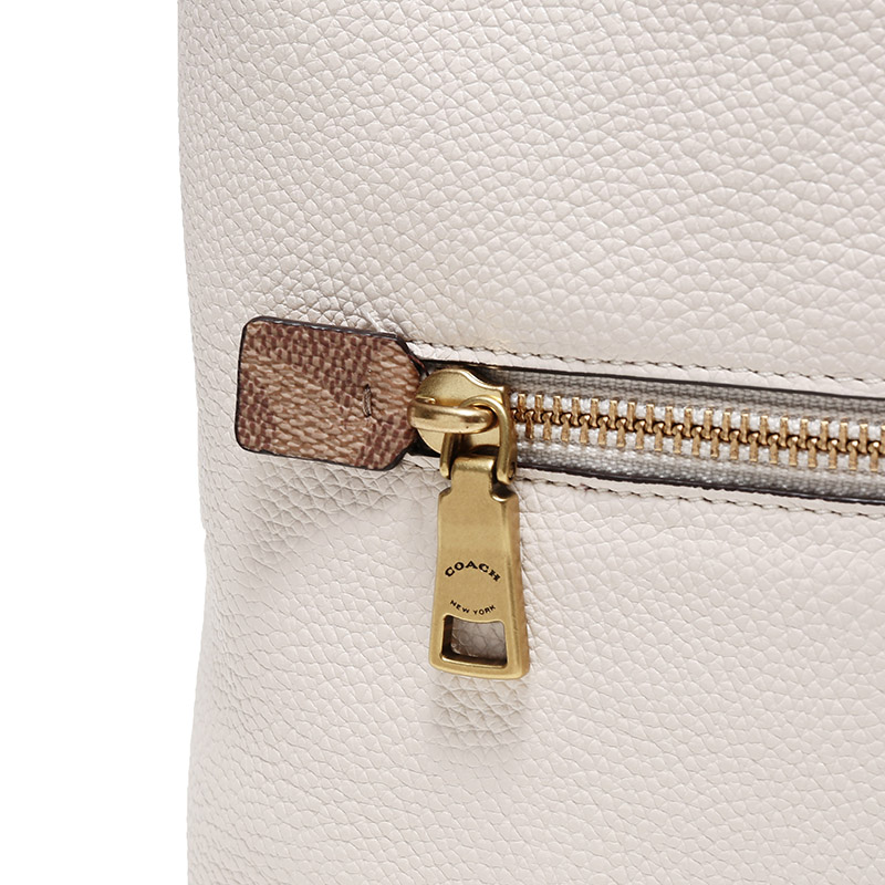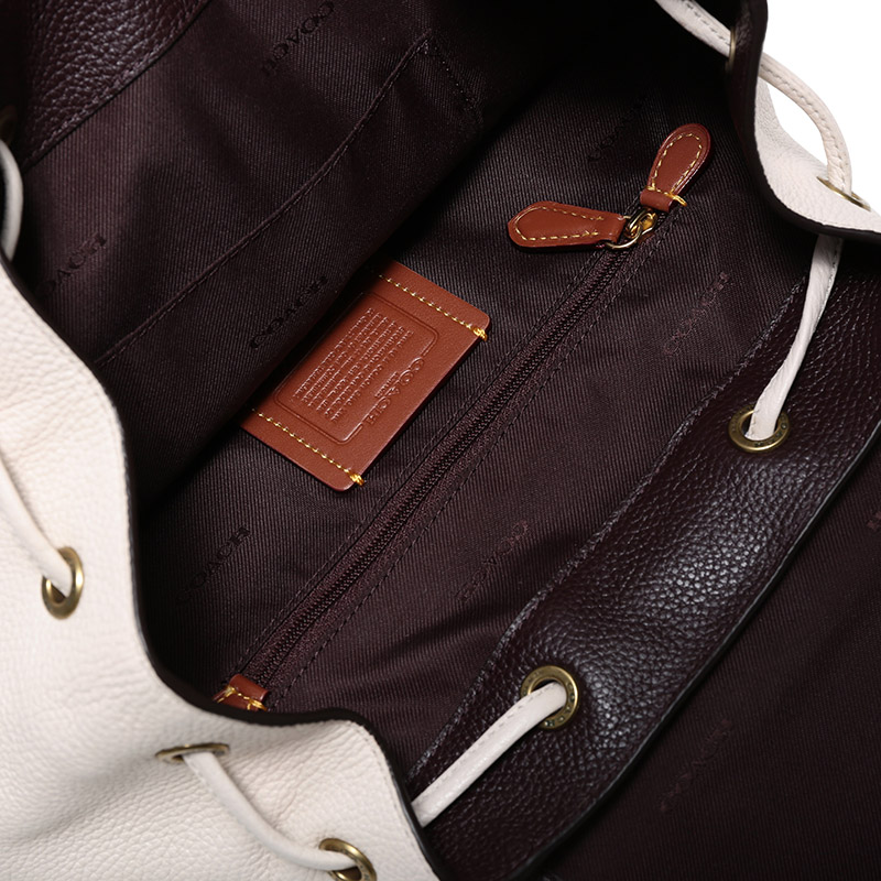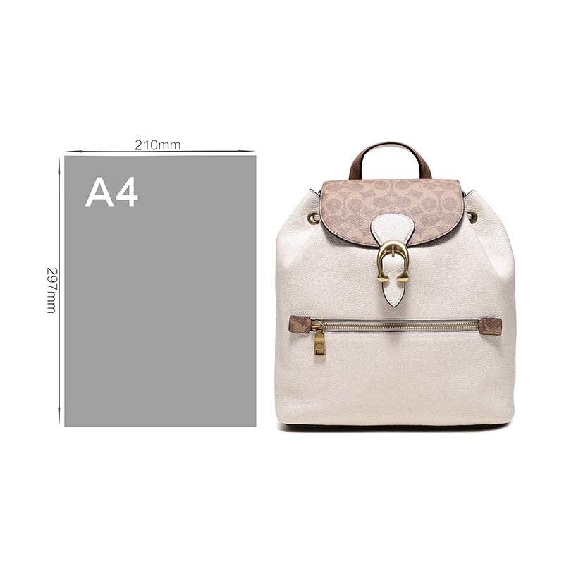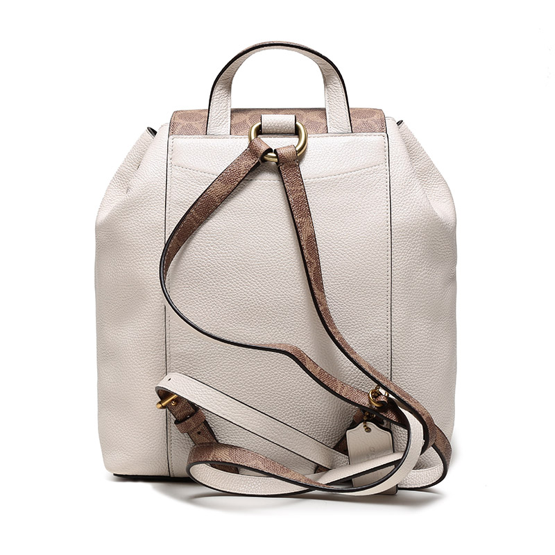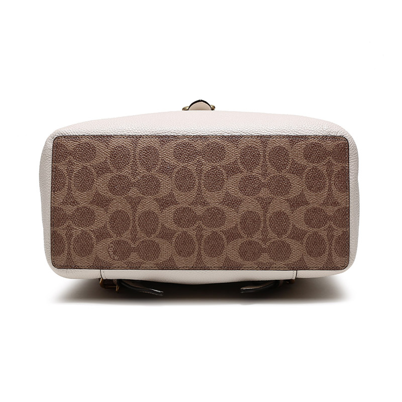 品牌:COACH/蔻驰产地:中国、越南、菲律宾等国(批次不同、产地不同)款式:女士产品颜色:棕黄色粉笔白色材质:涂层帆布配皮产品结构:吸扣翻盖,抽绳开合,内置1个主袋,1个拉链贴袋,1个贴袋,外置1个拉链贴袋产品尺寸:宽约25cm,高约28cm,厚约11cm