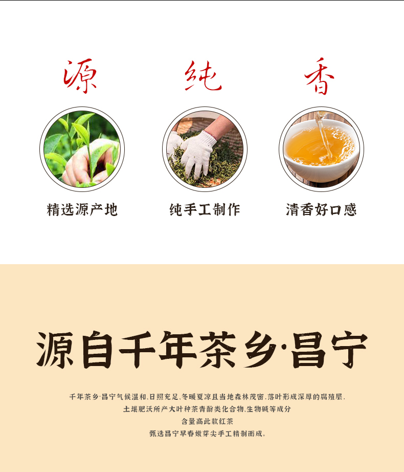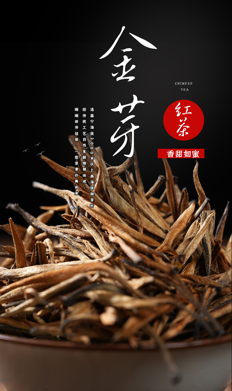 【产品特点】产自云南千年茶乡昌宁,精选云南大叶种单芽为原料,采用传统工艺精制而成。其外形金毫披露,挺直似针,汤色红艳明亮、香高韵长,鲜爽回甘。
