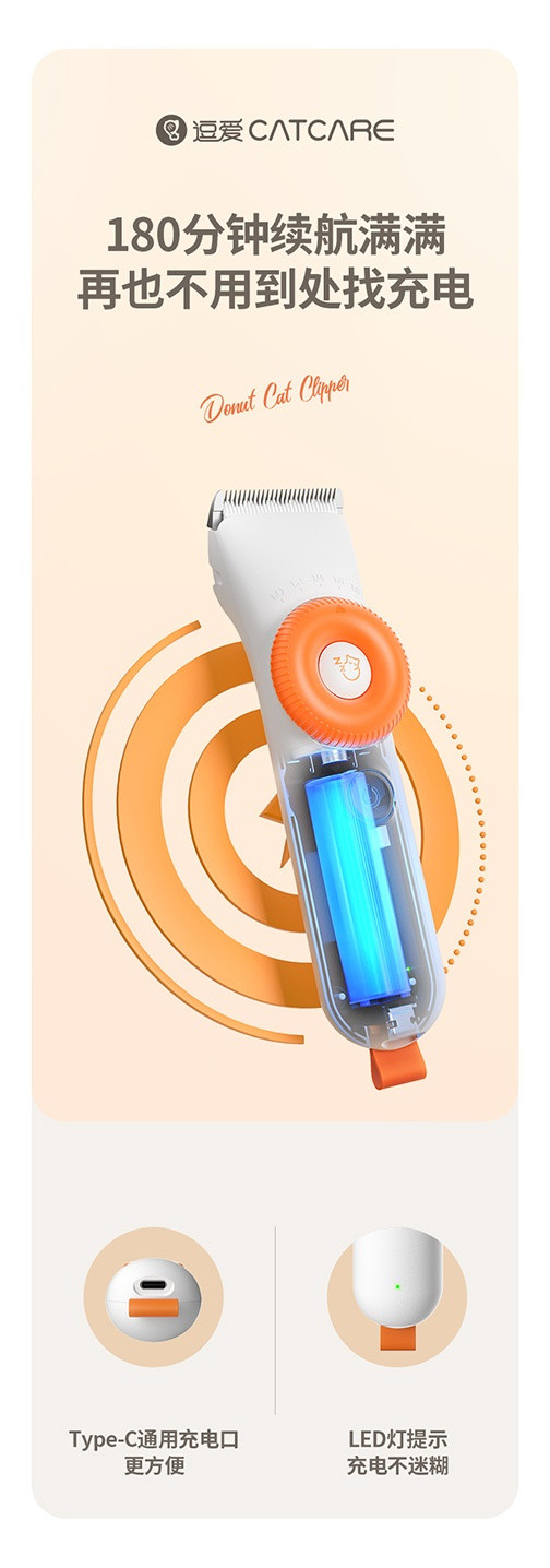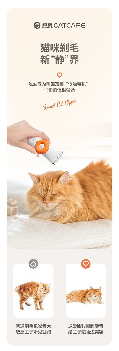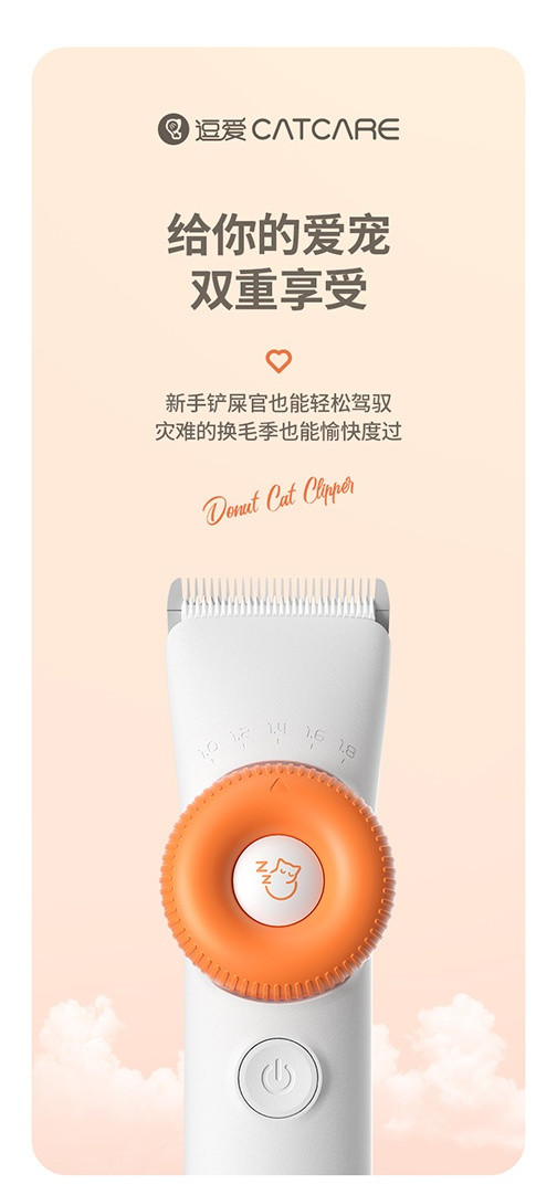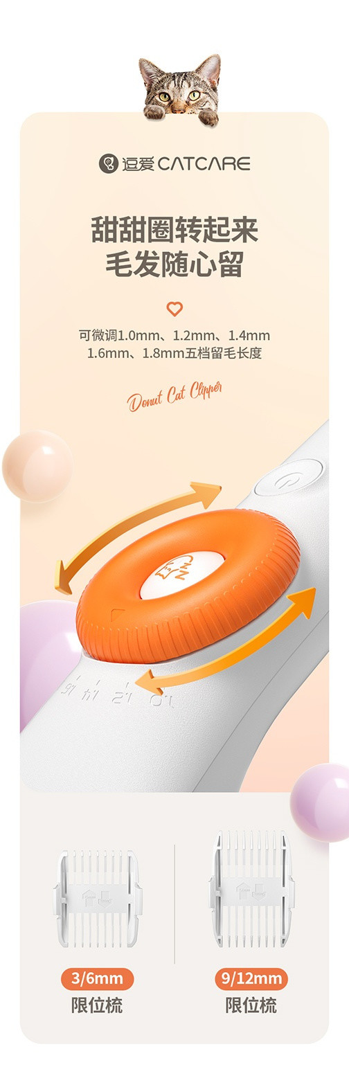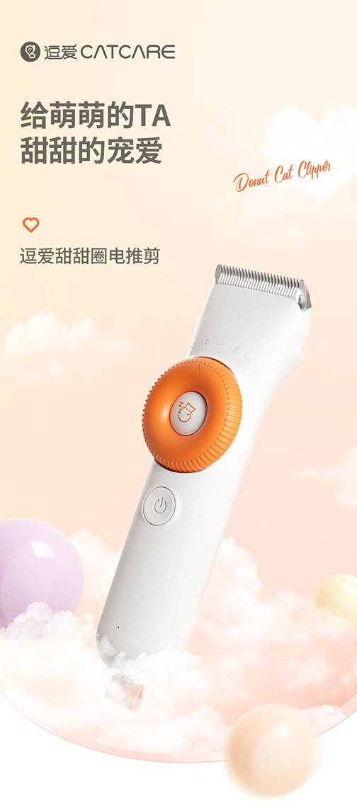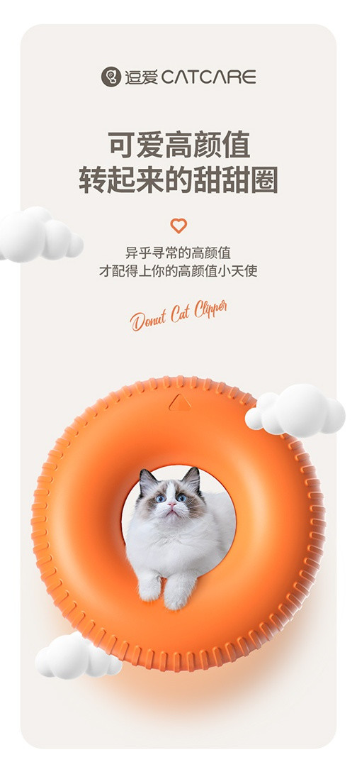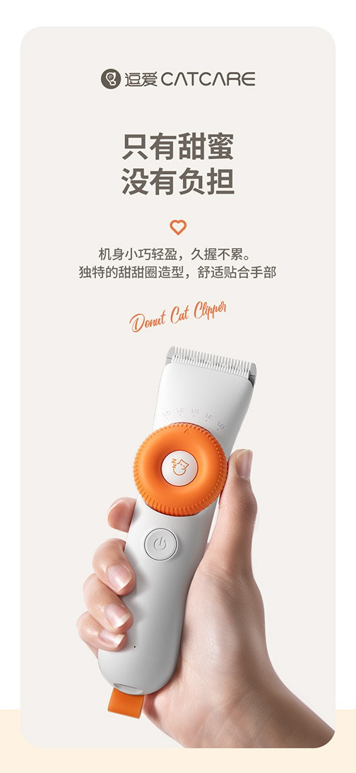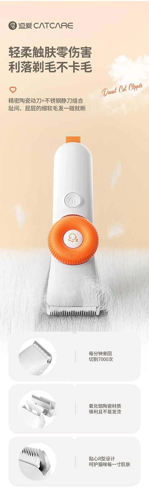 🍩 颜值出圈,握感超舒服 甜甜圈造型真的戳中少女心,圆润机身不硌手,小巧轻便,单手操作毫无压力 不管是给猫咪剃脚毛、修屁屁毛,还是打理腹底绒毛,姿势灵活不费劲,长时间用也不累手