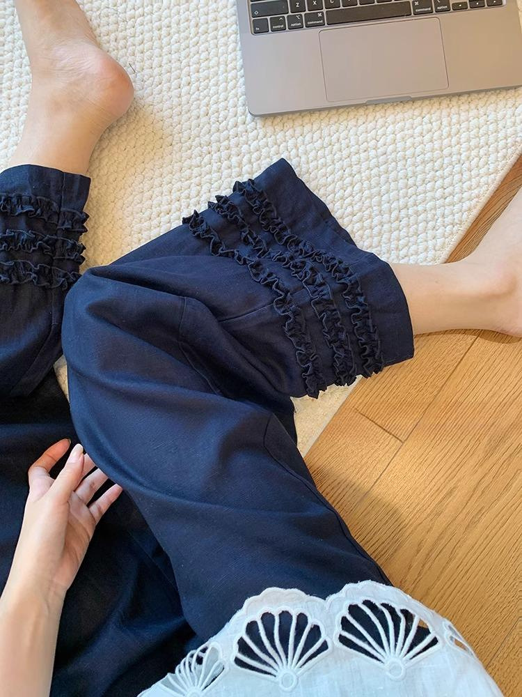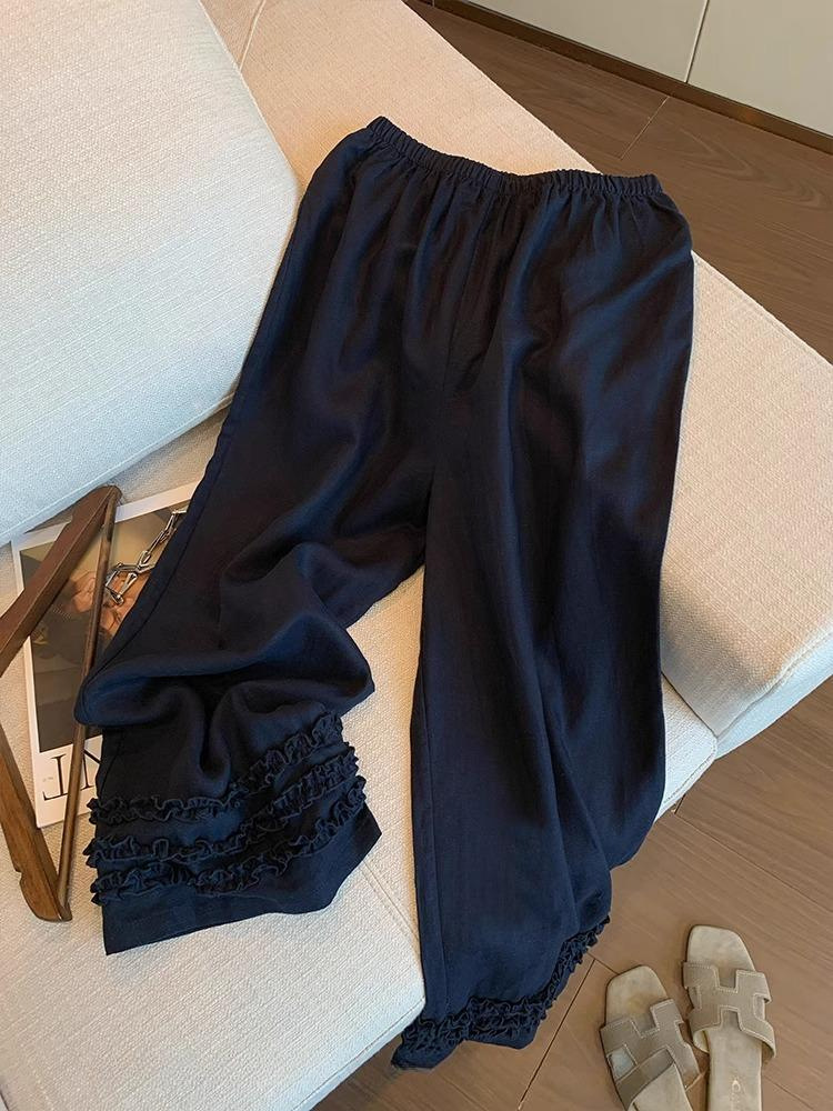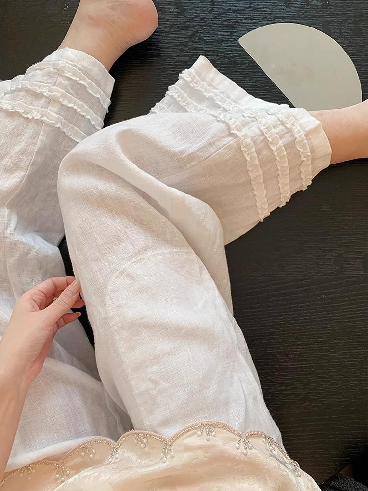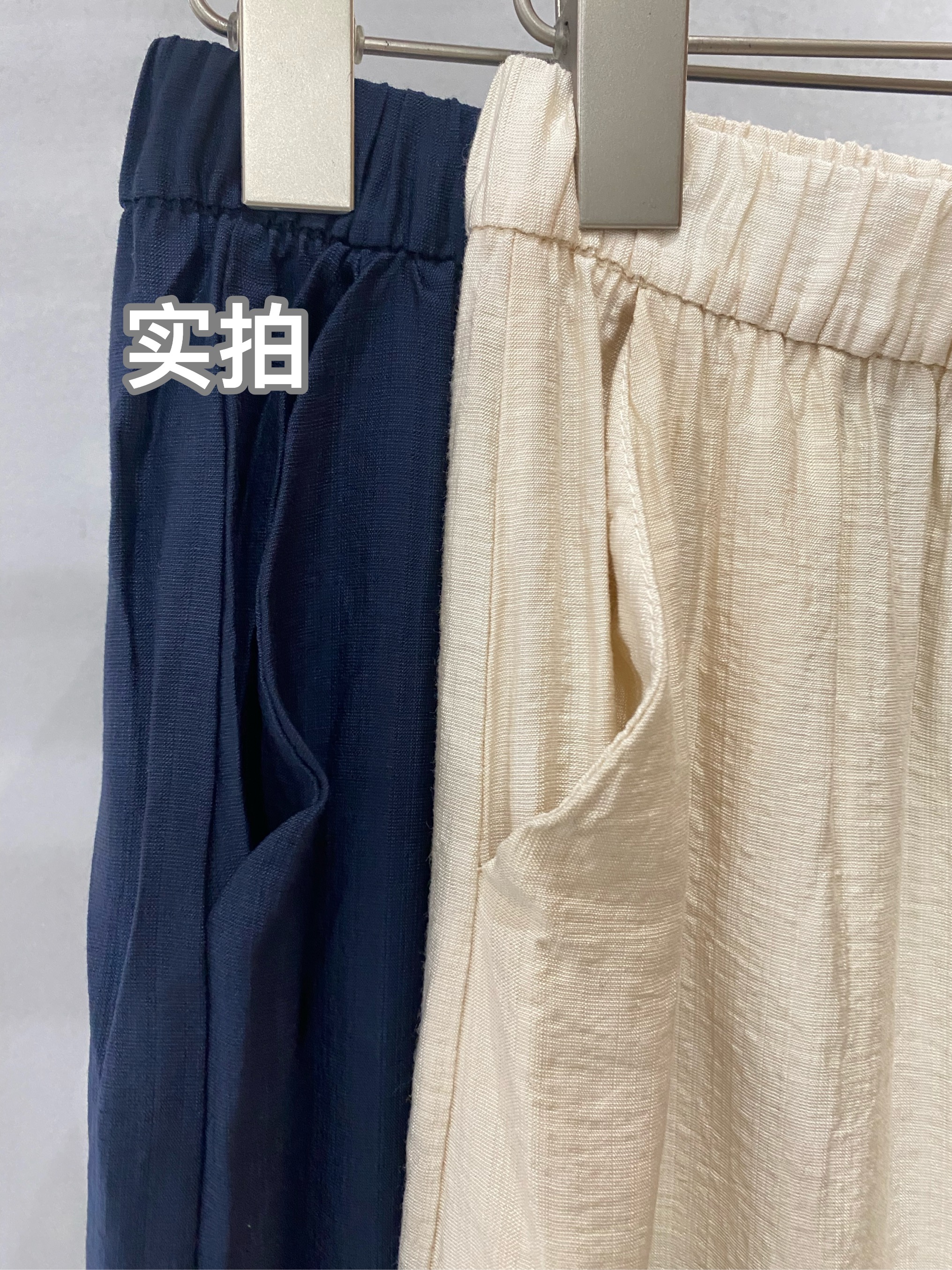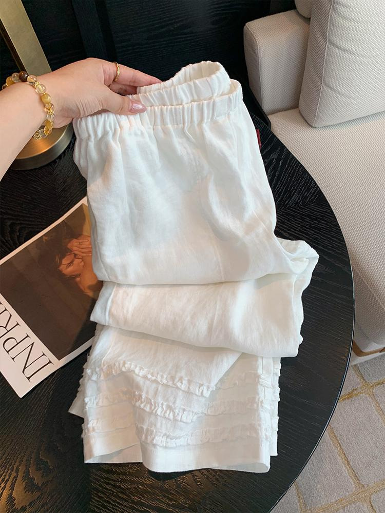 【YW】无忧购夏日松弛感木耳花边亚麻裤女梨形身材百搭松紧高腰阔腿九分休闲裤12568(截单后7天发货)