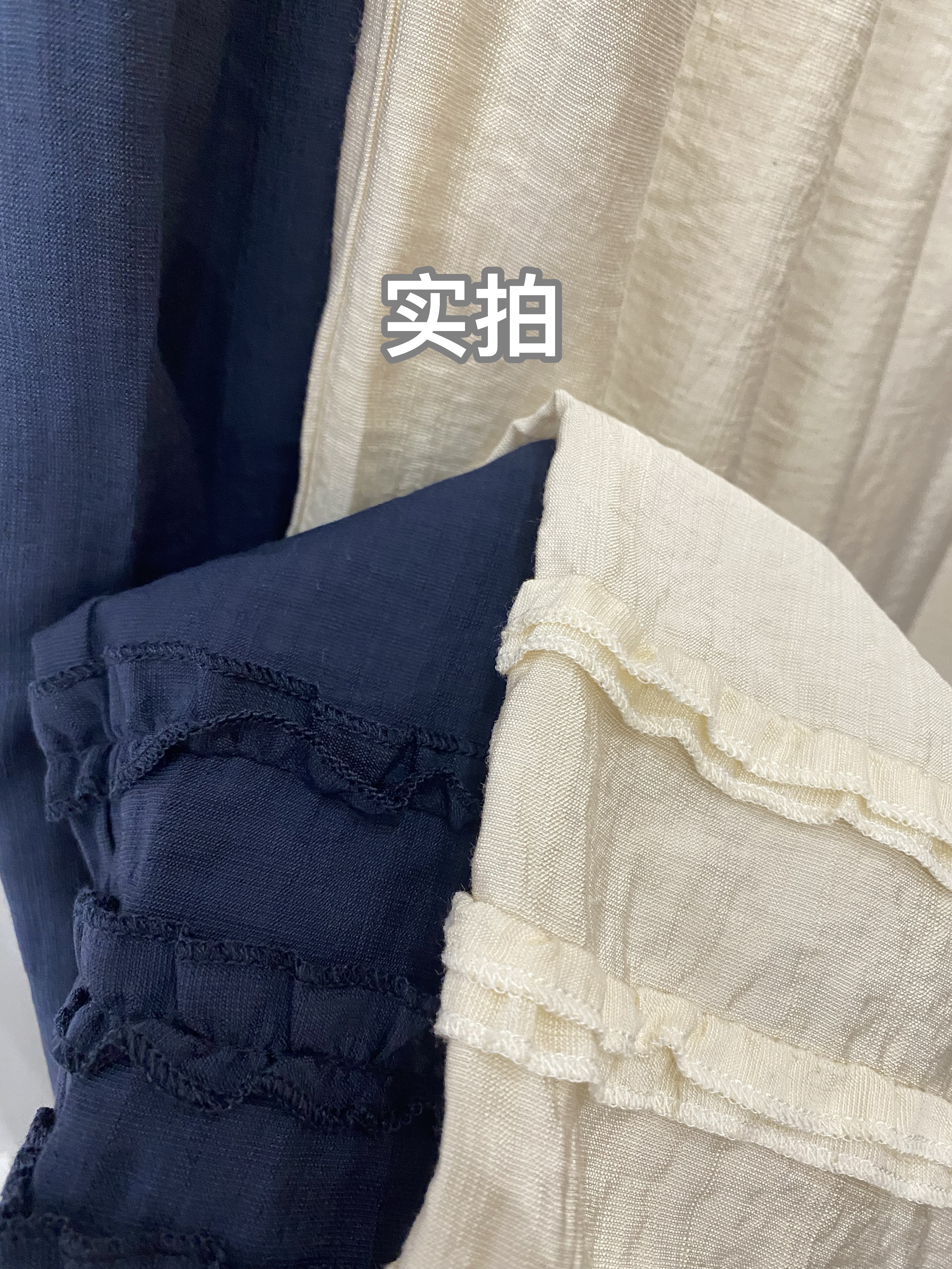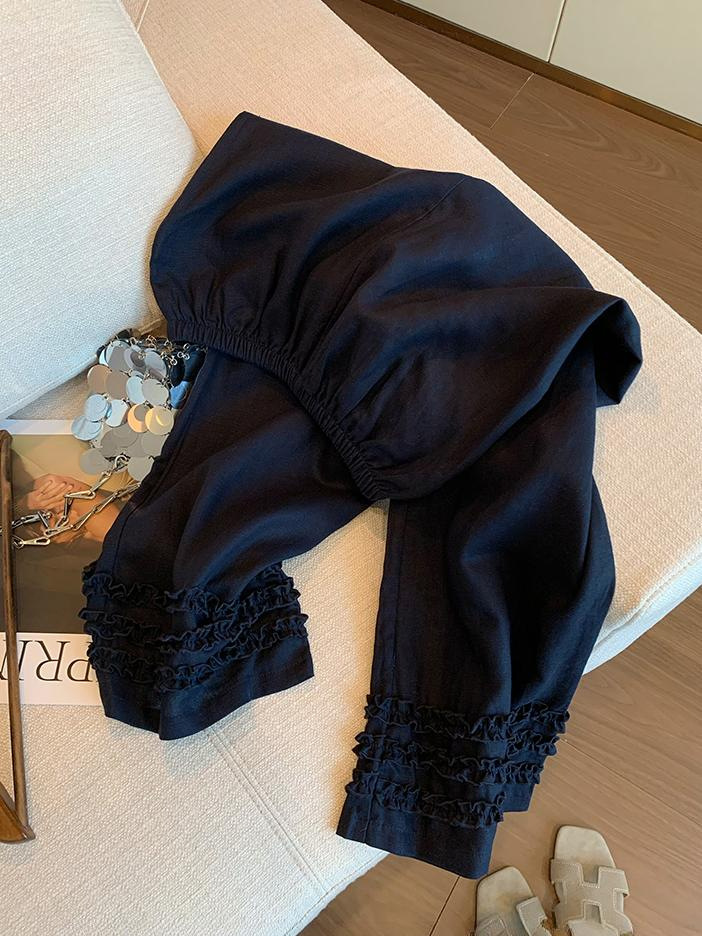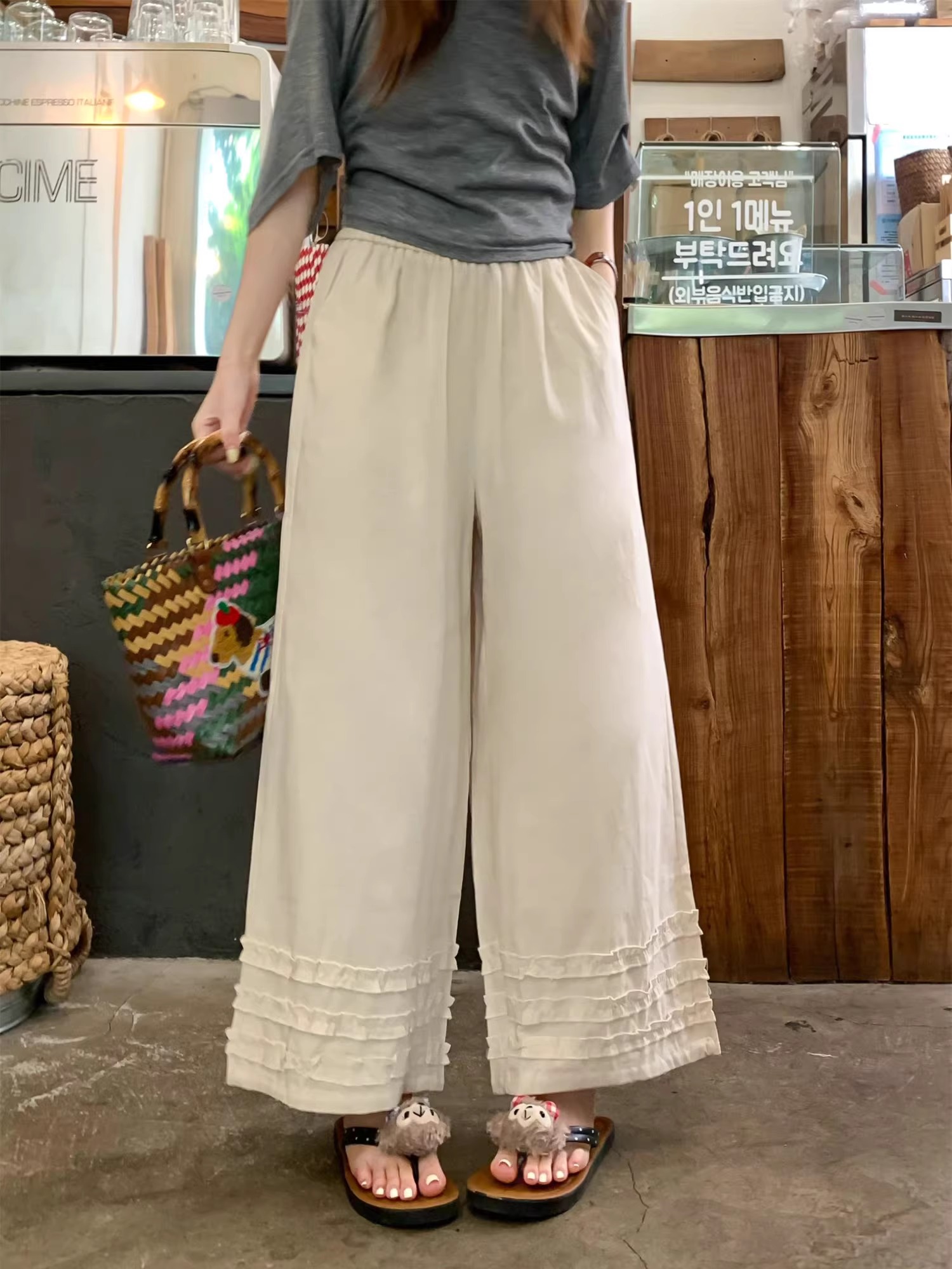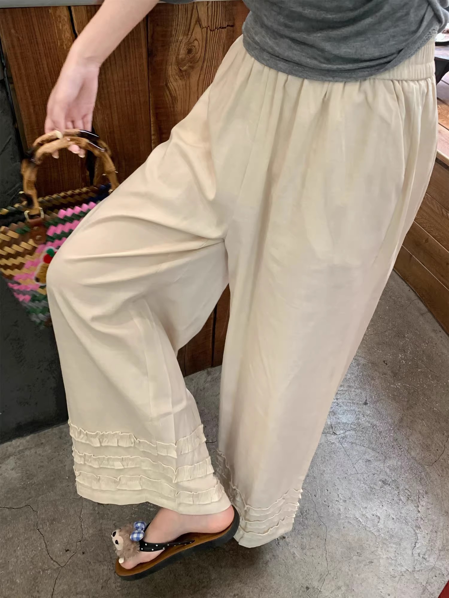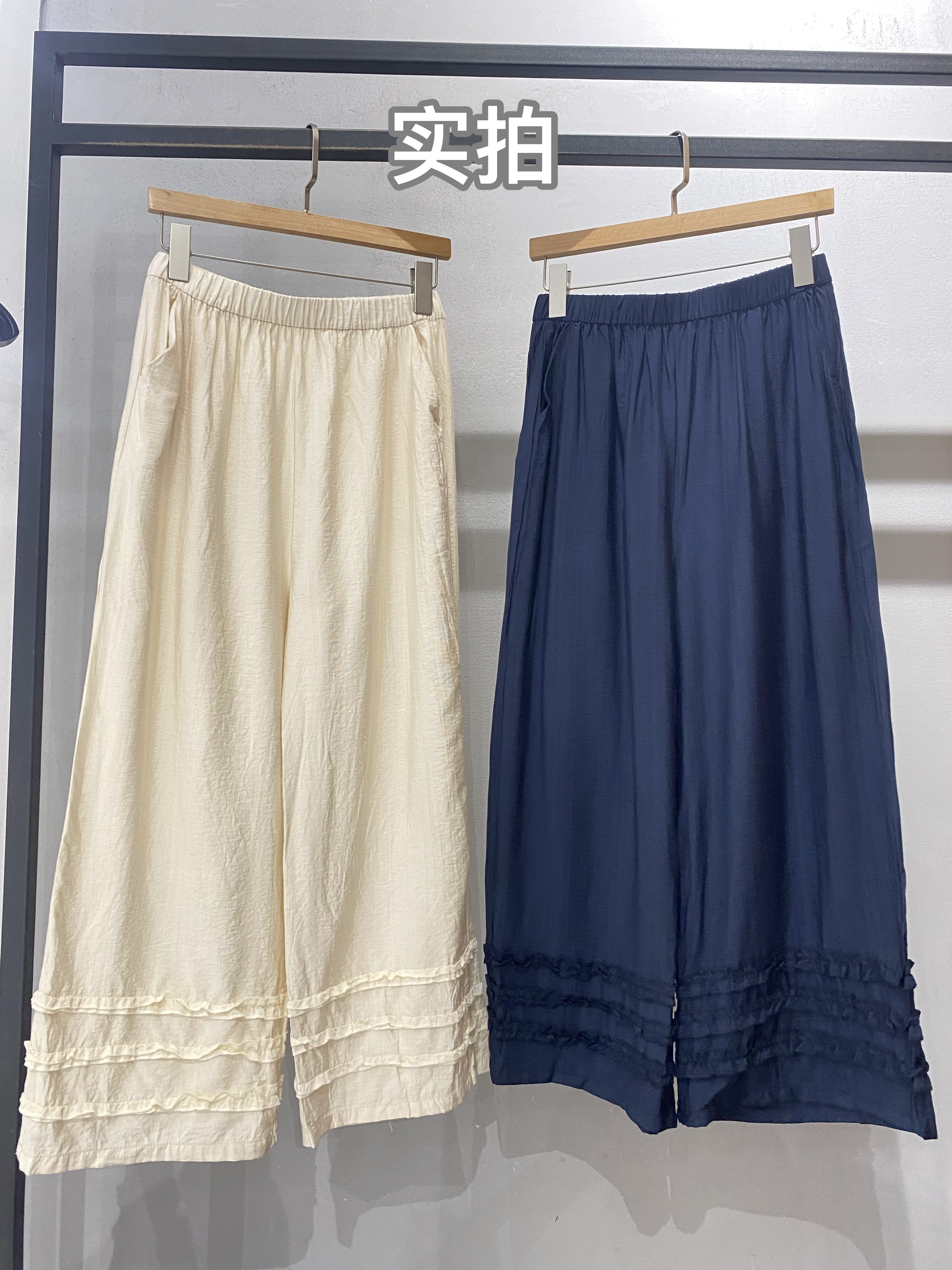 【YW】无忧购夏日松弛感木耳花边亚麻裤女梨形身材百搭松紧高腰阔腿九分休闲裤12568(截单后7天发货)
