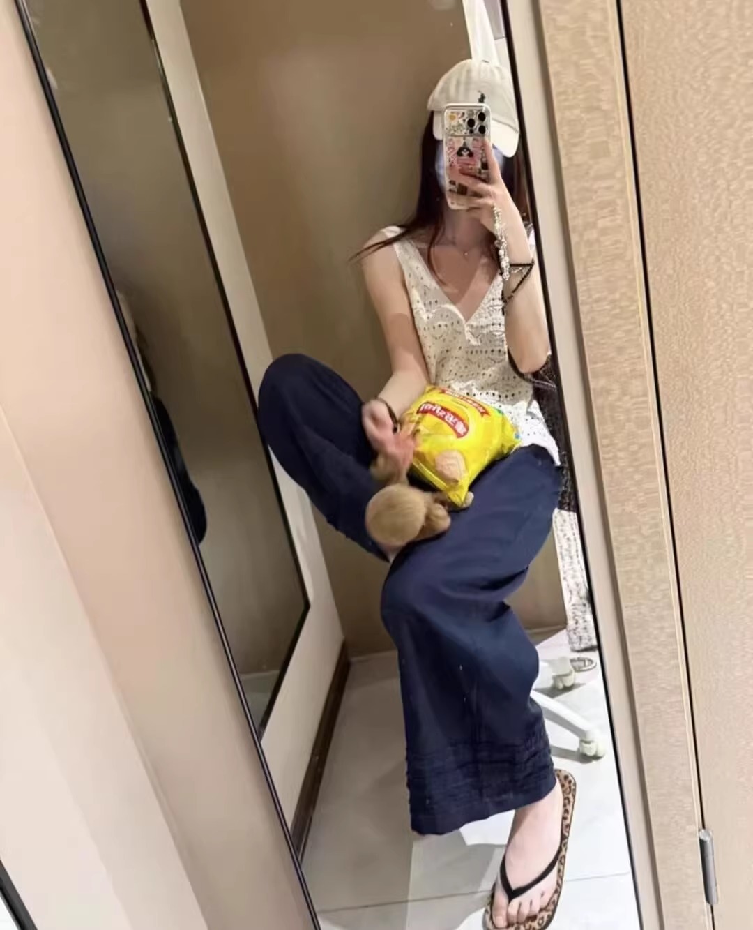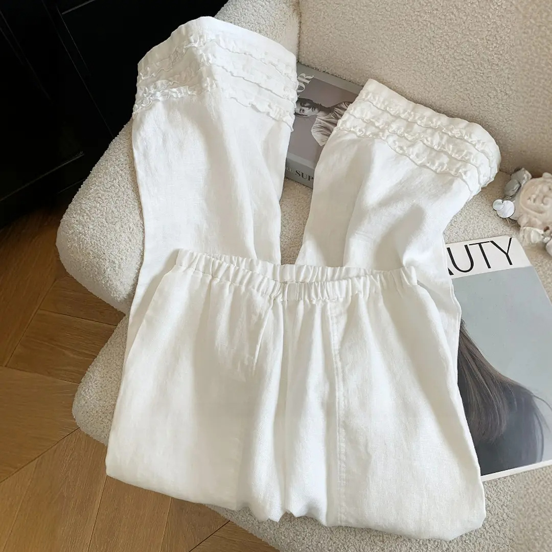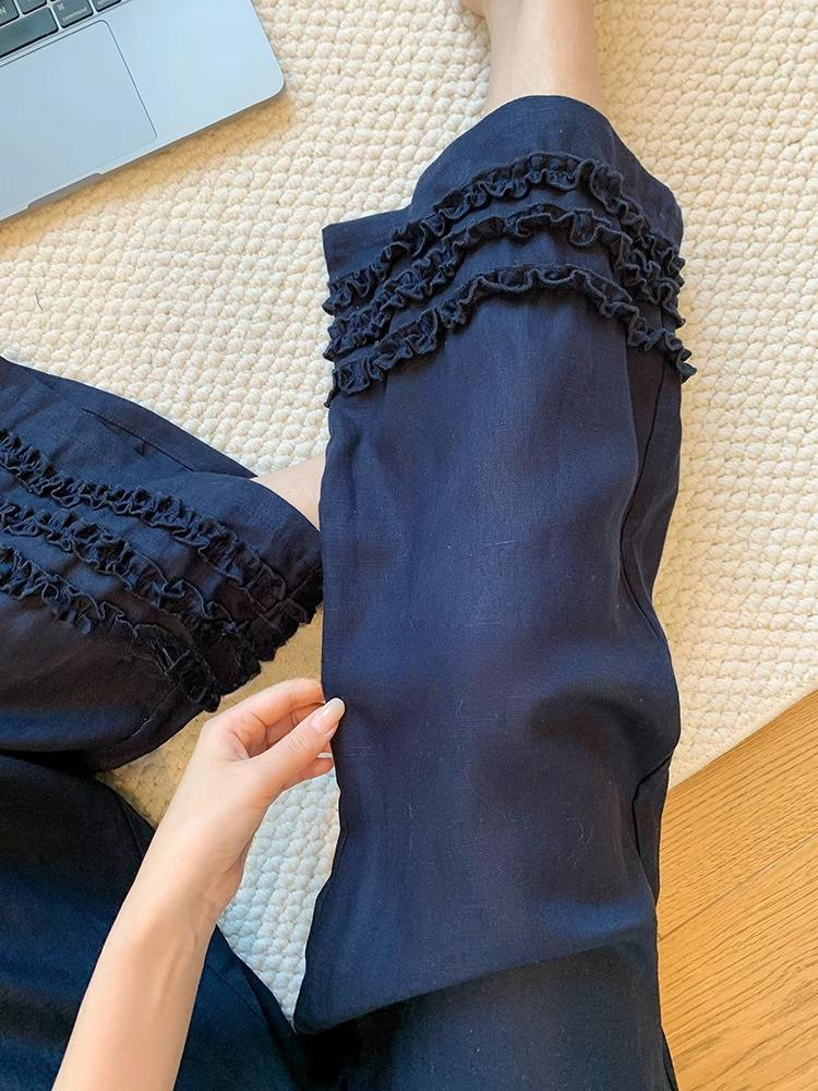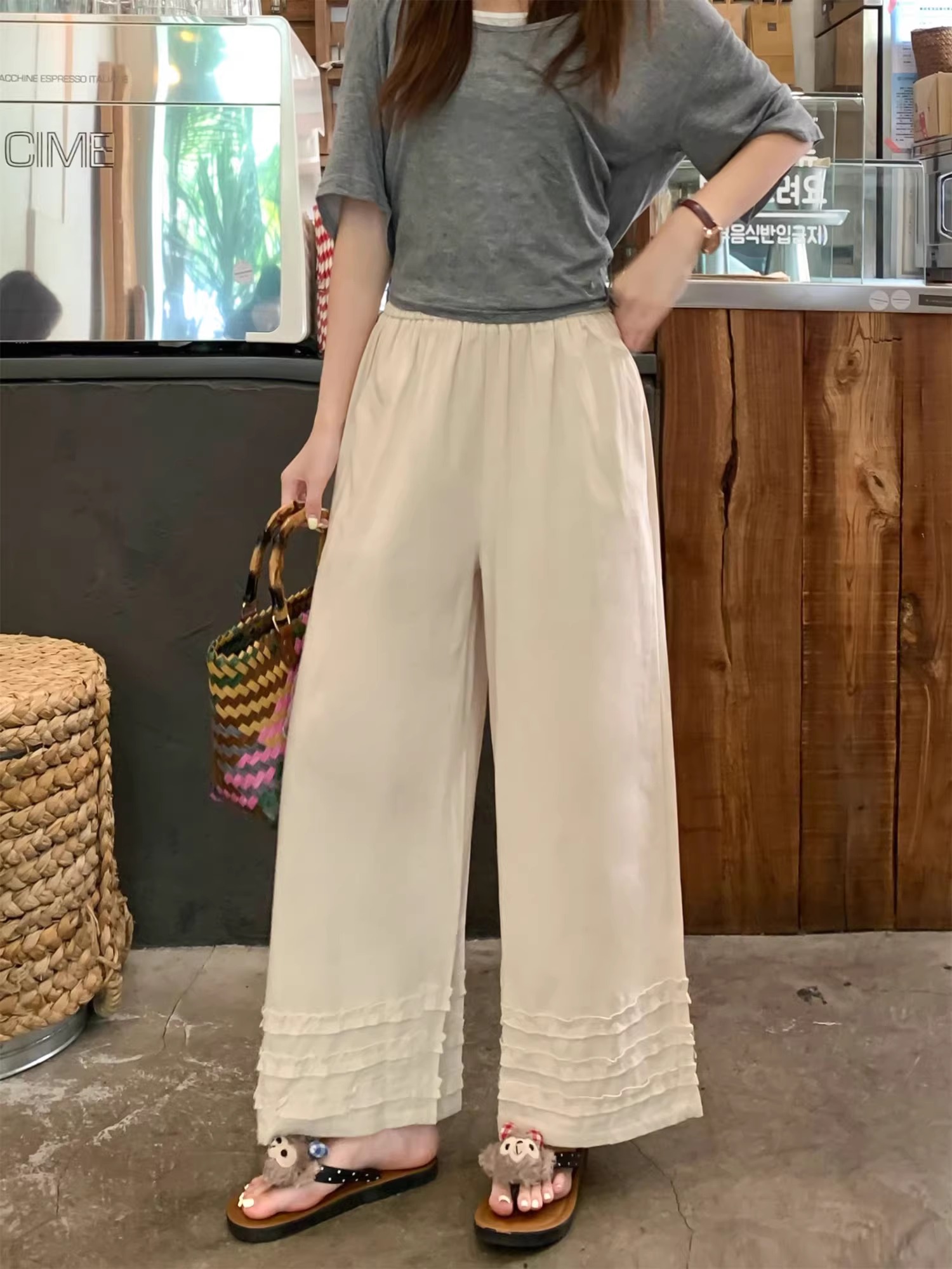【YW】无忧购夏日松弛感木耳花边亚麻裤女梨形身材百搭松紧高腰阔腿九分休闲裤12568(截单后7天发货)