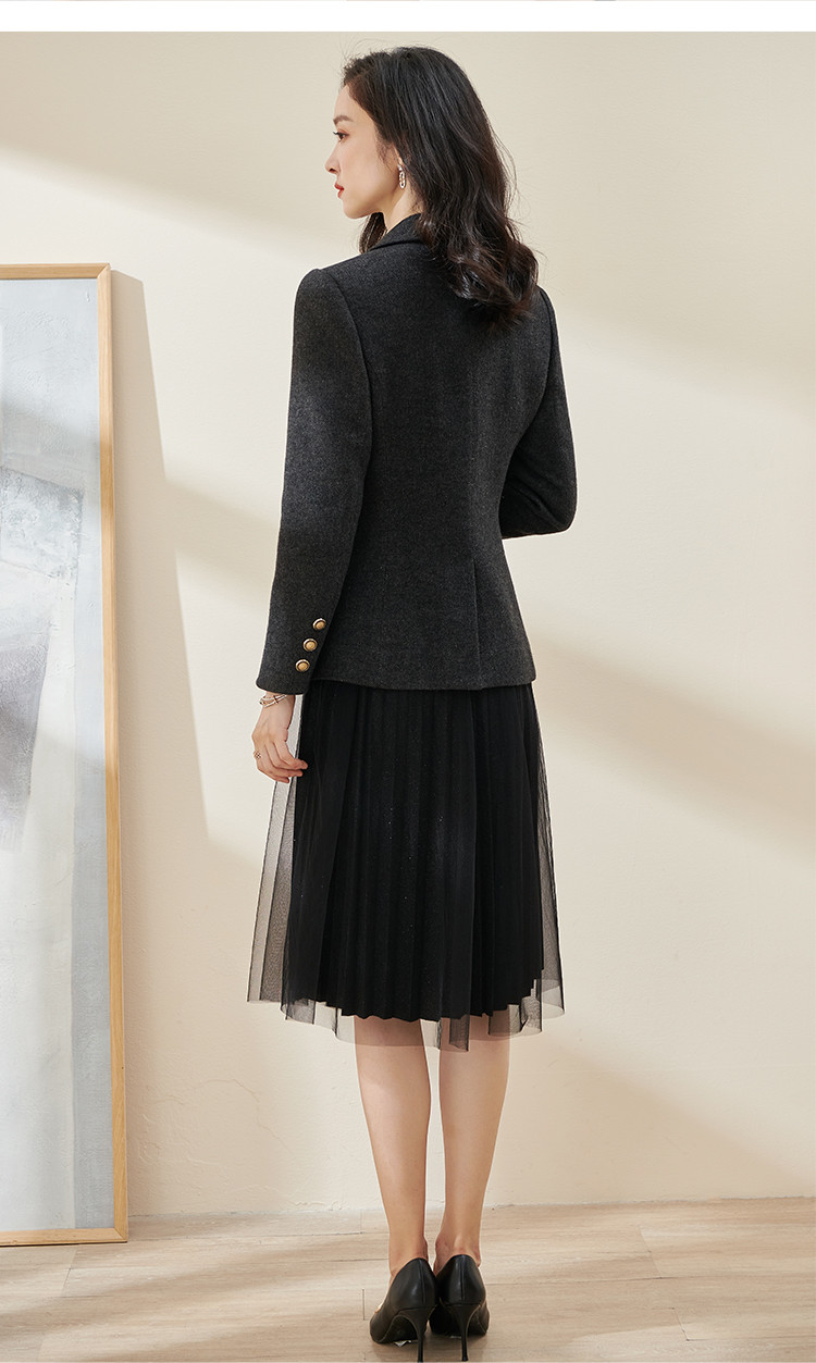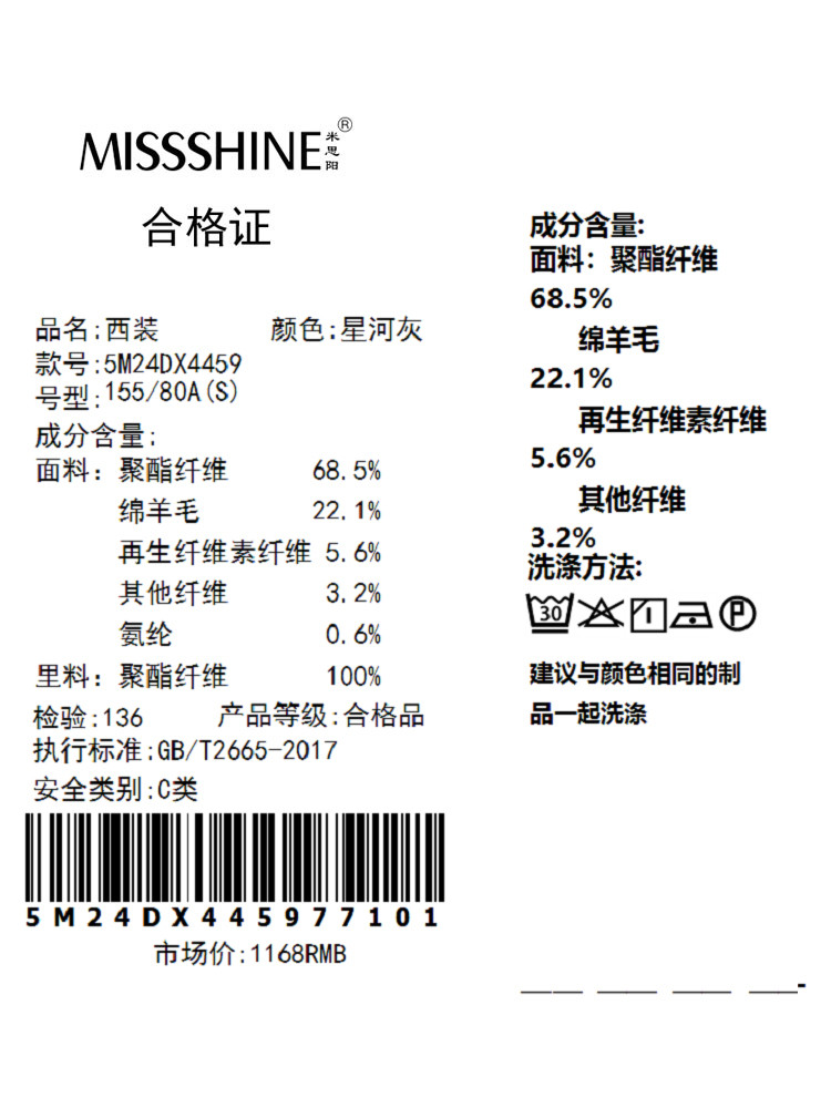 | 详细材质信息: | "面料:聚酯纤维 68.5% 绵羊毛 22.1% 再生纤维素纤维 5.6% 其他纤维 3.2% 氨纶 0.6% 里料:聚酯纤维 100%" |