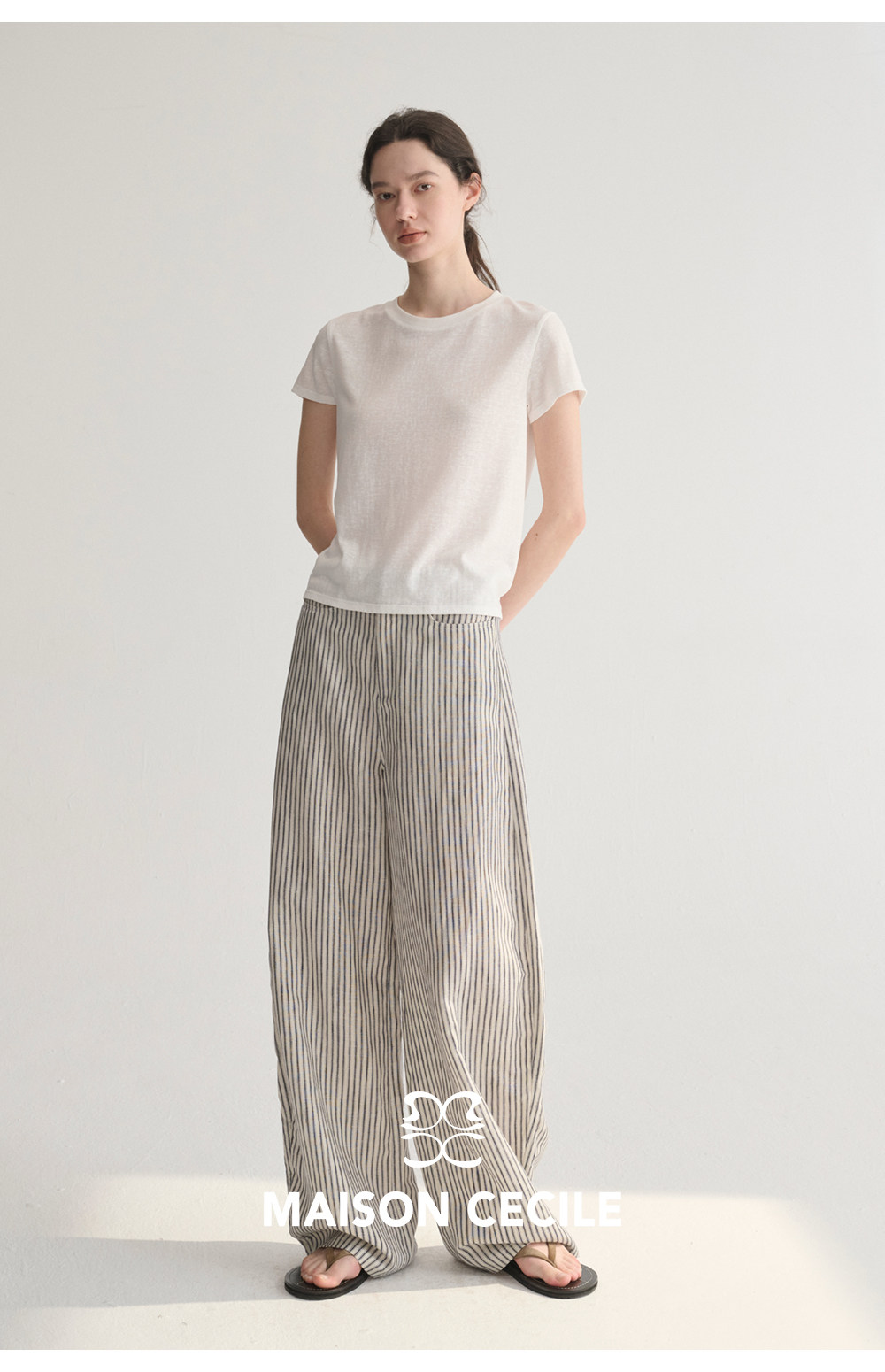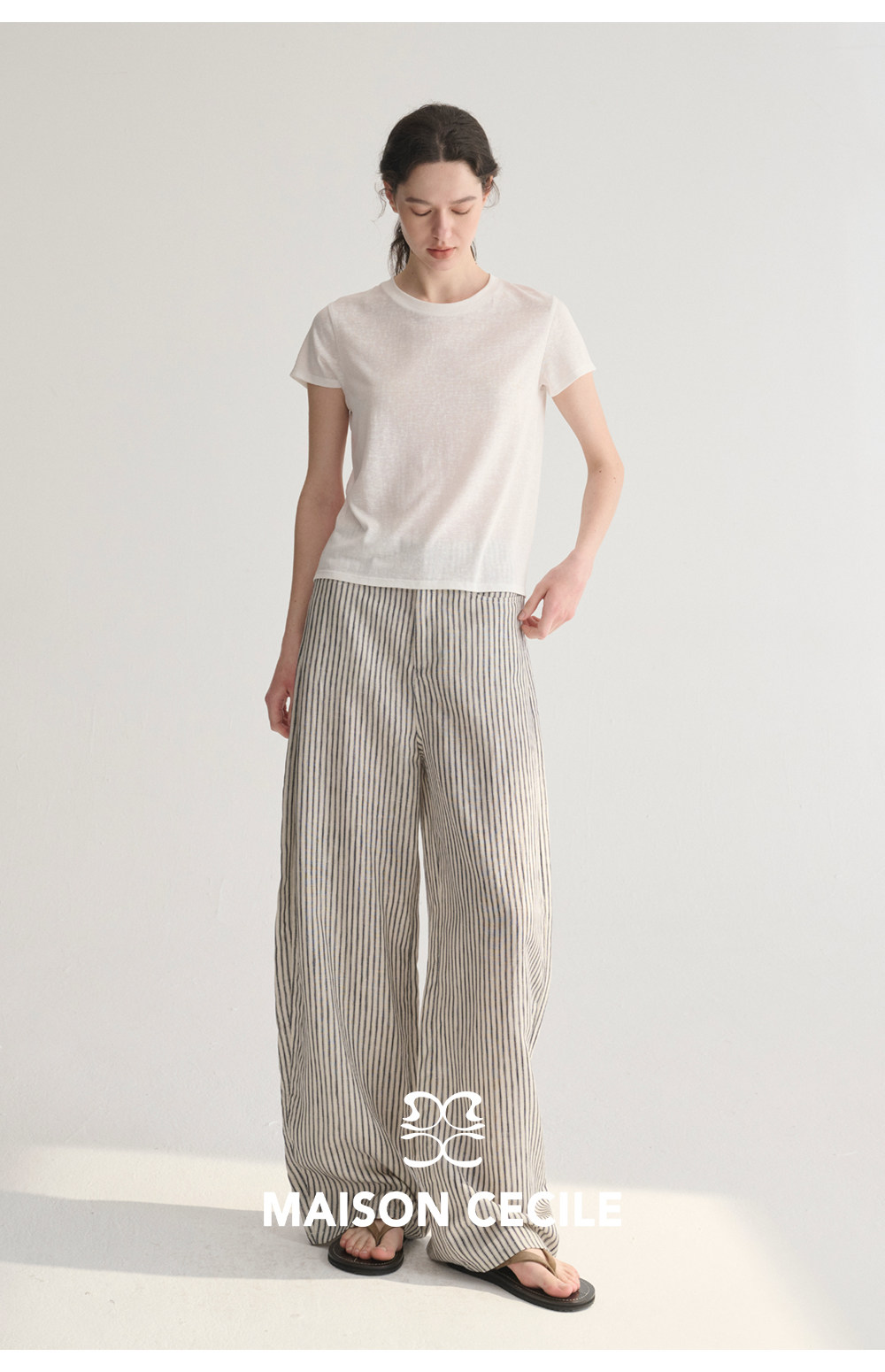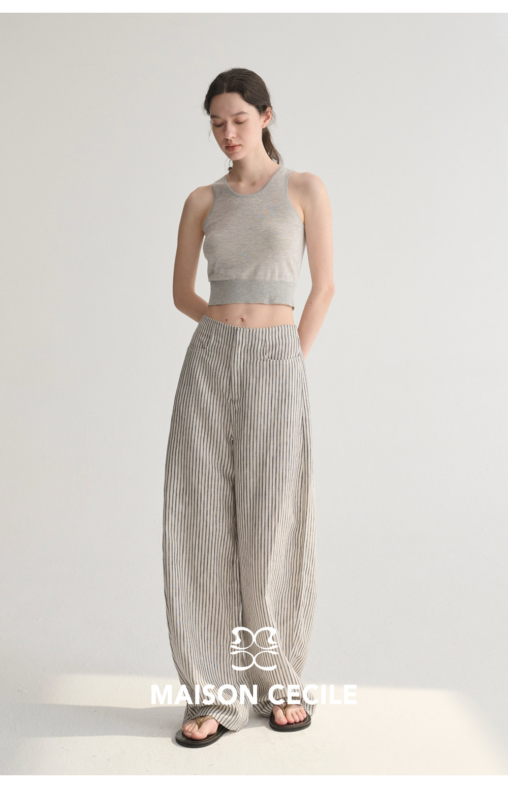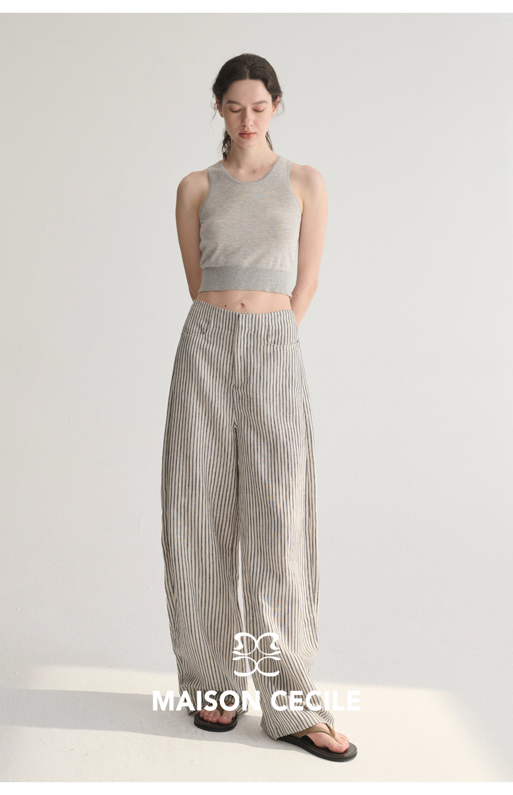 MC 莱赛尔亚麻舒适垂感条纹经典百搭休闲弧形镰刀裤MAISON CECILE