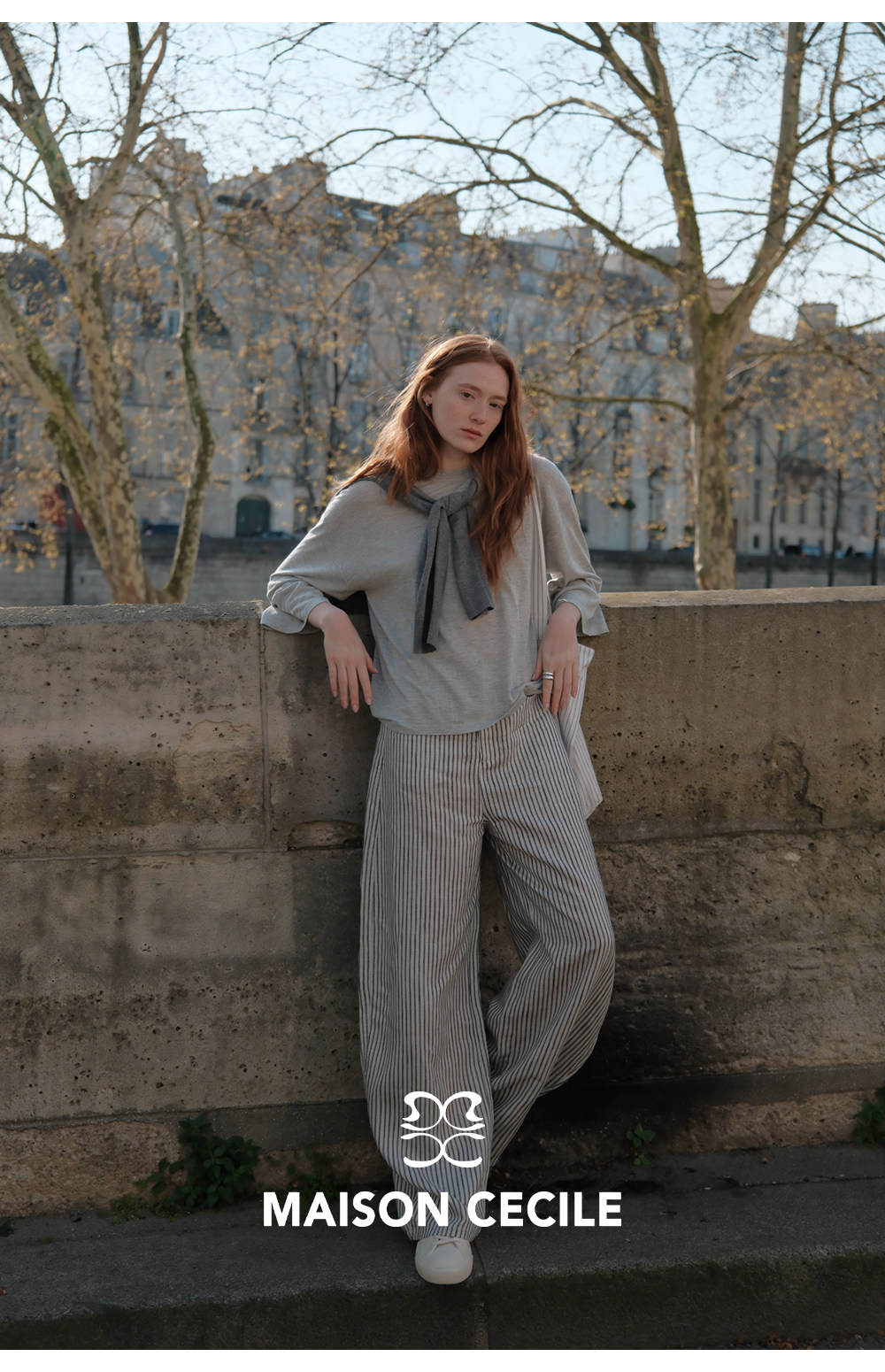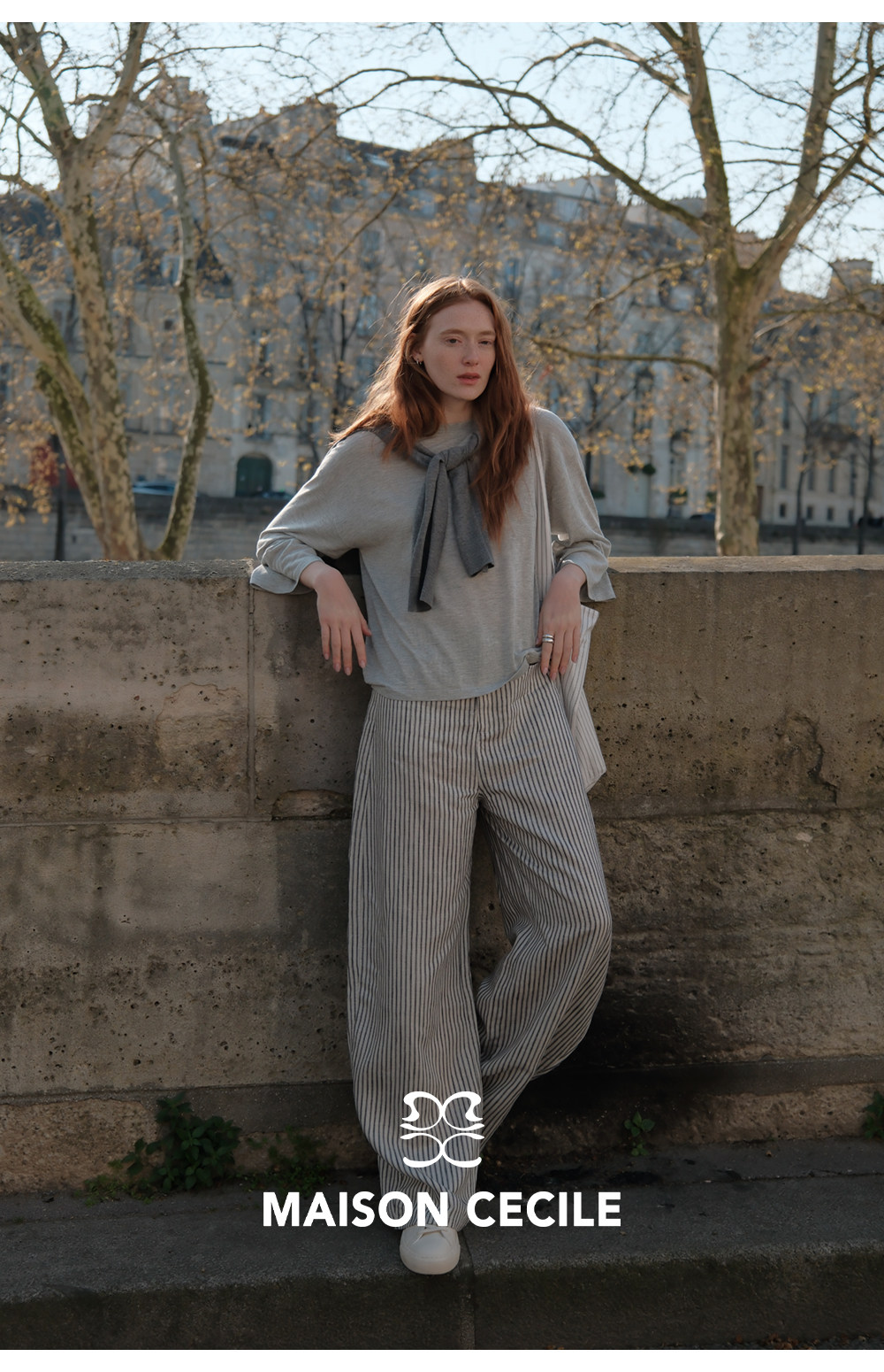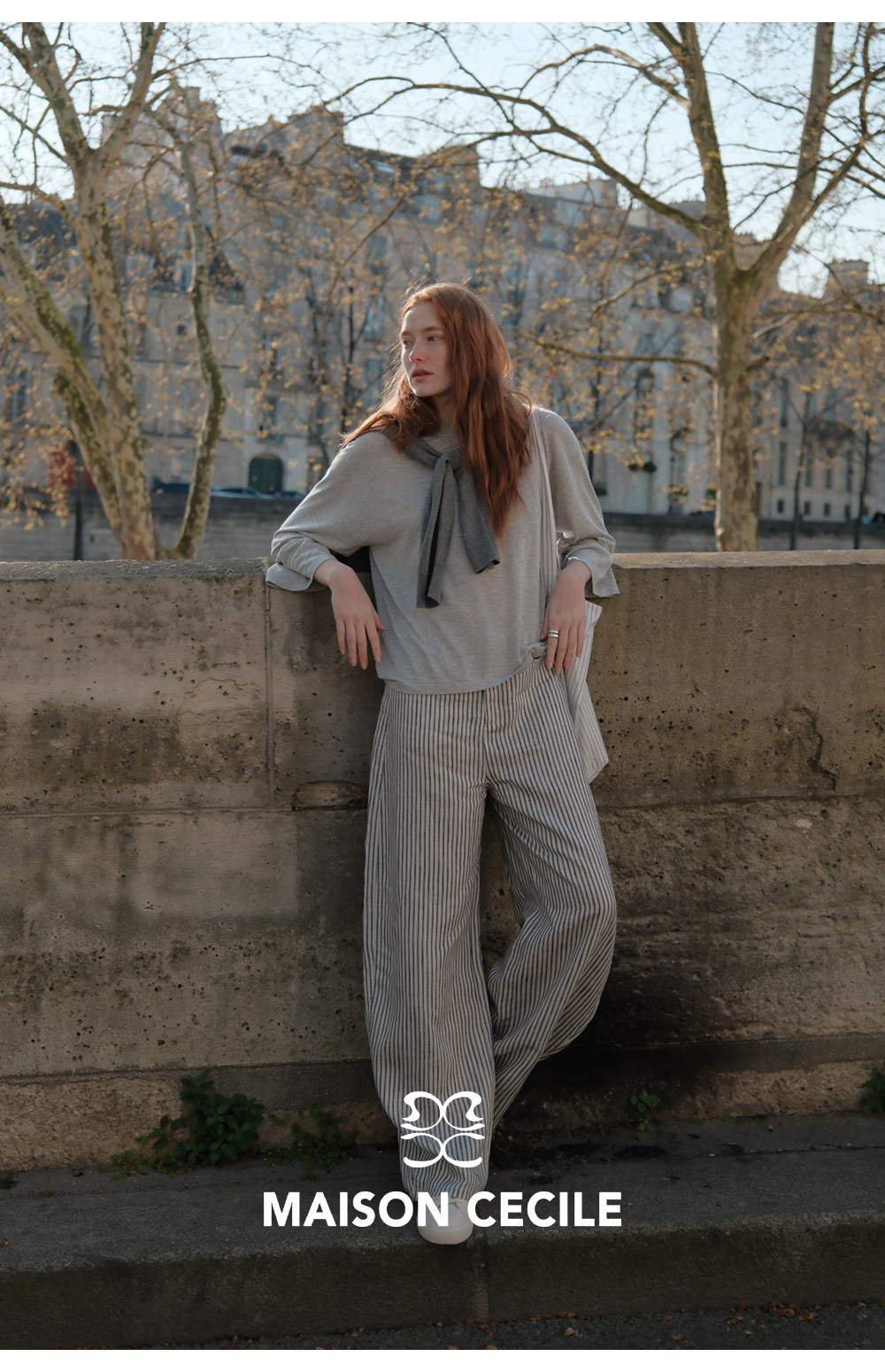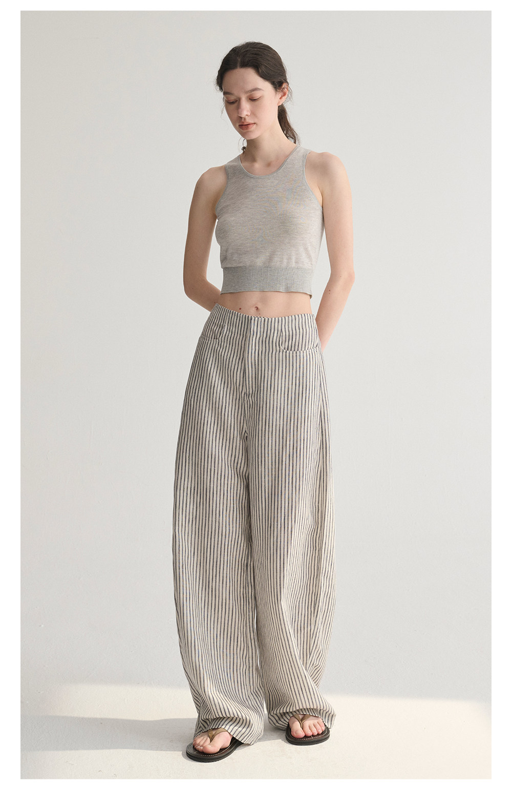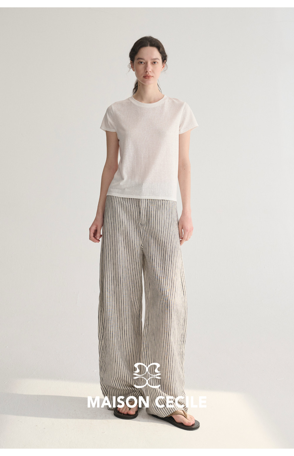 MC 莱赛尔亚麻舒适垂感条纹经典百搭休闲弧形镰刀裤MAISON CECILE