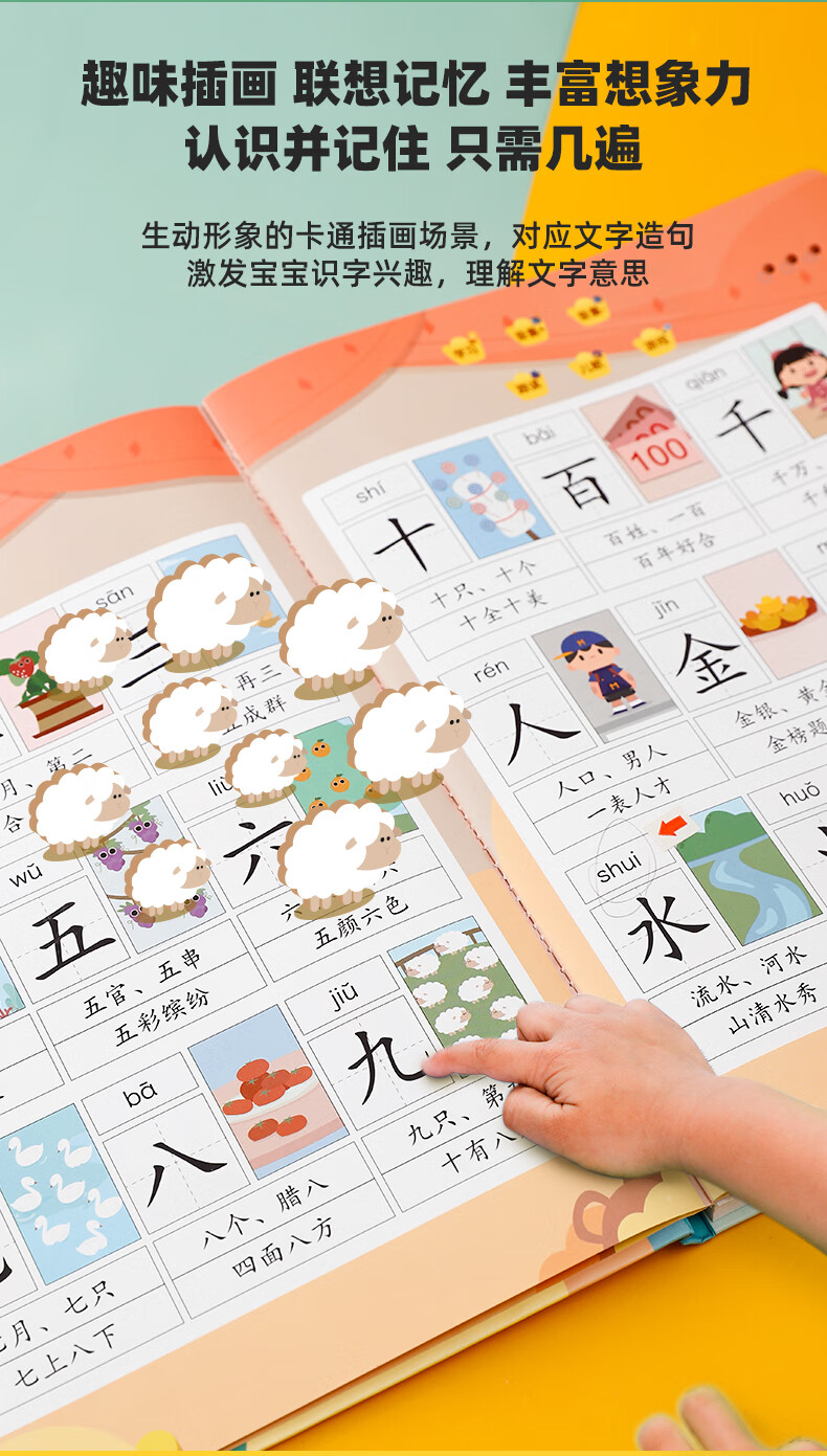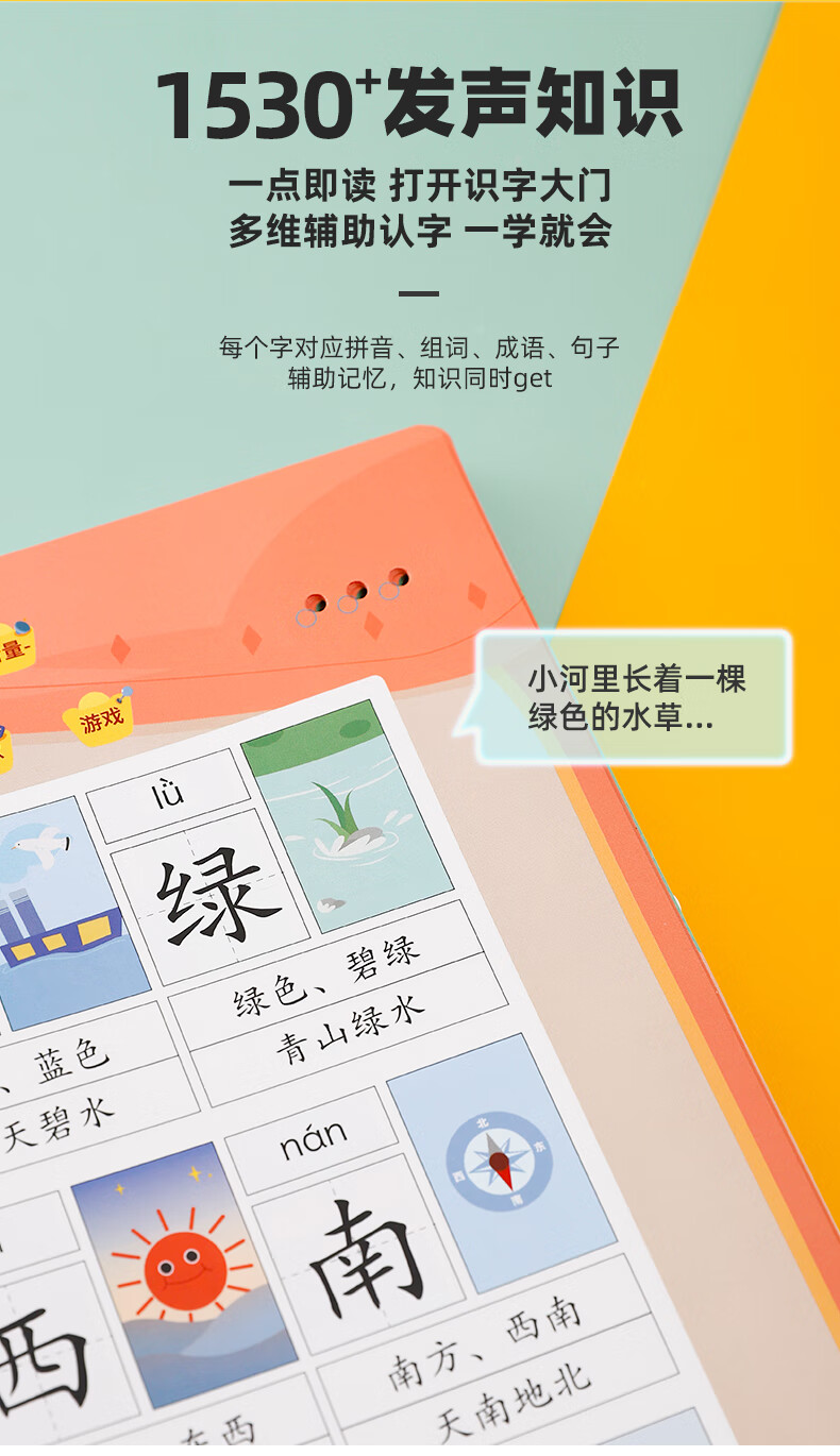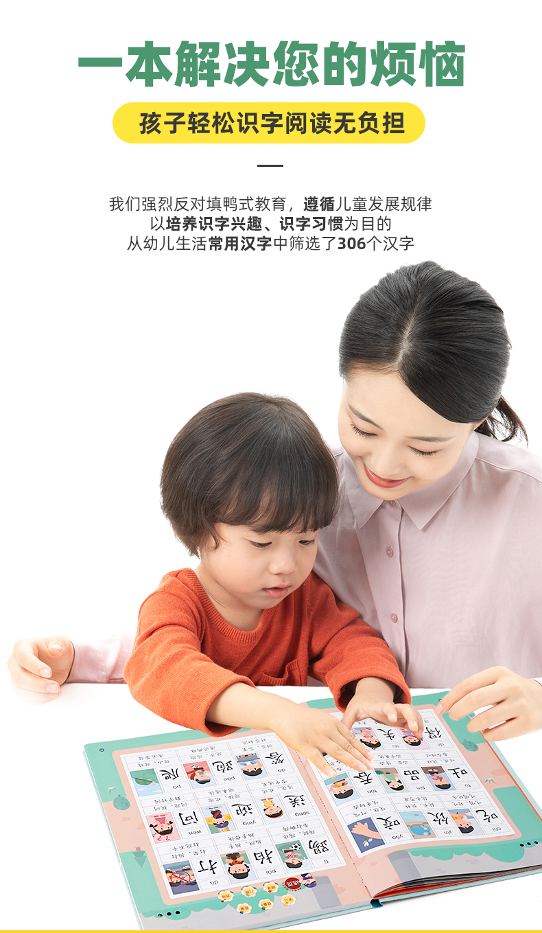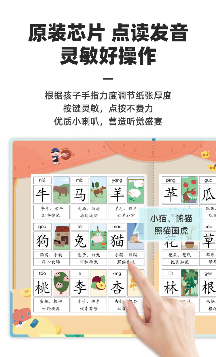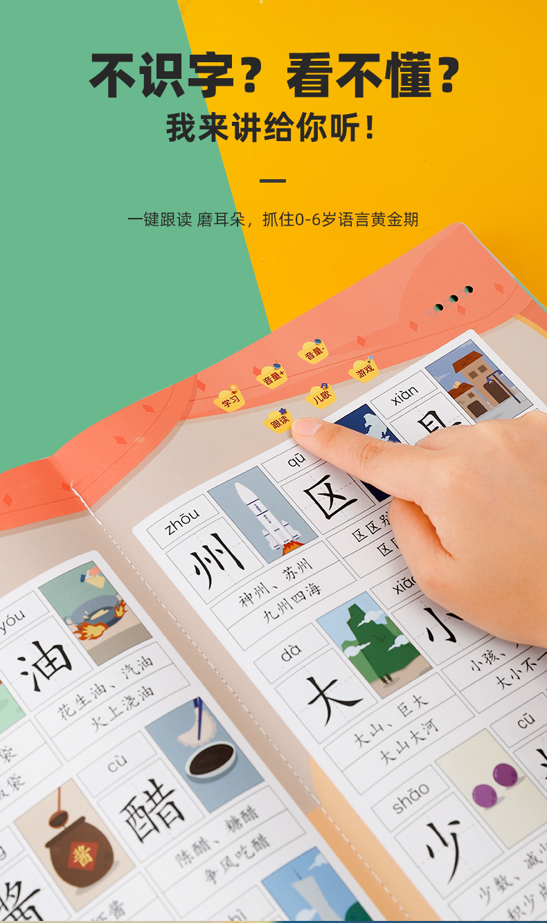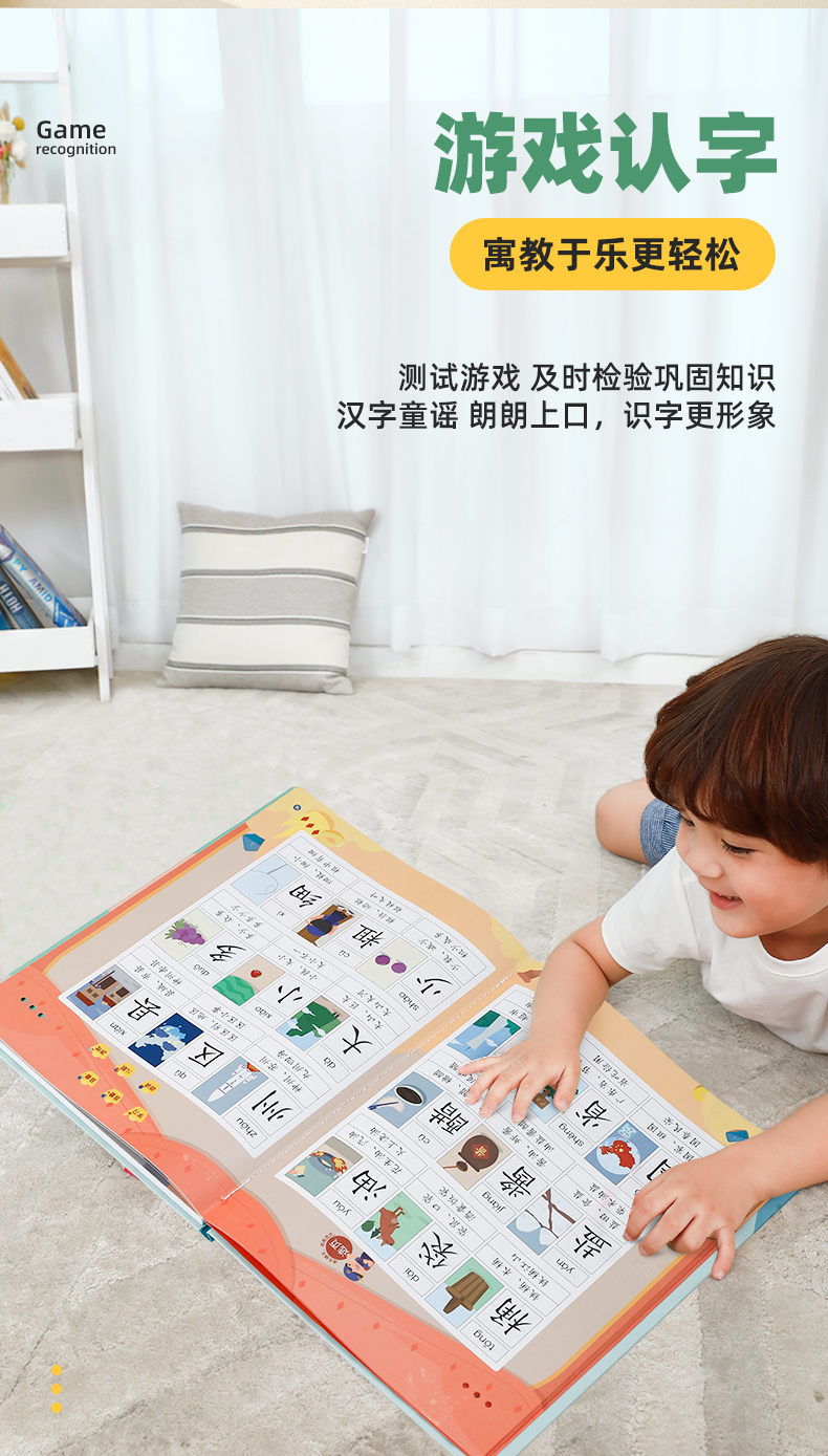 专为3-6岁儿童量身打造的有声识字绘本书,趣味卡通插画,真人标准发声伴读,人声互动激励,多维辅助认字,巩固学习,强化认知。