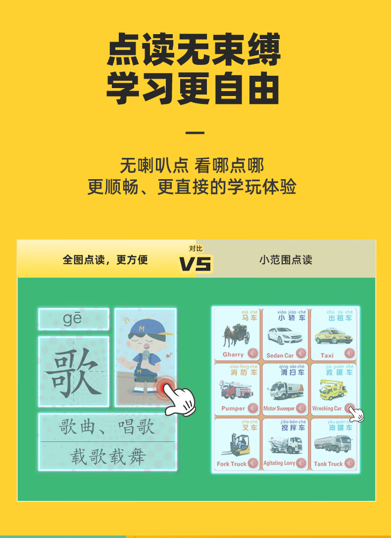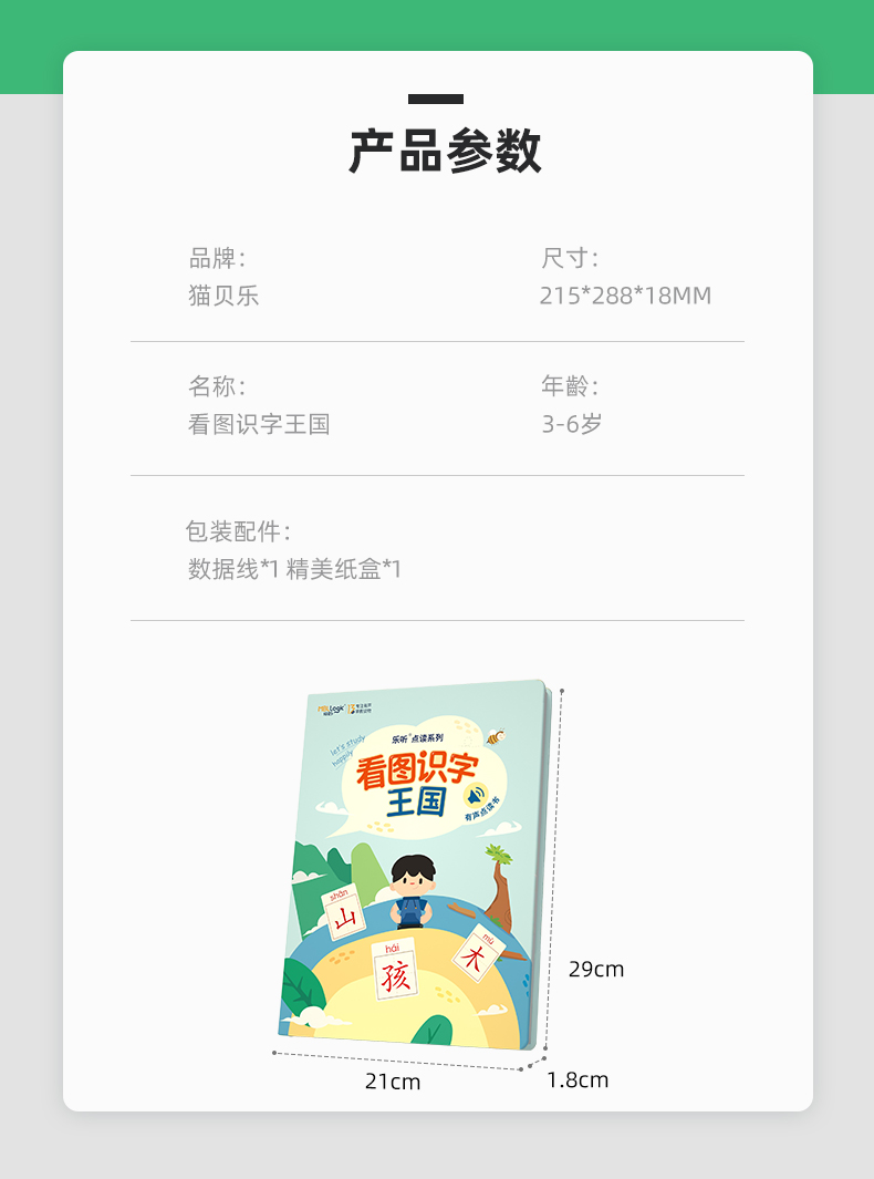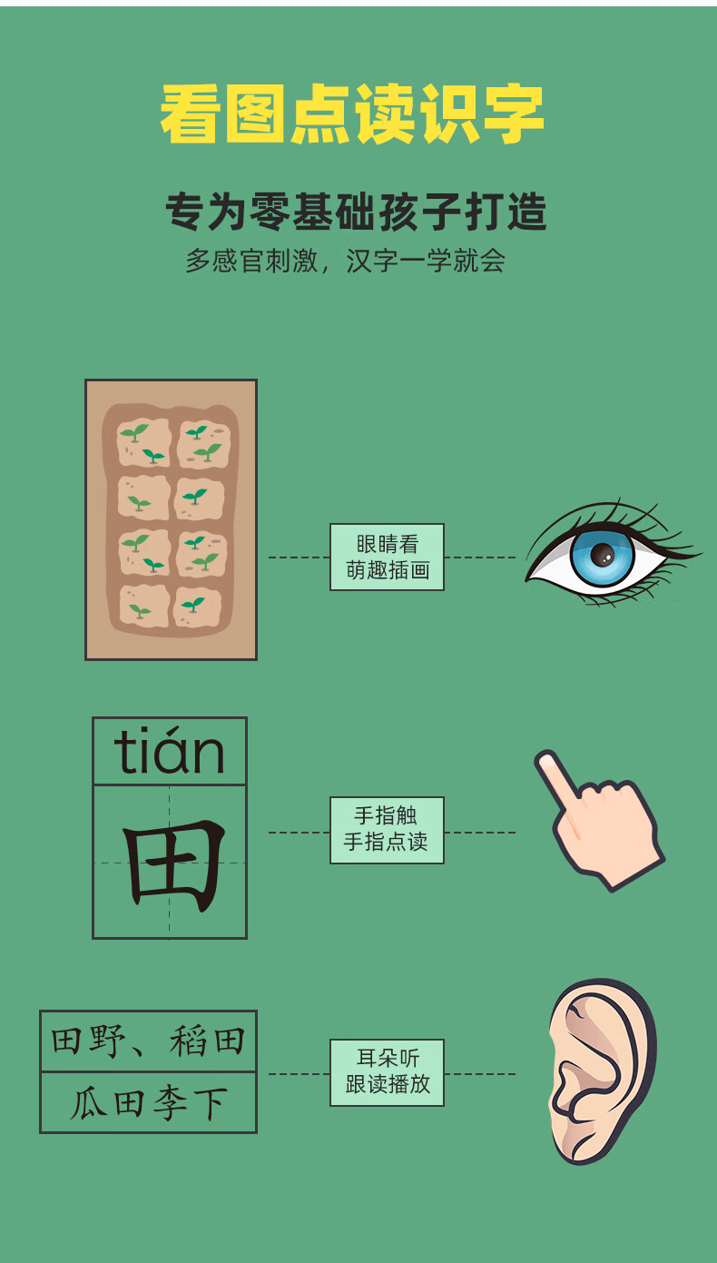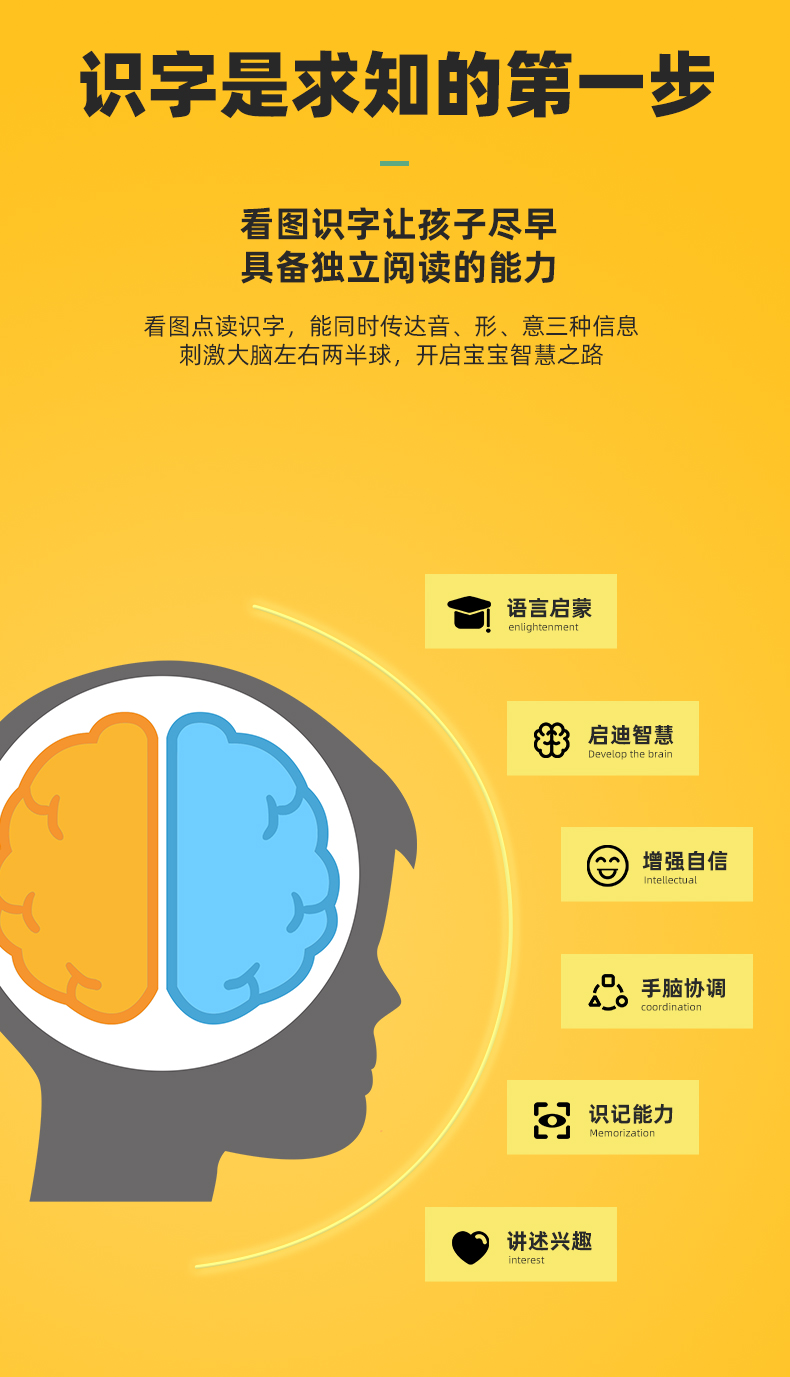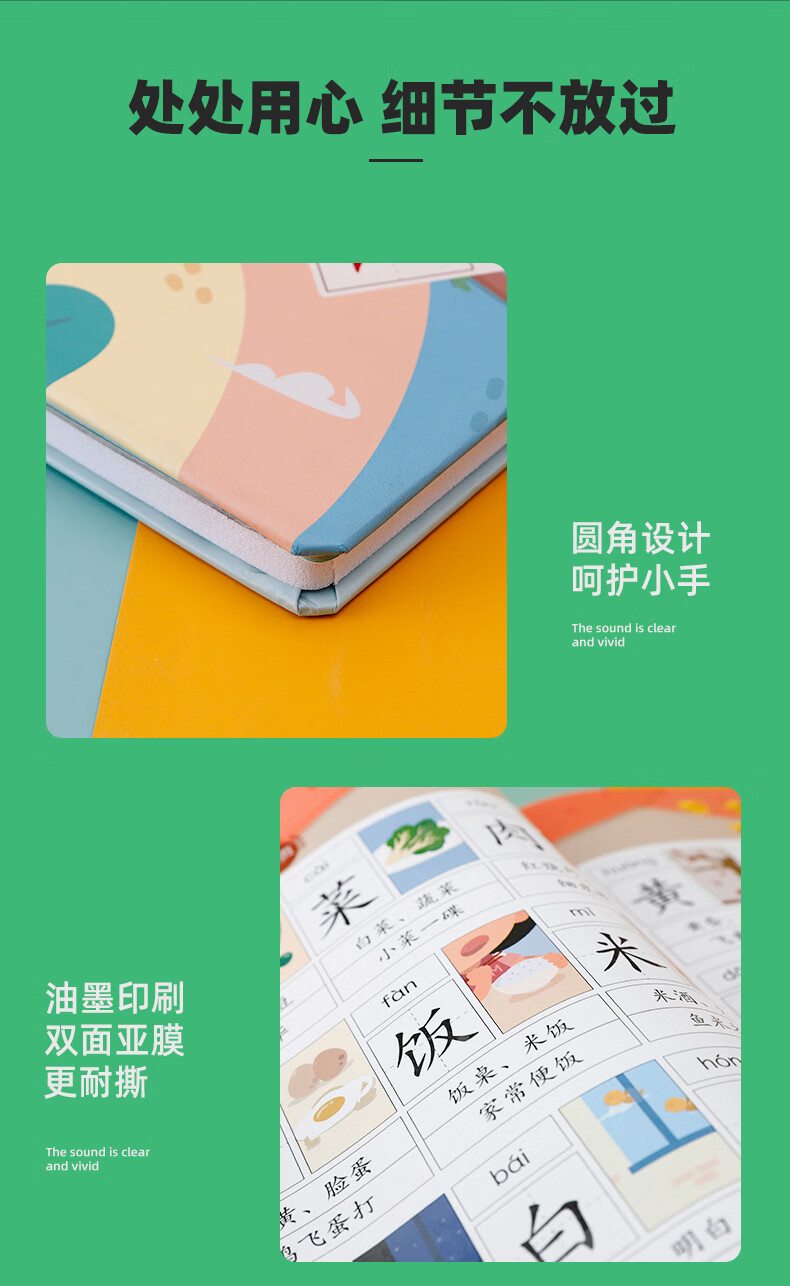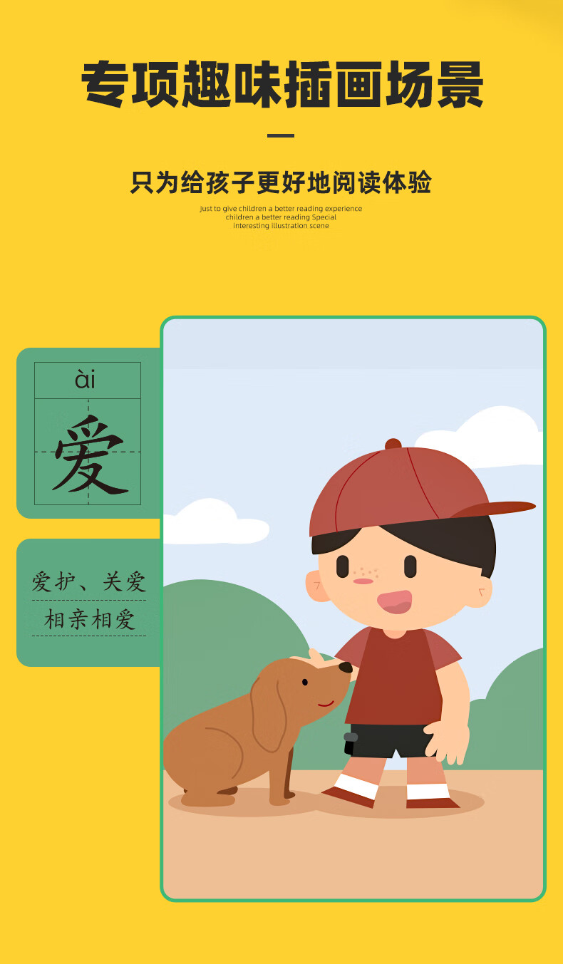 专为3-6岁儿童量身打造的有声识字绘本书,趣味卡通插画,真人标准发声伴读,人声互动激励,多维辅助认字,巩固学习,强化认知。