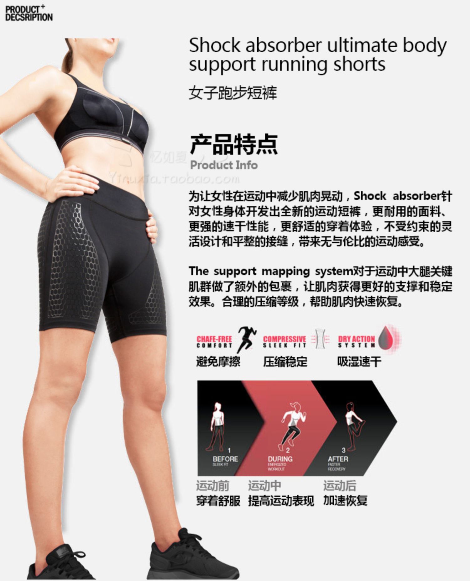 shock absorber女子跑步五分裤中裤压缩裤速干紧身裤运动短裤