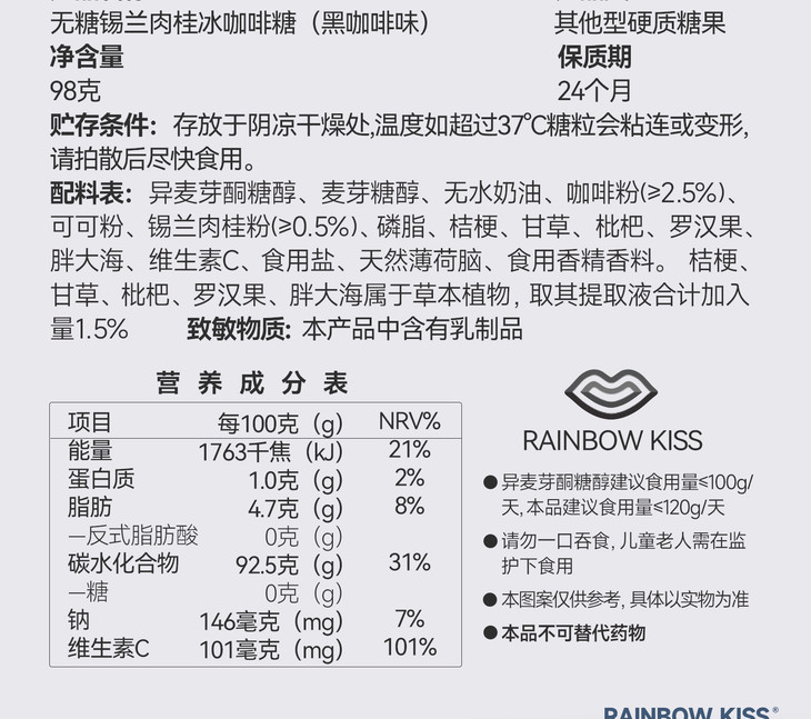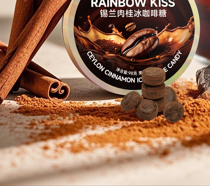 【润喉清凉】红谷林rainbow kiss锡兰肉桂冰咖啡糖 VC润喉硬糖加班开车清凉醇香硬糖 开盖即食 98g/盒