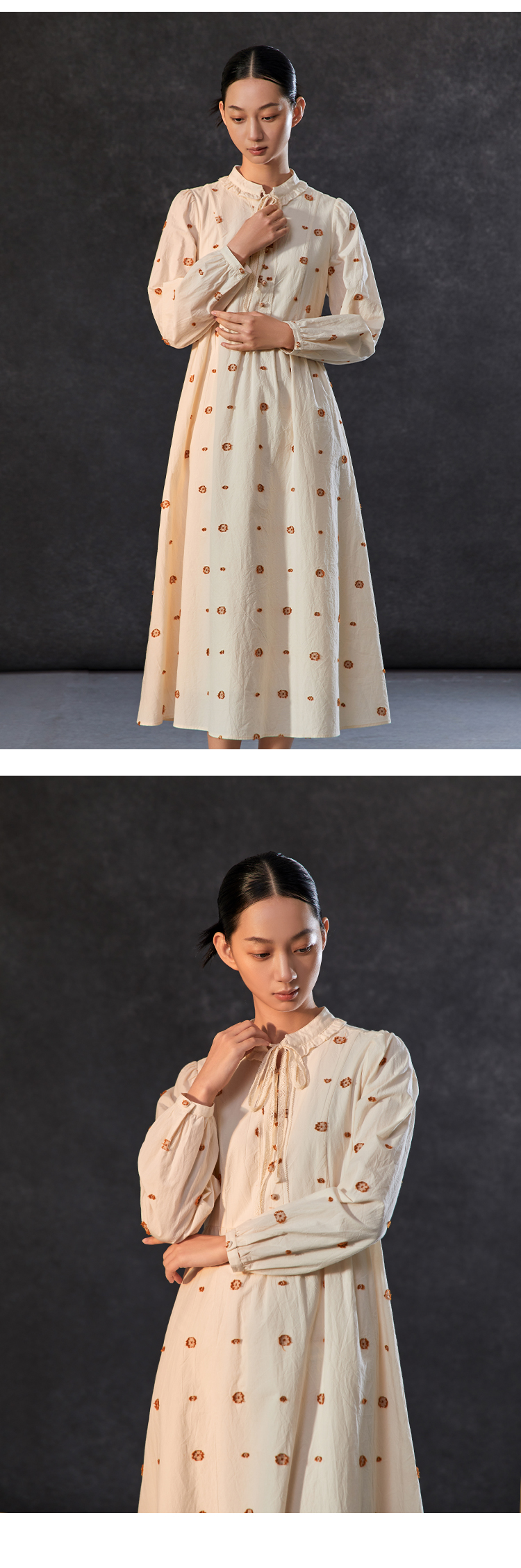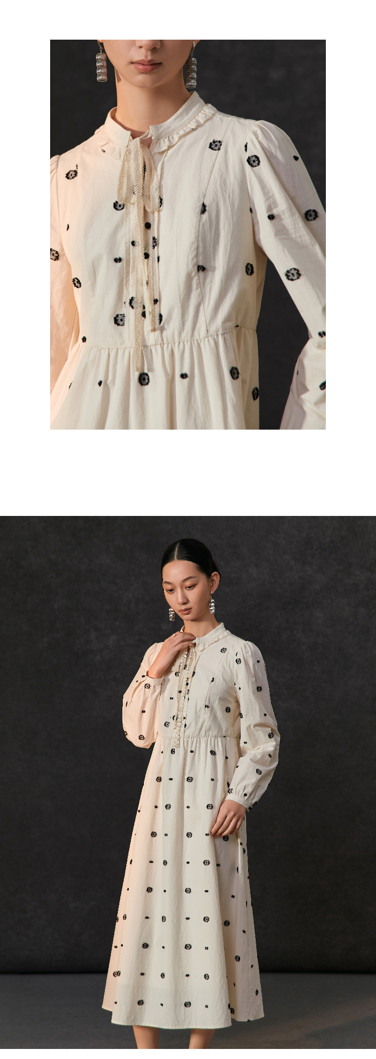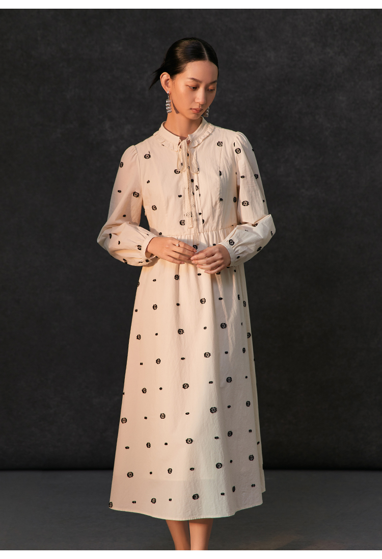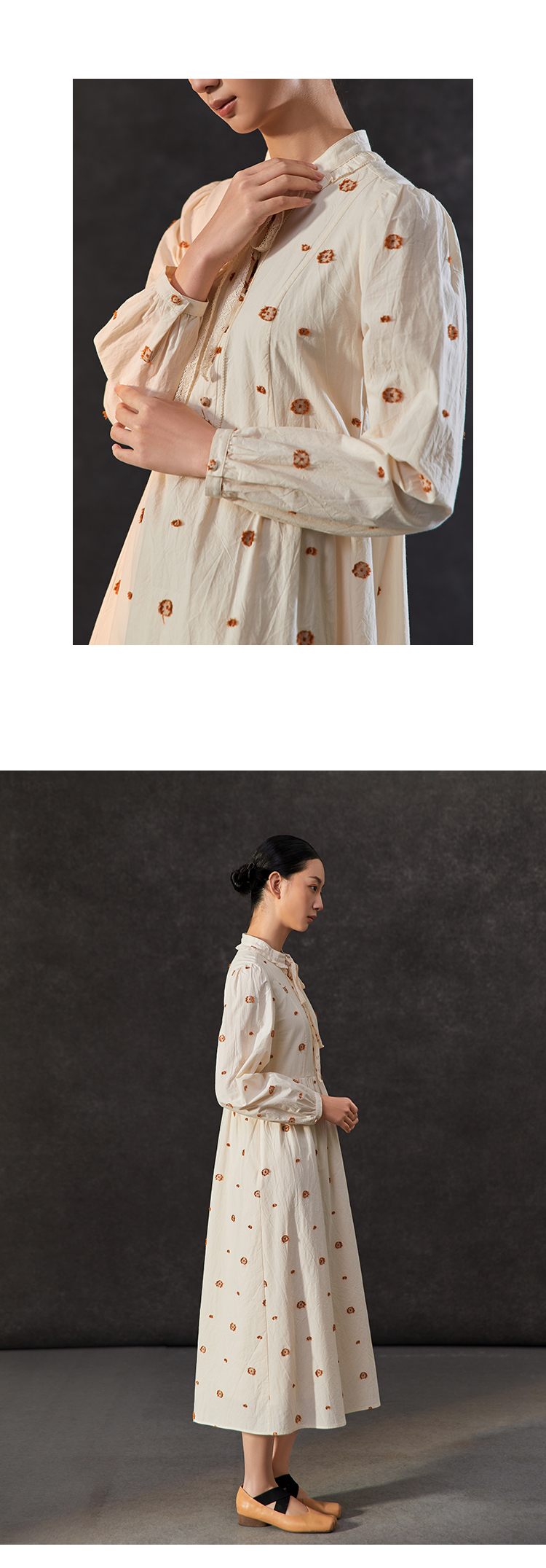 Famecoco复古浪漫绣花立领长裙女款长袖高腰连衣裙FAC1FA040