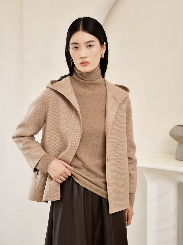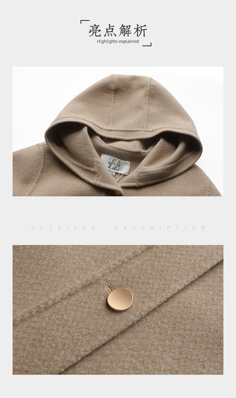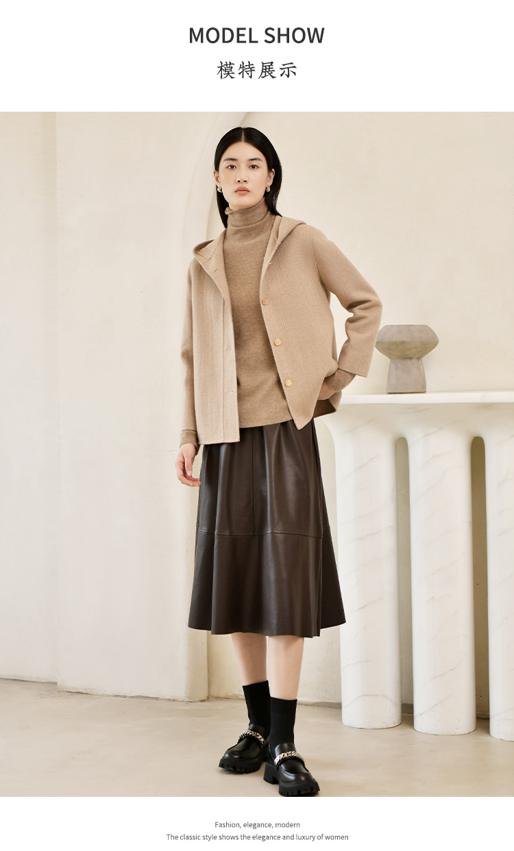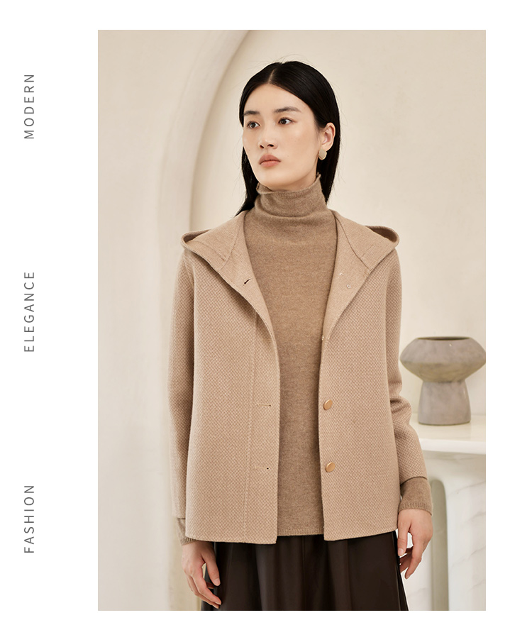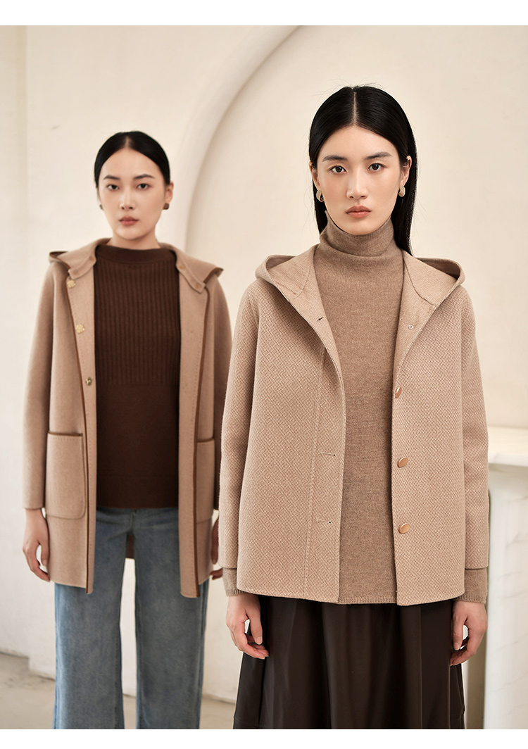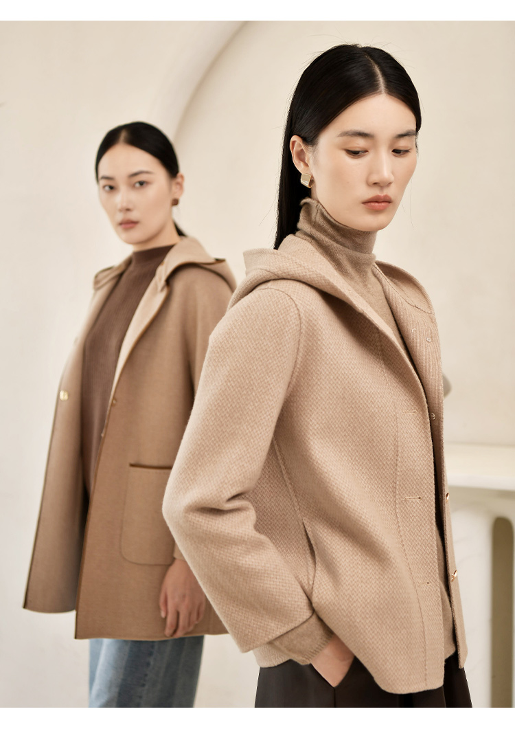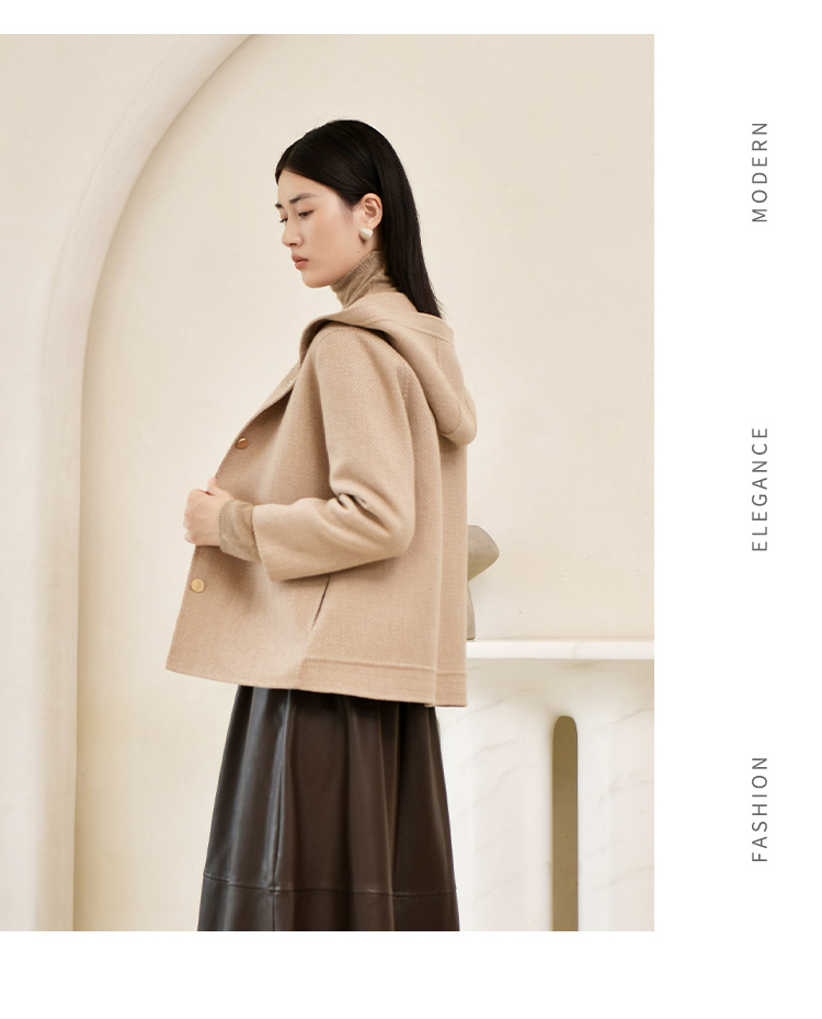 佐尔美冬季新款 气质连帽咖啡色短款双面呢中褛女E24SM05