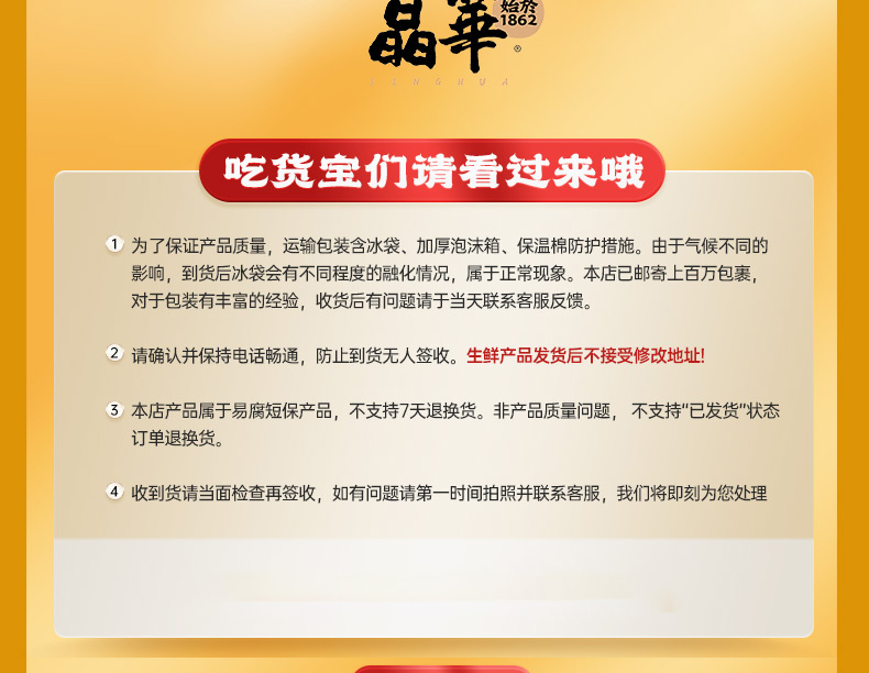 2、我们会根据气温增减冰袋,您收到食材时会有部分解冻现象,在泡沫箱和冰袋的保护下,冷冻食材48小时内有凉气品质不会受影响,您可放心食用,未及时烹煮请及时放冰箱冷冻保存。