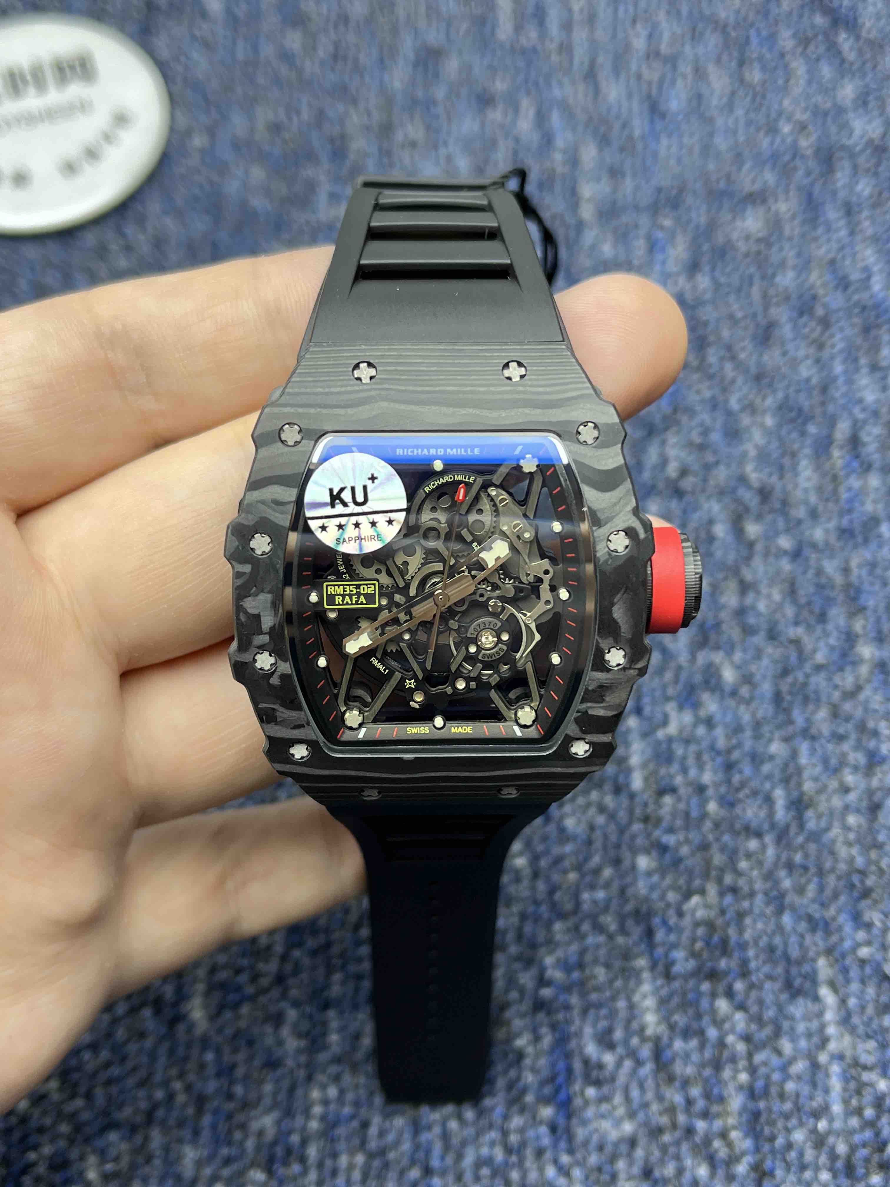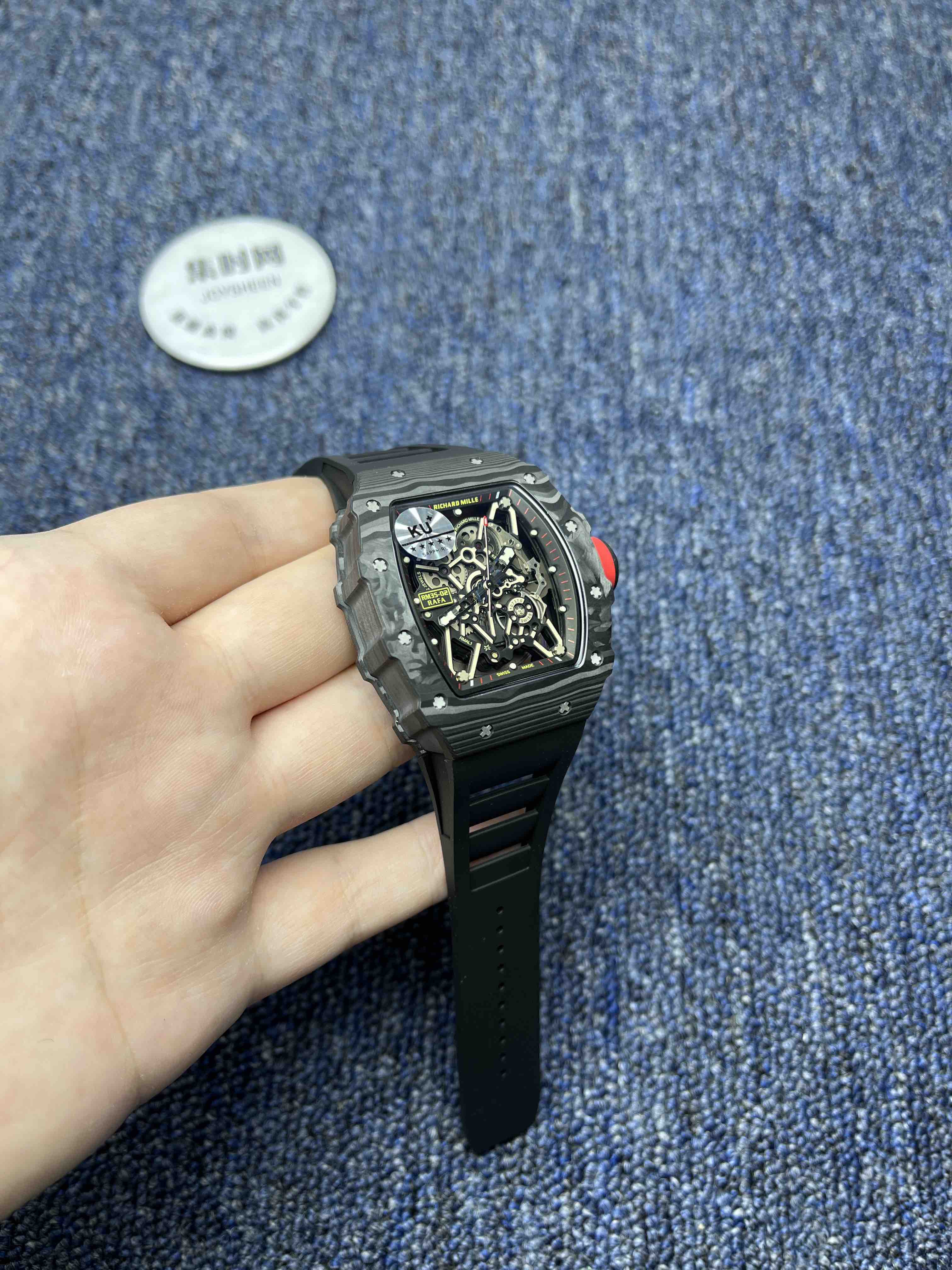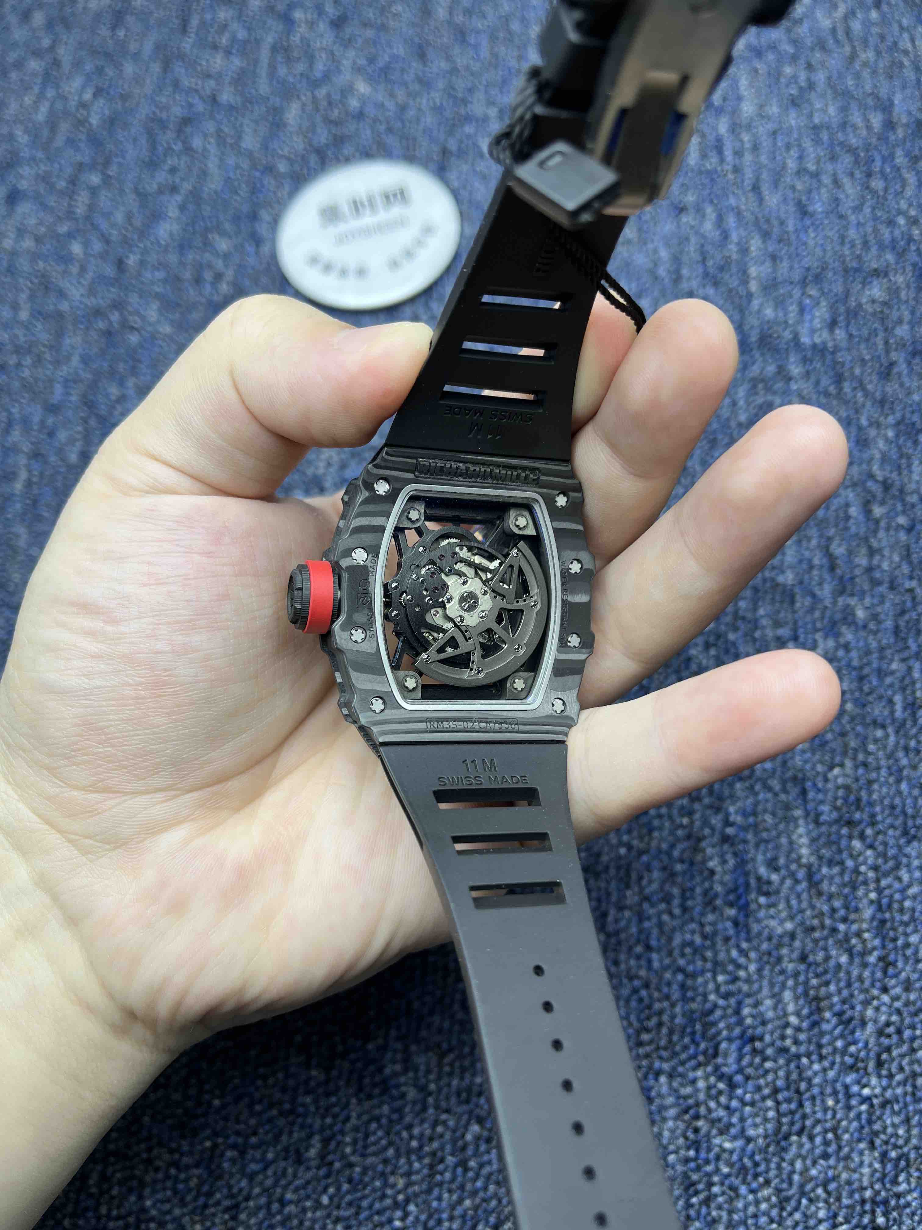 KV理查德米勒RM35-02系列 男士腕表 表壳和底盖釆用高密度进口NTPT碳纤维材料 碳纤维表壳表底和钛内胆两侧釆用同步CNC加工!使之壳上下与左右二侧毫无缝隙,经试水测试4Pa压力后均达到100%通过防水检验 表带釆用马来西亚进口纯橡胶材料制作而成,使之呈现出超韧性及柔软的感觉,市面上最强的RM专用橡胶带,做到能与正品互换的效果 依原版原理采用钛金属材料作为内胆及釆用最前沿的电火花精切缕空技术!机芯釆用进口全自动机械机芯 表壳底上的字使用最前沿的超声波精准雕刻技术,使表底整体呈现岀高贵的质感 玻璃釆用目前市面上最高硬度的蓝宝石水晶玻璃材料及双面镀蓝膜处理 每只腕表底盖上都有独立的编码!与原版一致的流水编码。