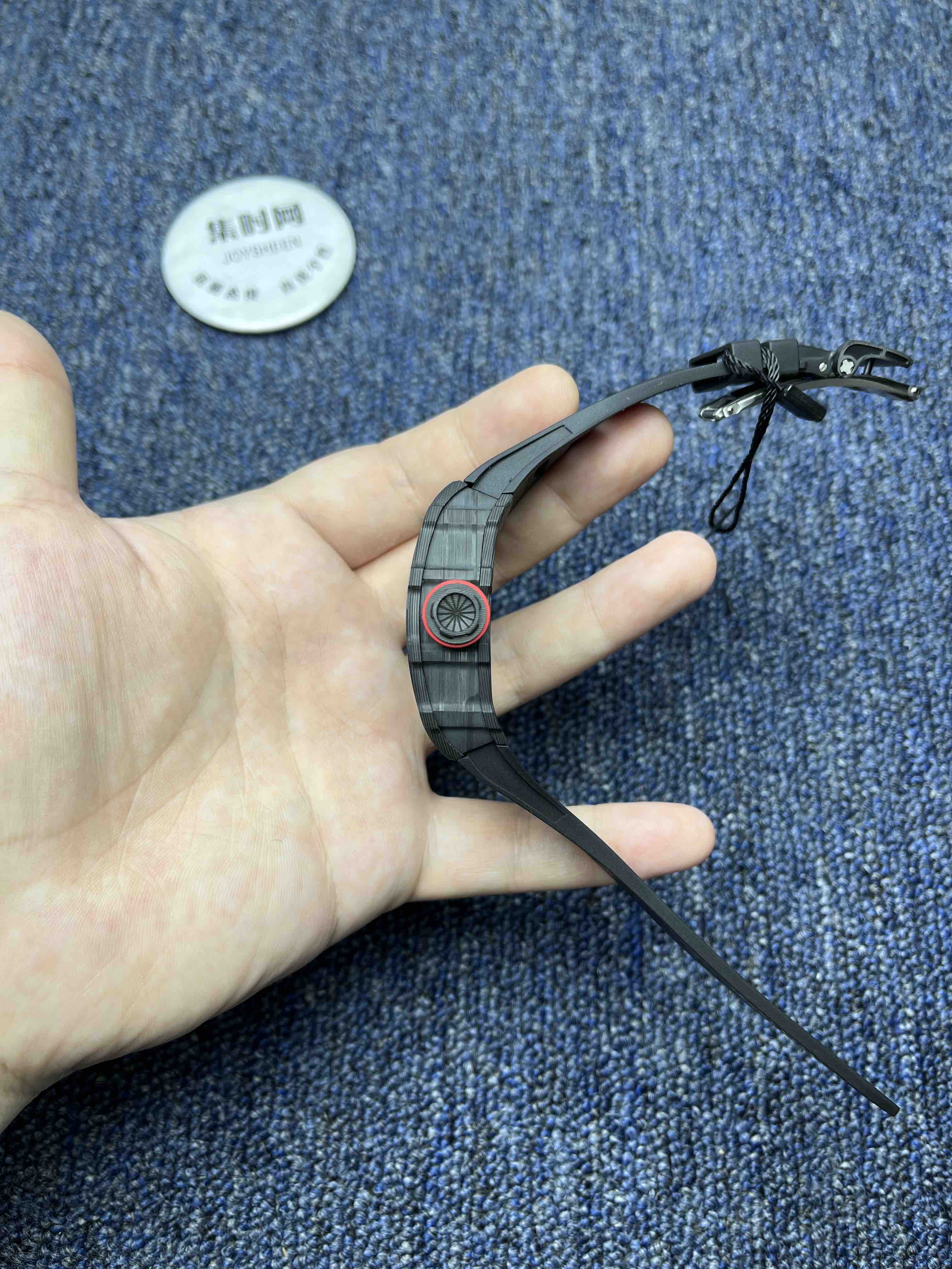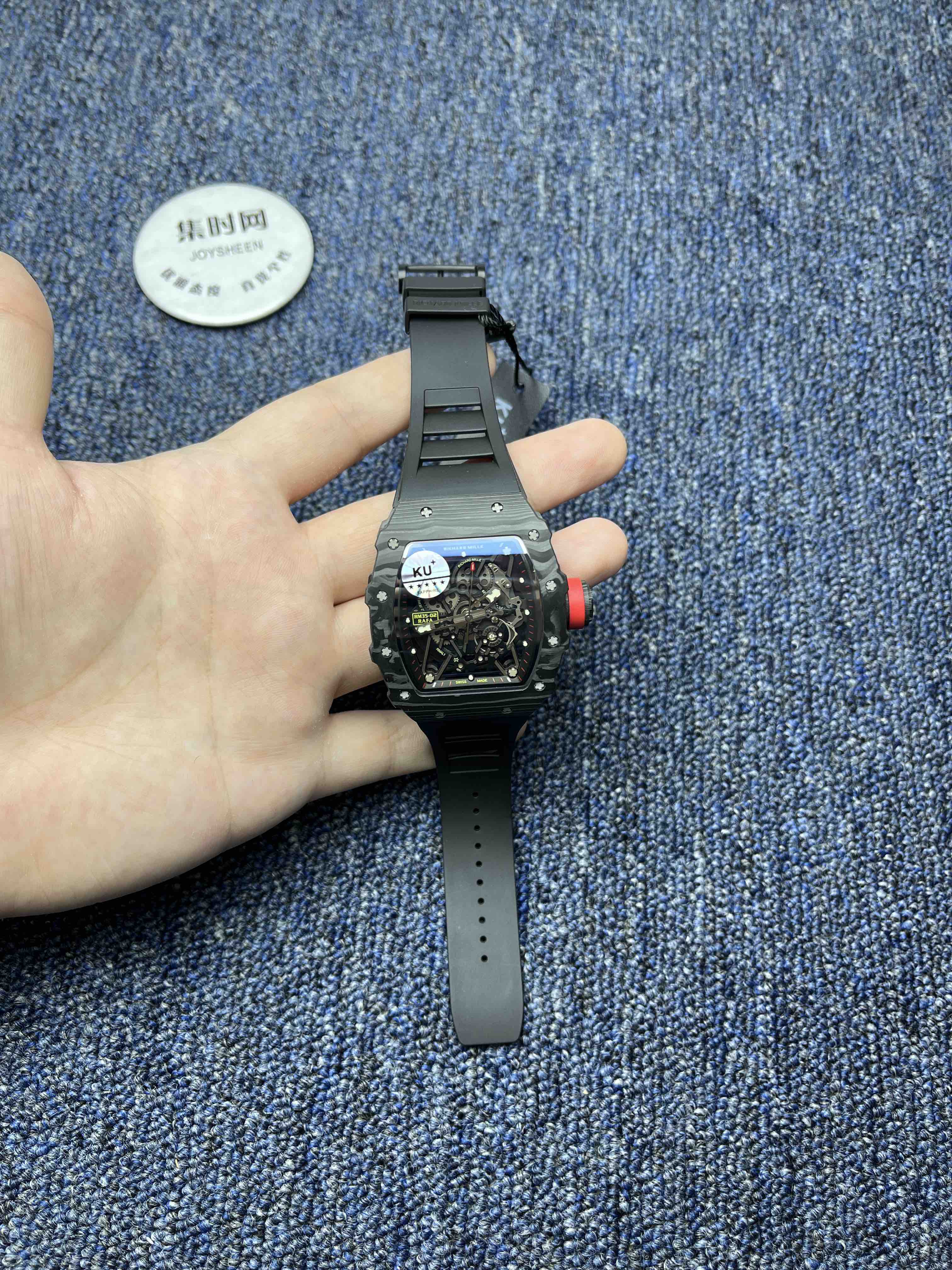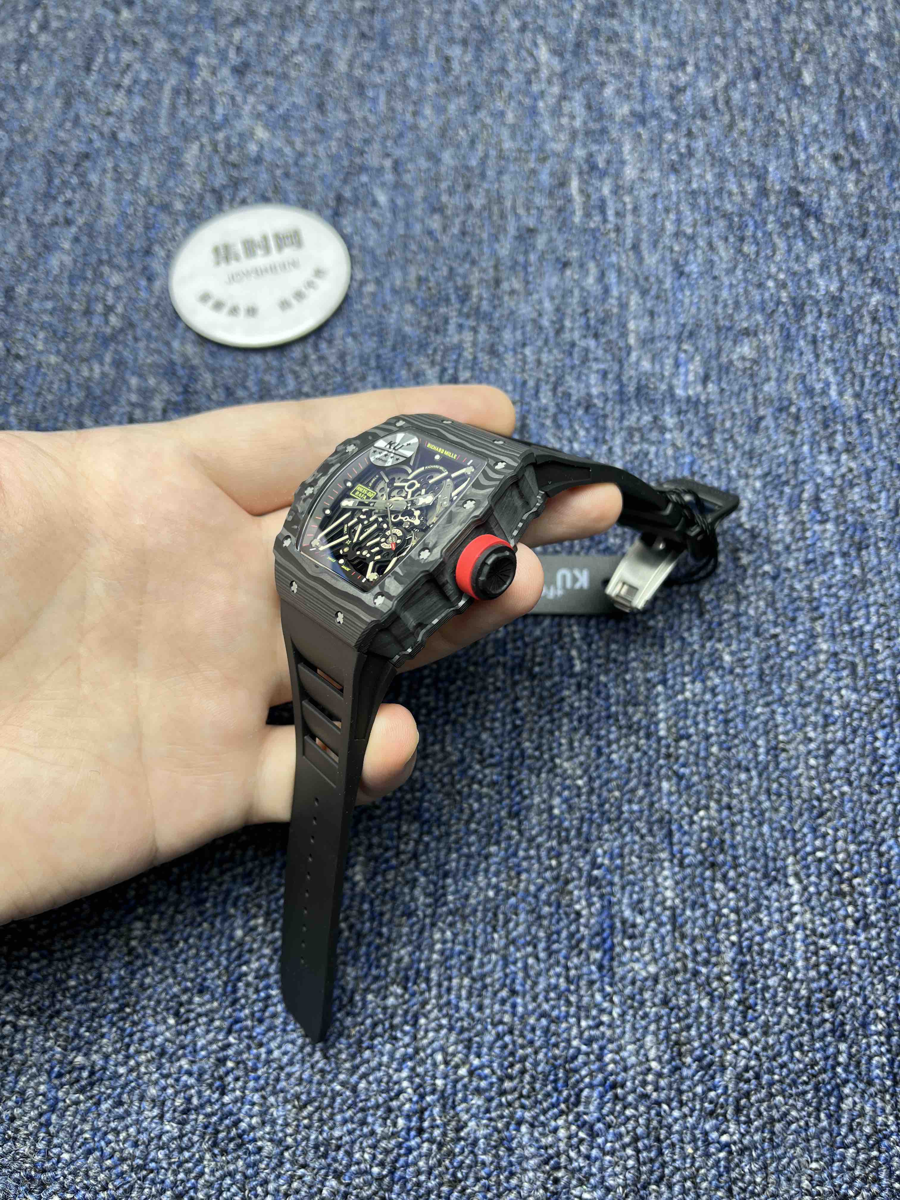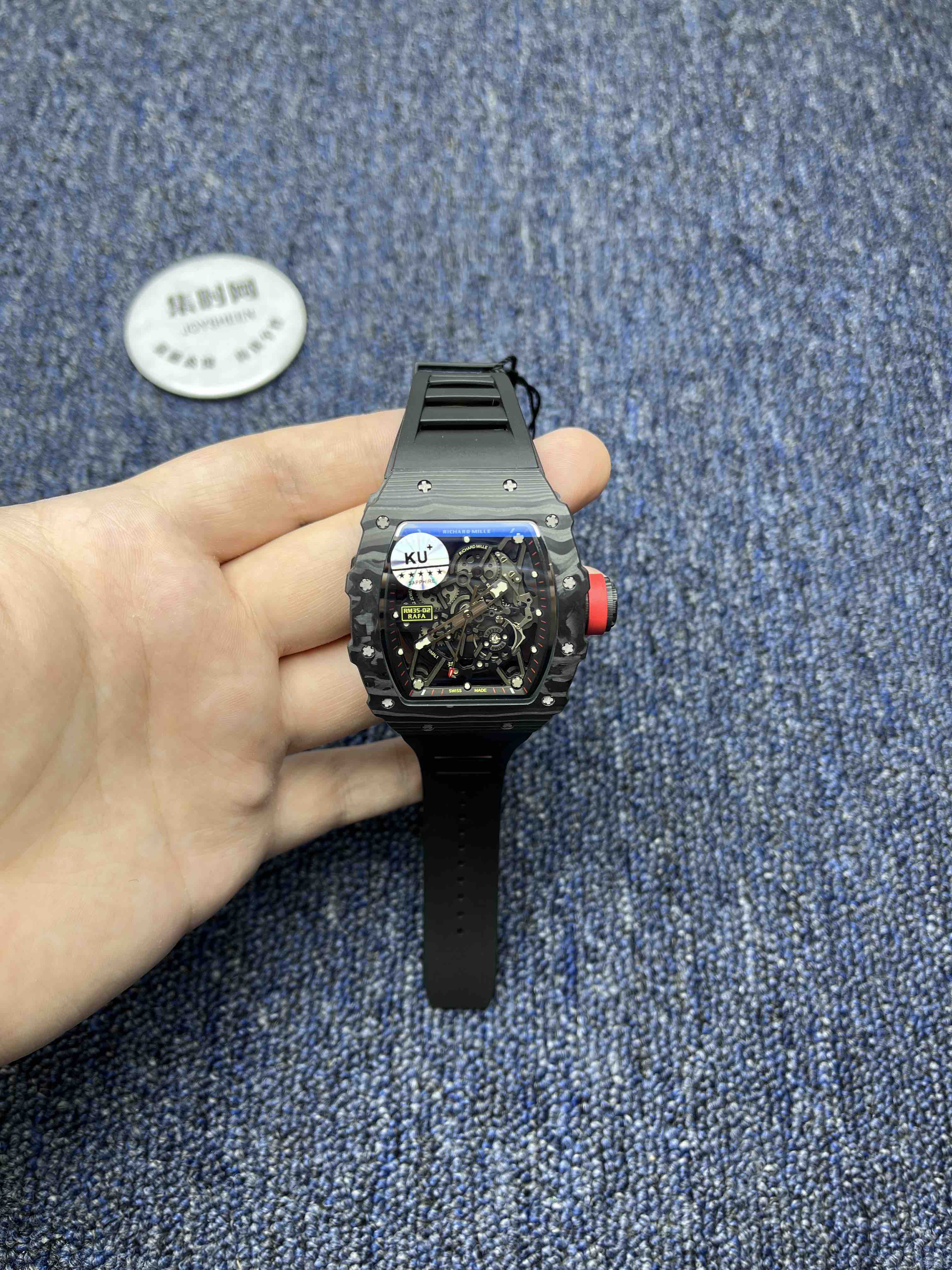KV理查德米勒RM35-02系列 男士腕表 表壳和底盖釆用高密度进口NTPT碳纤维材料 碳纤维表壳表底和钛内胆两侧釆用同步CNC加工!使之壳上下与左右二侧毫无缝隙,经试水测试4Pa压力后均达到100%通过防水检验 表带釆用马来西亚进口纯橡胶材料制作而成,使之呈现出超韧性及柔软的感觉,市面上最强的RM专用橡胶带,做到能与正品互换的效果 依原版原理采用钛金属材料作为内胆及釆用最前沿的电火花精切缕空技术!机芯釆用进口全自动机械机芯 表壳底上的字使用最前沿的超声波精准雕刻技术,使表底整体呈现岀高贵的质感 玻璃釆用目前市面上最高硬度的蓝宝石水晶玻璃材料及双面镀蓝膜处理 每只腕表底盖上都有独立的编码!与原版一致的流水编码。