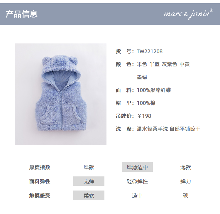 马克珍妮秋装新款 男女童双面舒棉绒连帽马甲221208