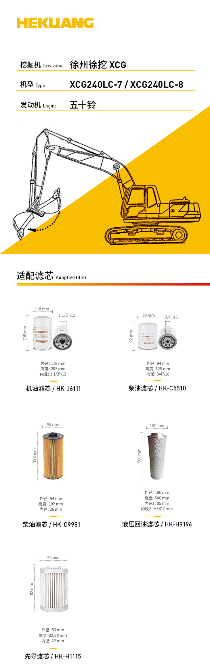 徐州徐挖XCG240LC-8 XCG240LC-7(五十铃)挖掘机滤芯 机油柴油空气滤芯 液压油先导滤芯
