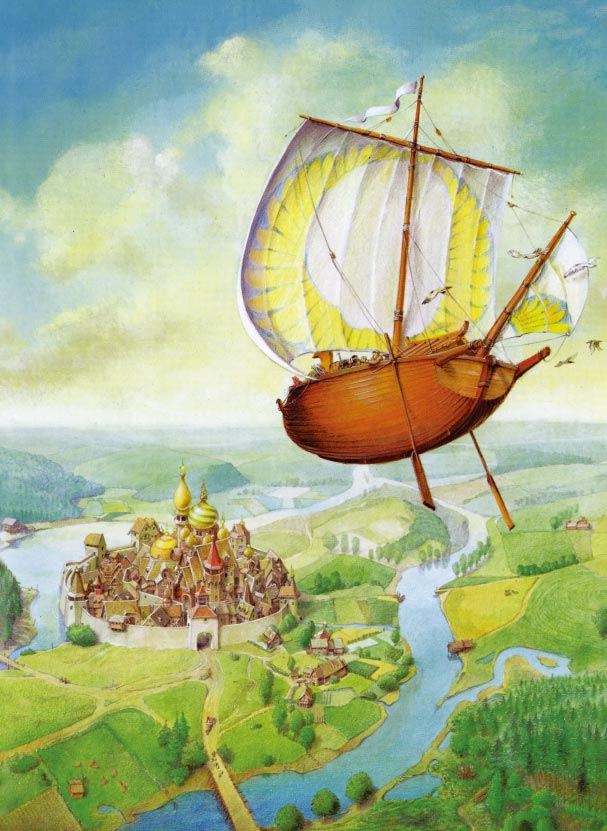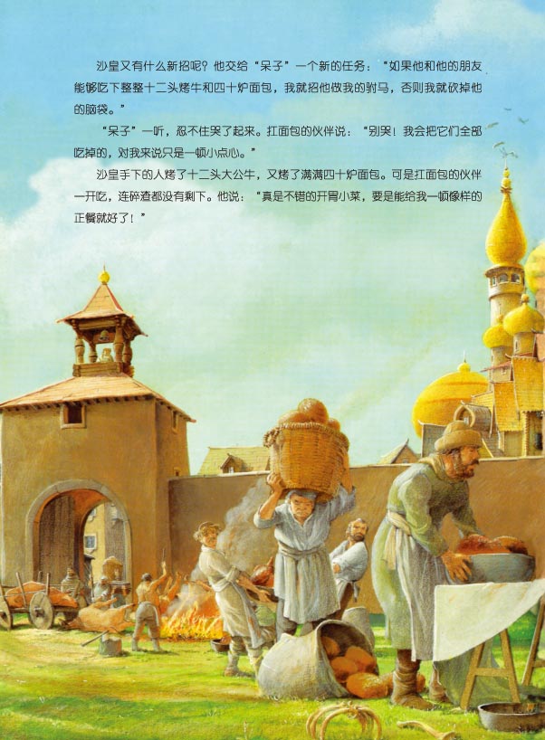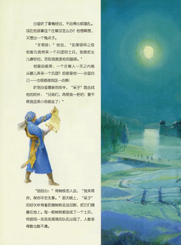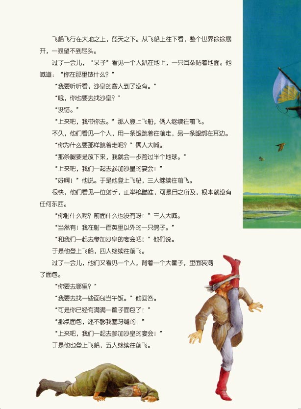 绘本取材于俄罗斯经典民间故事。有一个淳朴人,大家都叫他“呆子”。某天,沙皇宣布要宴请全国的人,并许诺将女儿嫁给一个能造出一艘飞船的人。“呆子”在去往皇宫的路上遇见一个老人,他照着老人的话去做,不仅得到了一艘华丽的纯金飞船,而且邂逅了诸多身怀绝技的奇人:顺风耳、飞毛腿、神射手……