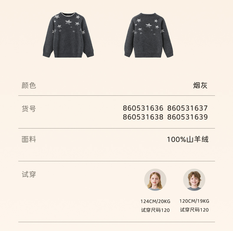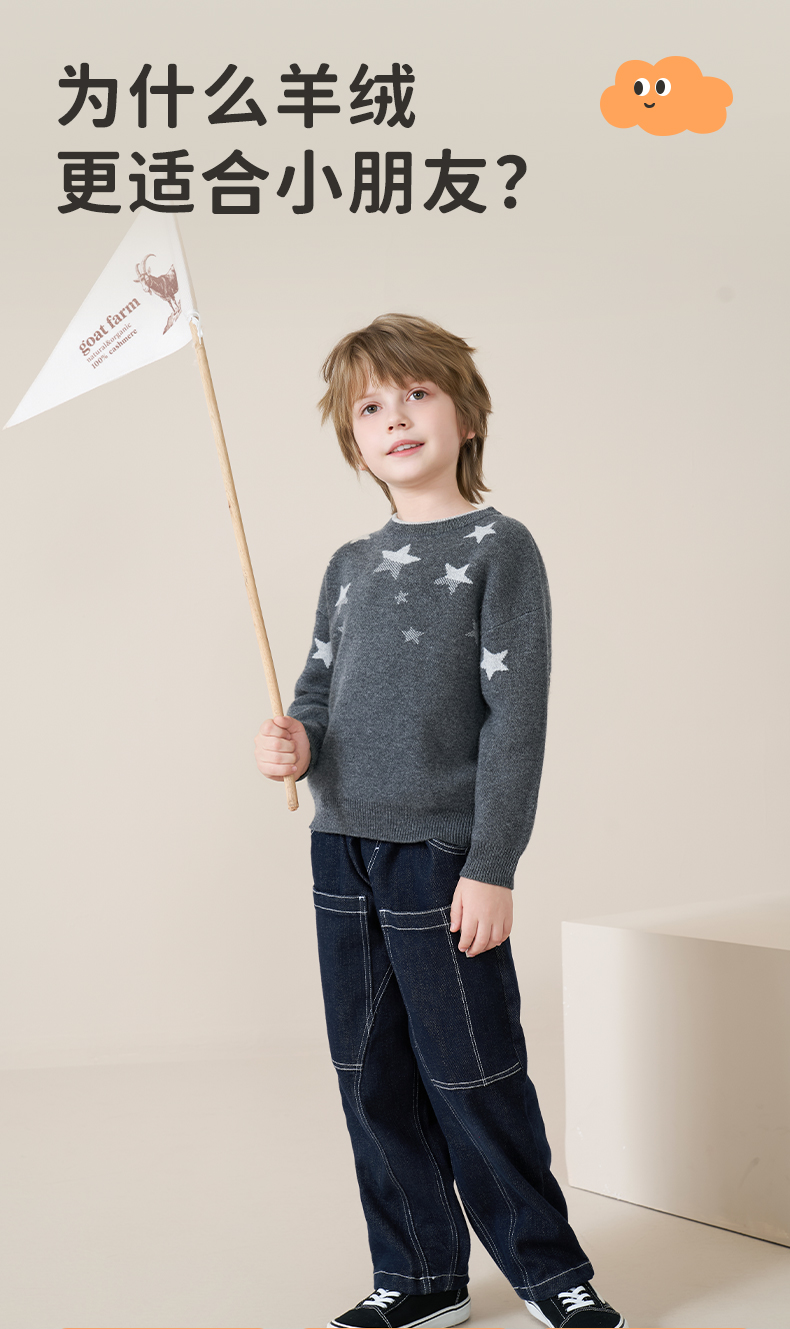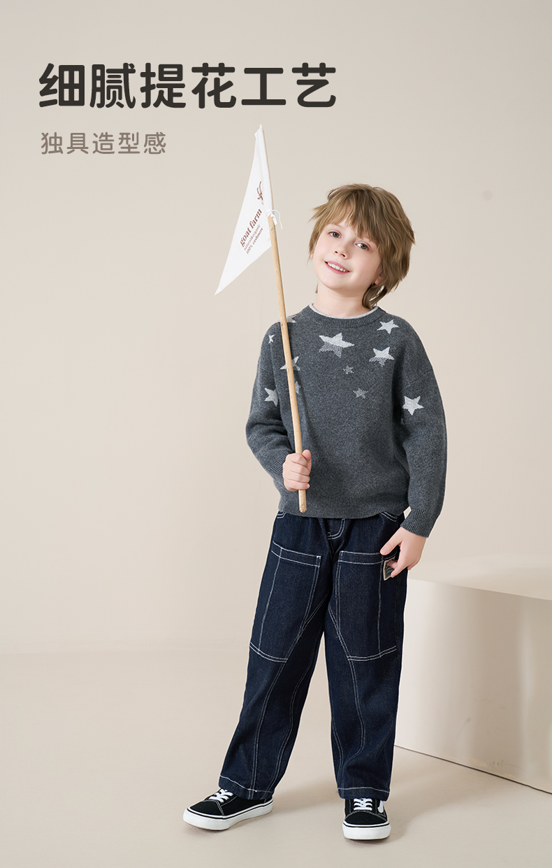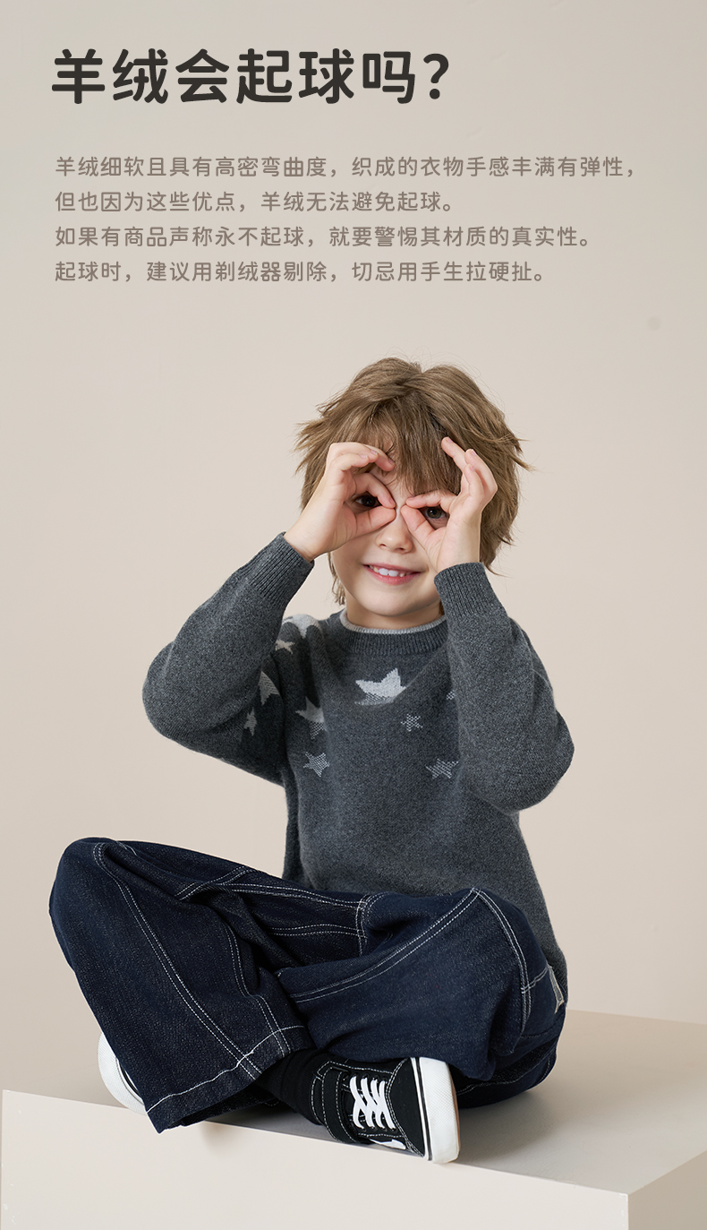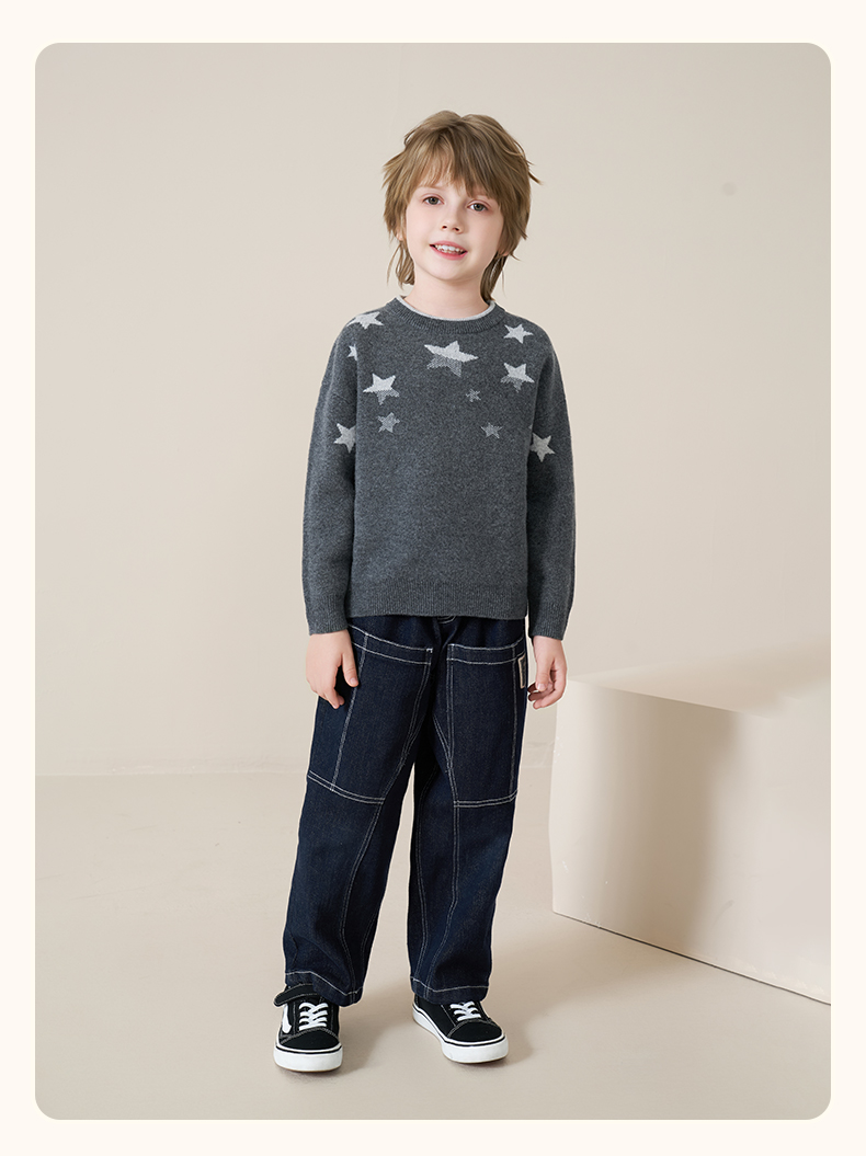 mettekids儿童100%羊绒衫2025秋冬男童圆领针织毛衣星星提花打底