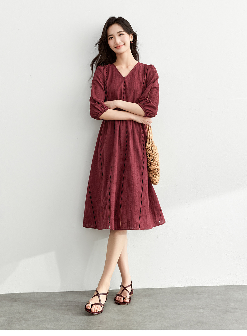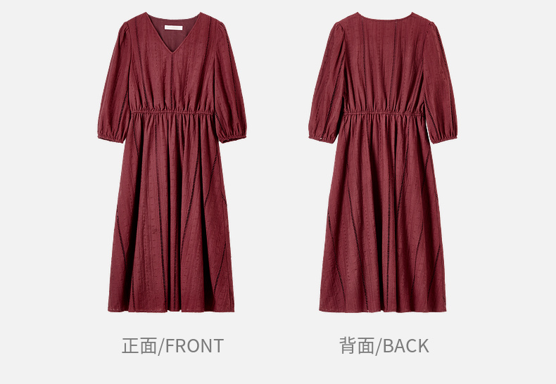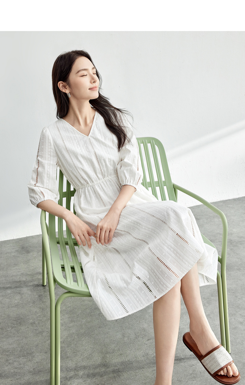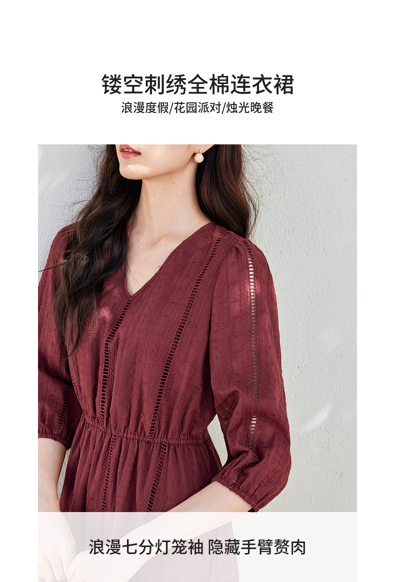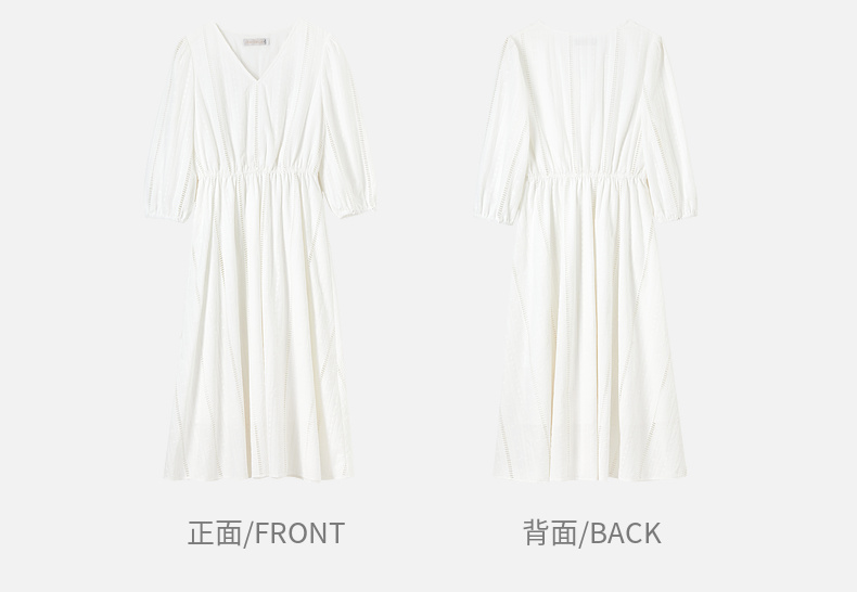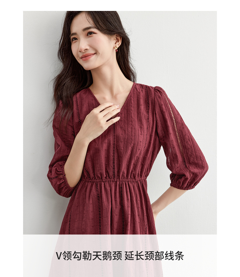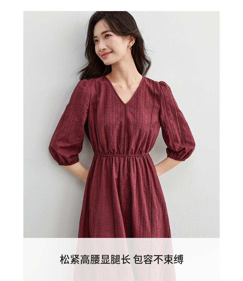 【内购】优雅度假V领松紧高腰七分灯笼袖100%亲肤棉A字连衣裙-151L58242