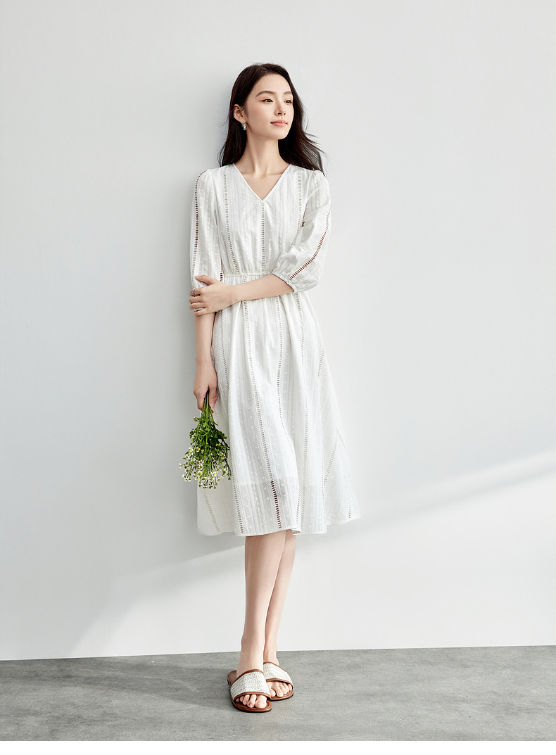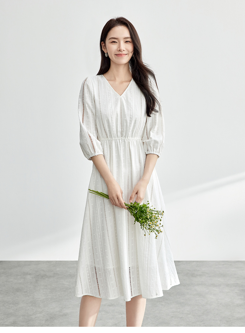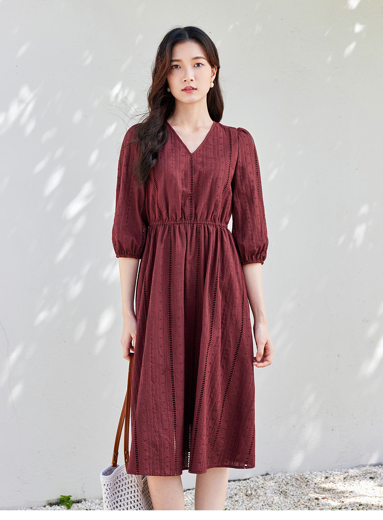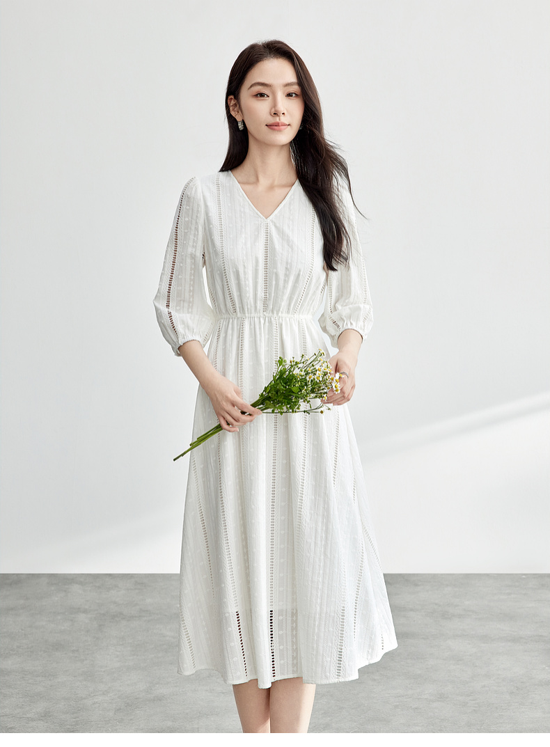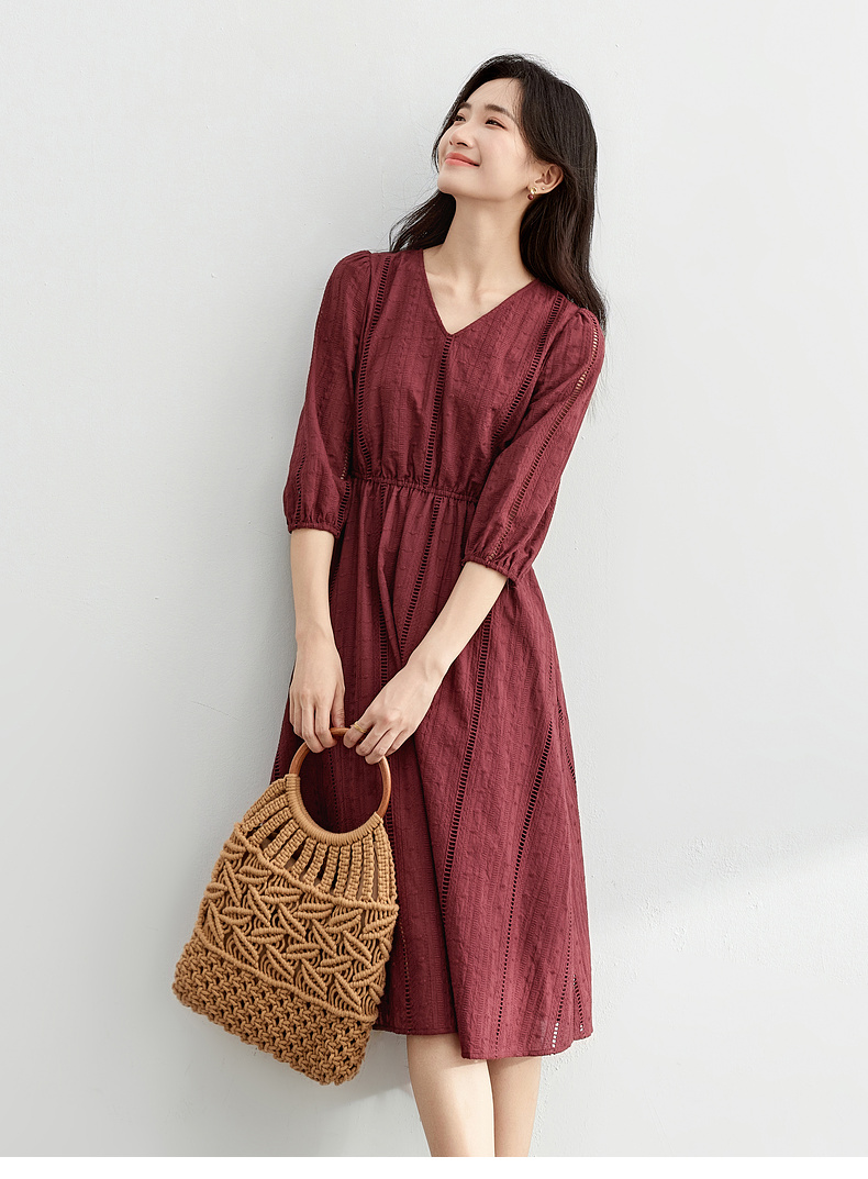 【内购】优雅度假V领松紧高腰七分灯笼袖100%亲肤棉A字连衣裙-151L58242