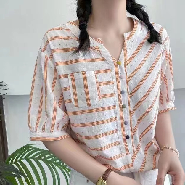 2045 # 桔 均码 气质文艺条纹拼接口袋女衬衫 棉麻彩色扣子宽松V领