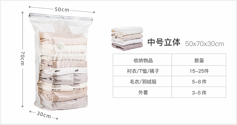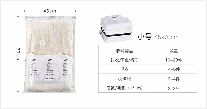 一个衣架上有多孔挂环,品质相当不错,可以承受7KG以内的东西,可收纳七八件衣服没问题,免抽气挂式真空压缩,手压即可排气,这个设计点真的是非常人性化了,非常适合不会使用工具的小仙女~~~简直太贴心了,懒人福音有木有!换季的时候一定要多备几个,家里都能用的上,能让小空间大翻倍哦!