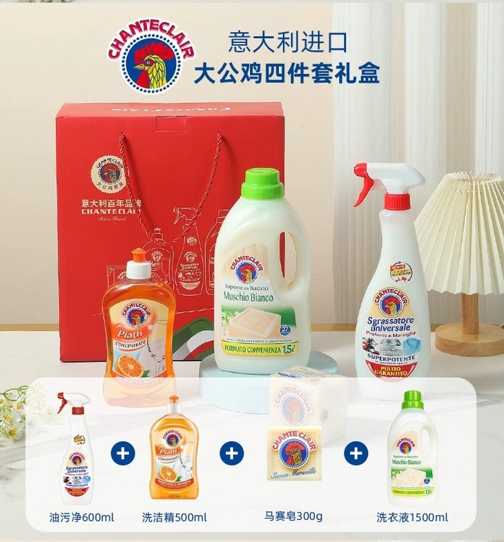 【一般贸易】意大利大公鸡管家 四件套礼盒有礼袋 油污净+洗洁精+洗衣液+马赛洗衣皂