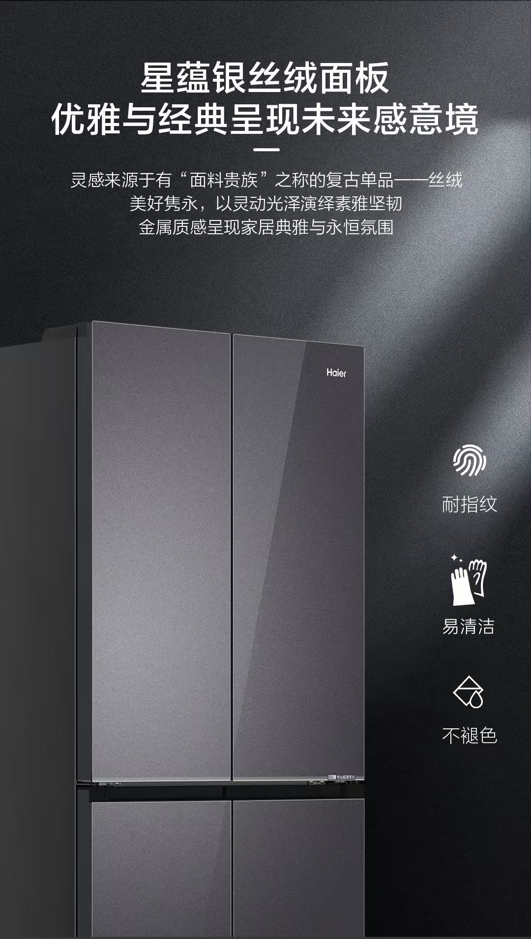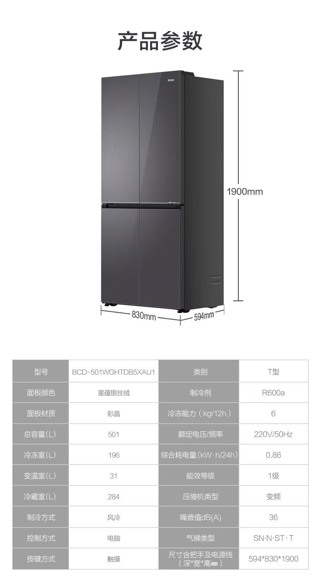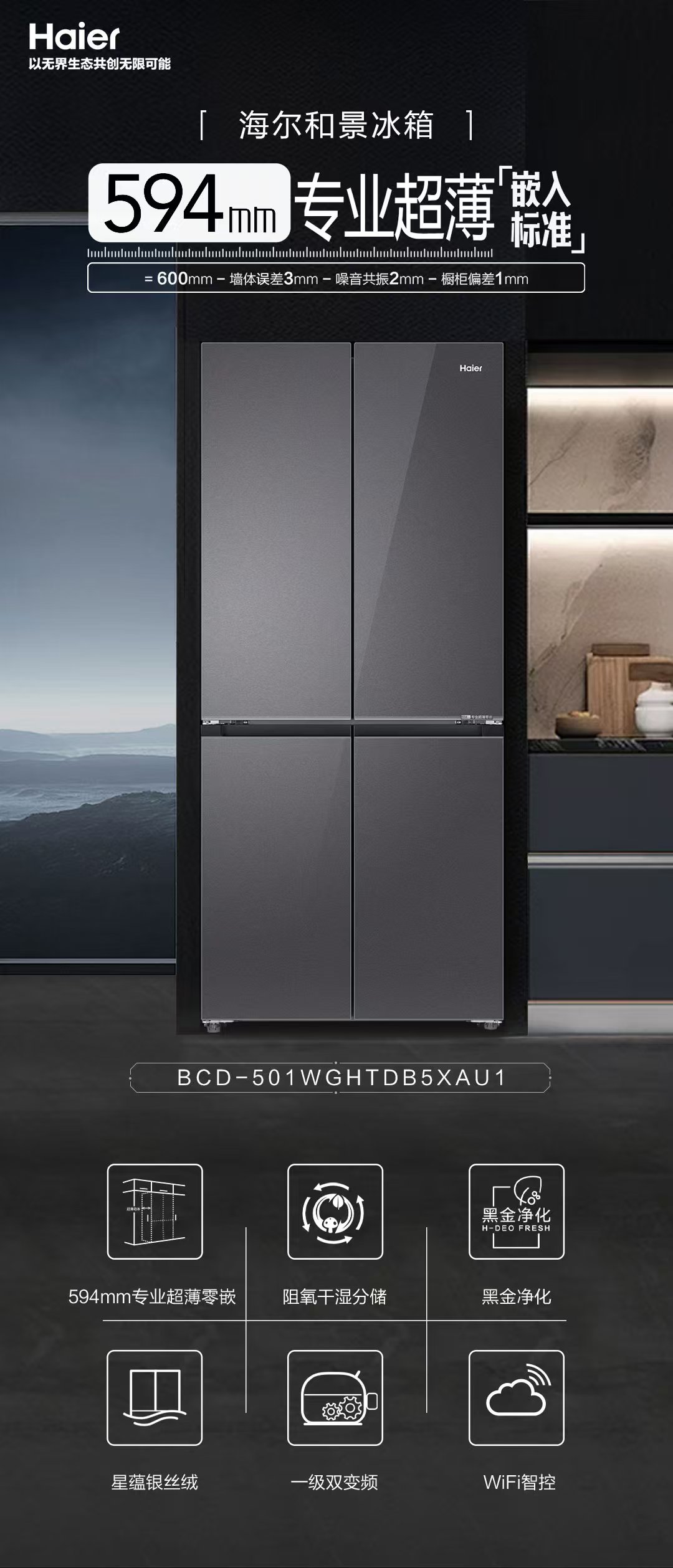 海尔冰箱501升超薄零嵌入式60cm内四开门双开门十字门一级能效双变频BCD-501WGHTDB5XAU1