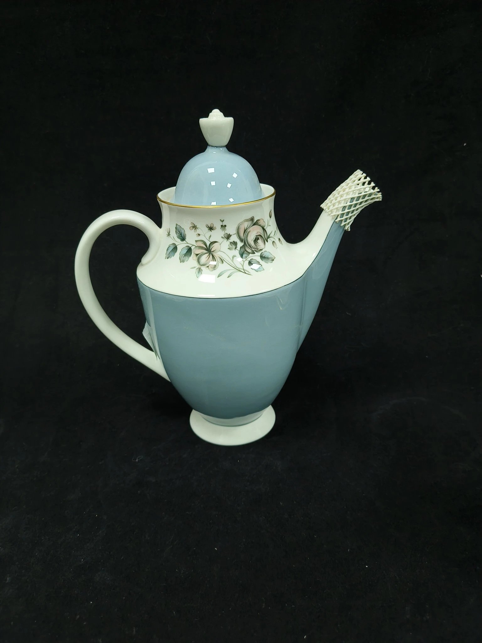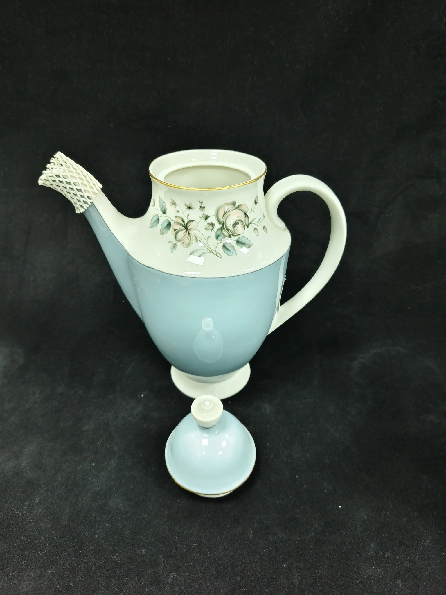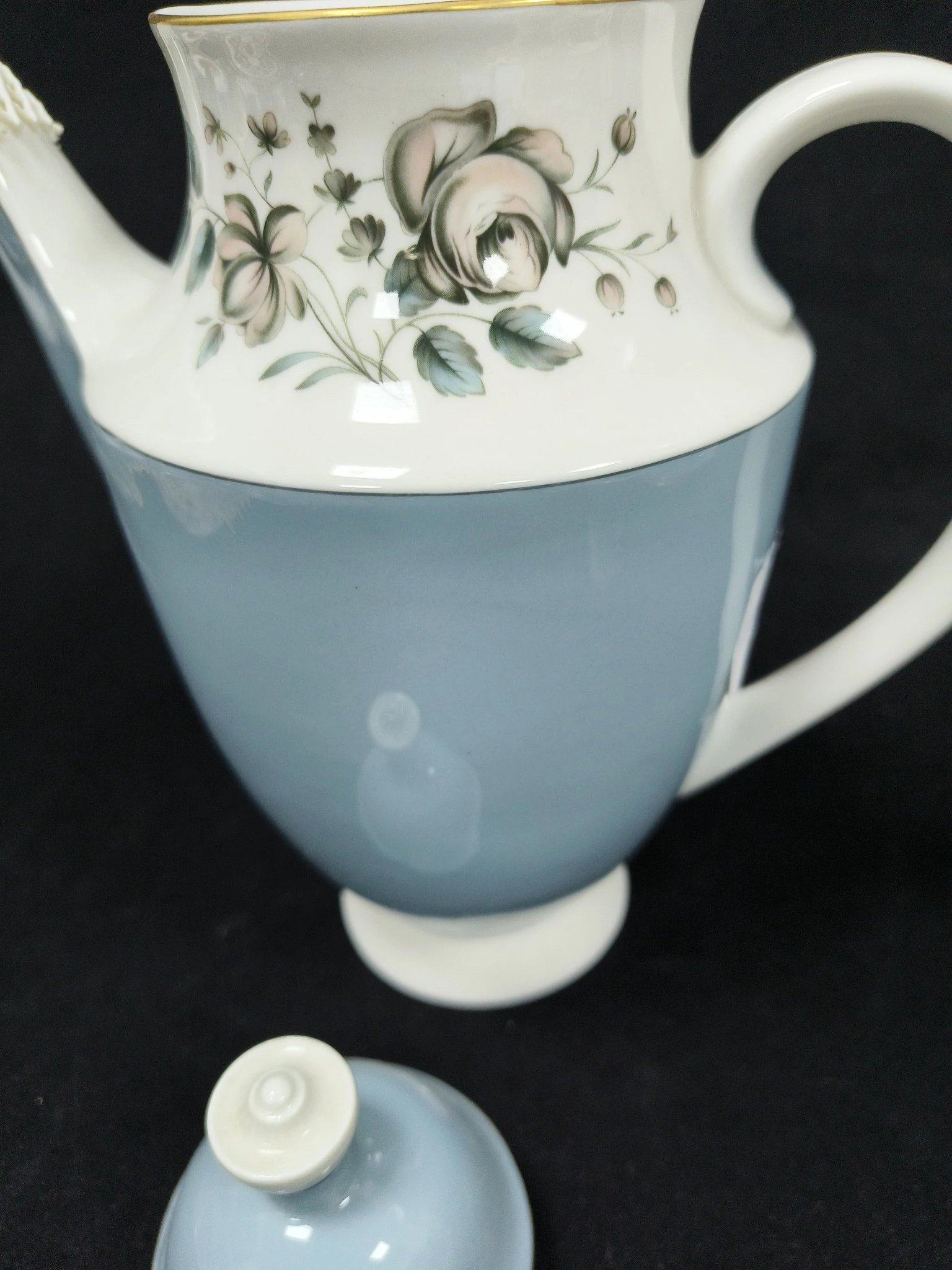 皇家道尔顿蓝色玫瑰系列作品,这组作品包括了一杯一碟的摩卡杯,一杯两碟阔口杯,糖罐奶罐以及壶。莫兰迪蓝色非常舒适,内敛而优雅。
