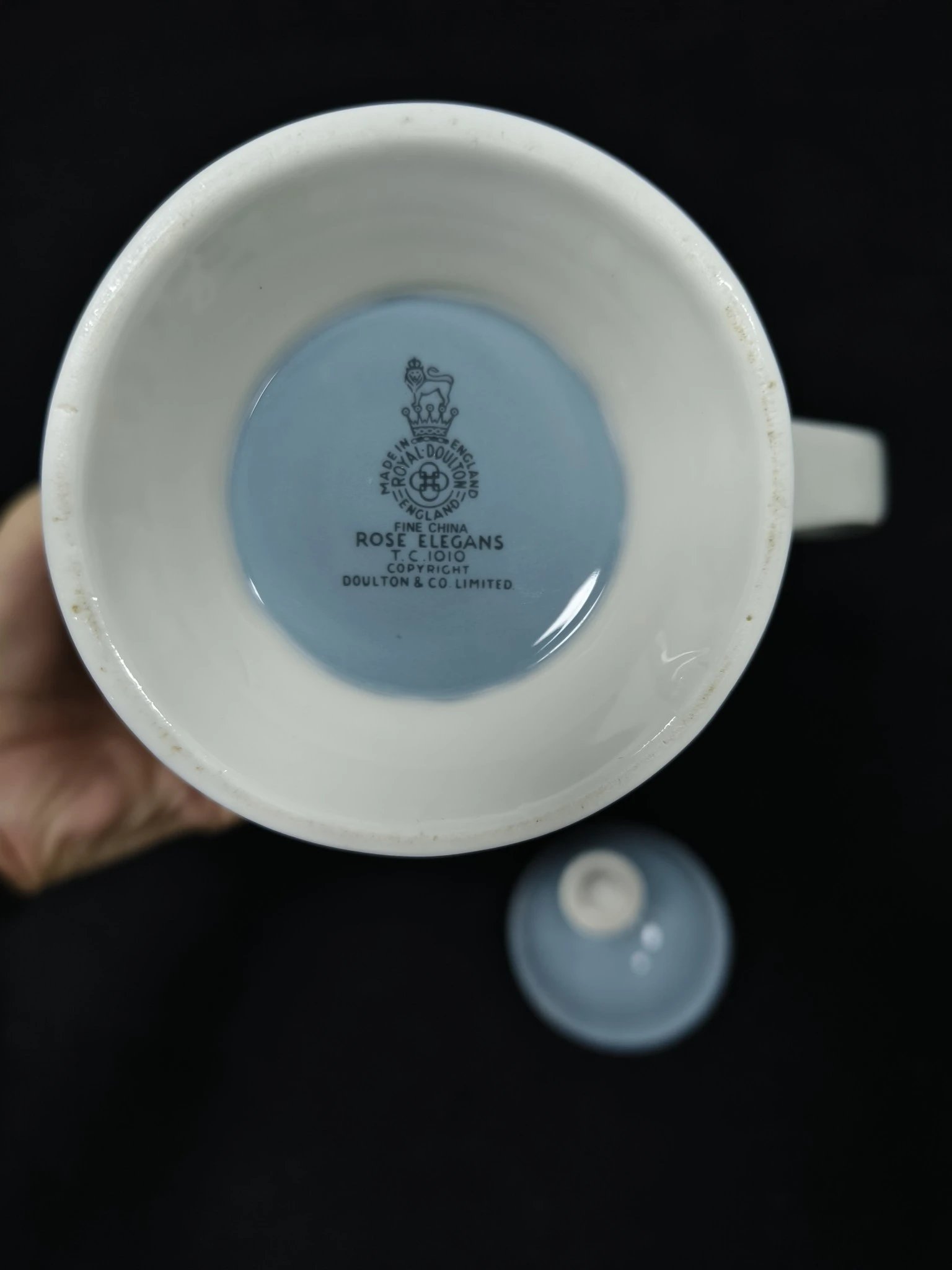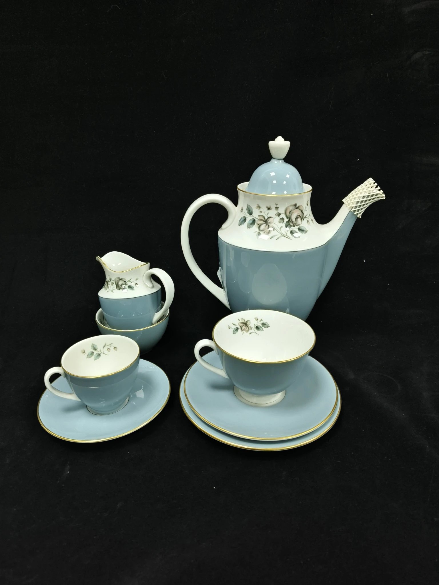 皇家道尔顿蓝色玫瑰系列作品,这组作品包括了一杯一碟的摩卡杯,一杯两碟阔口杯,糖罐奶罐以及壶