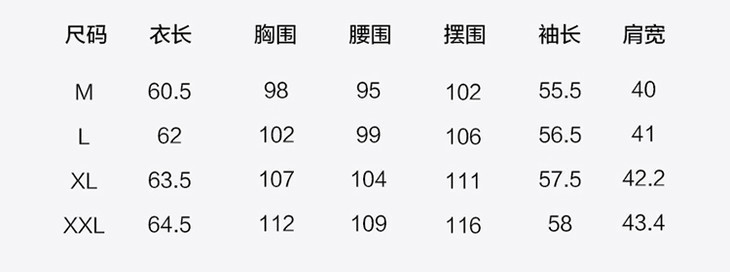 尺码:M、L、XL、XXL,可以根据尺码表进行选择。