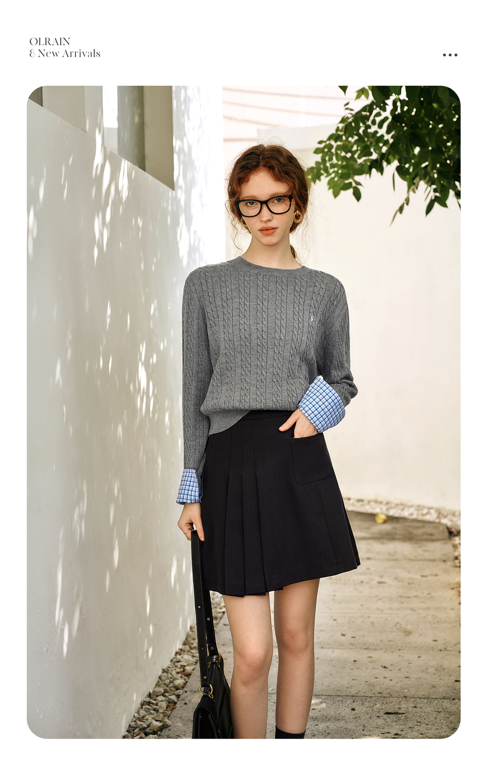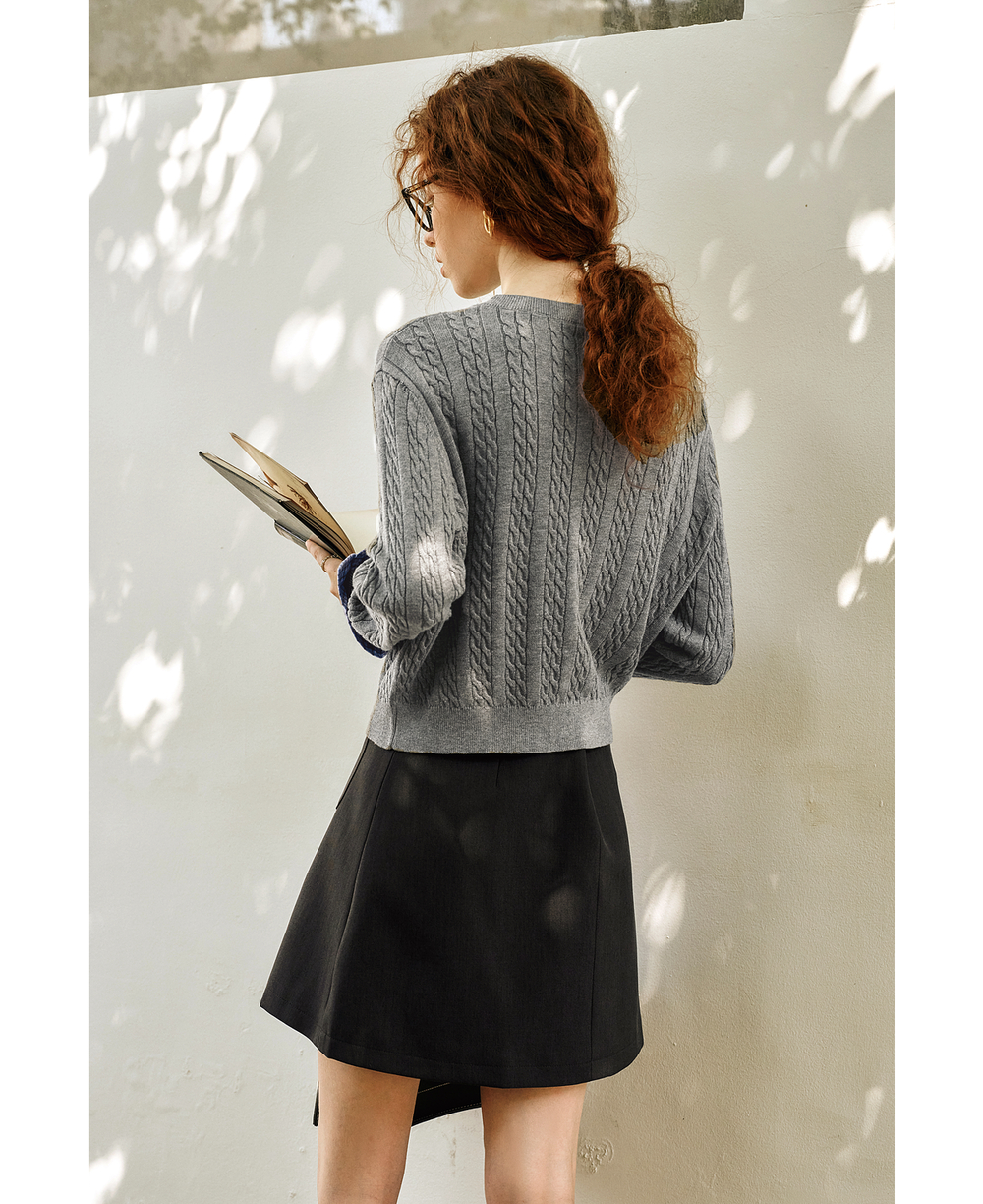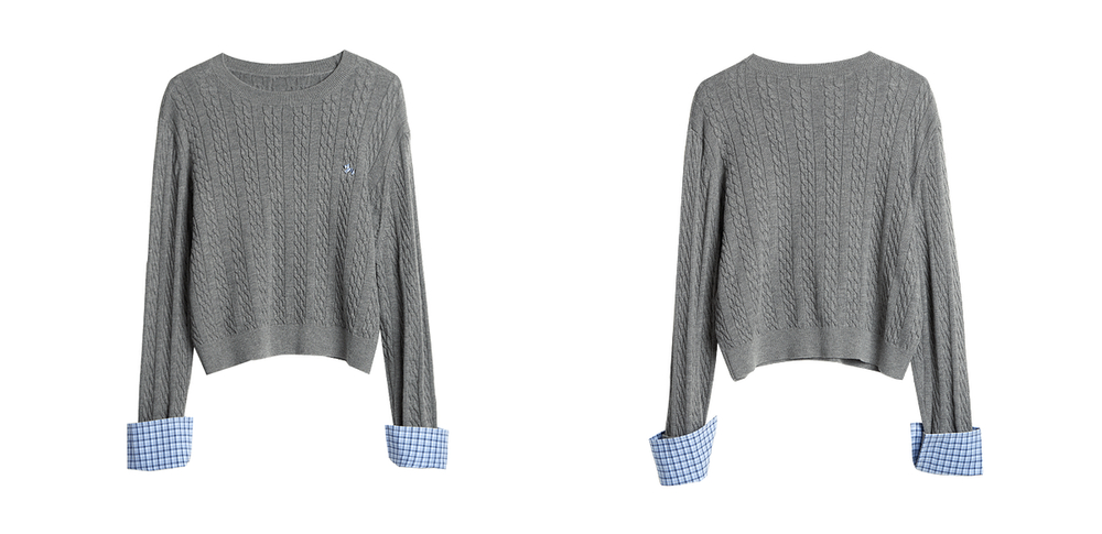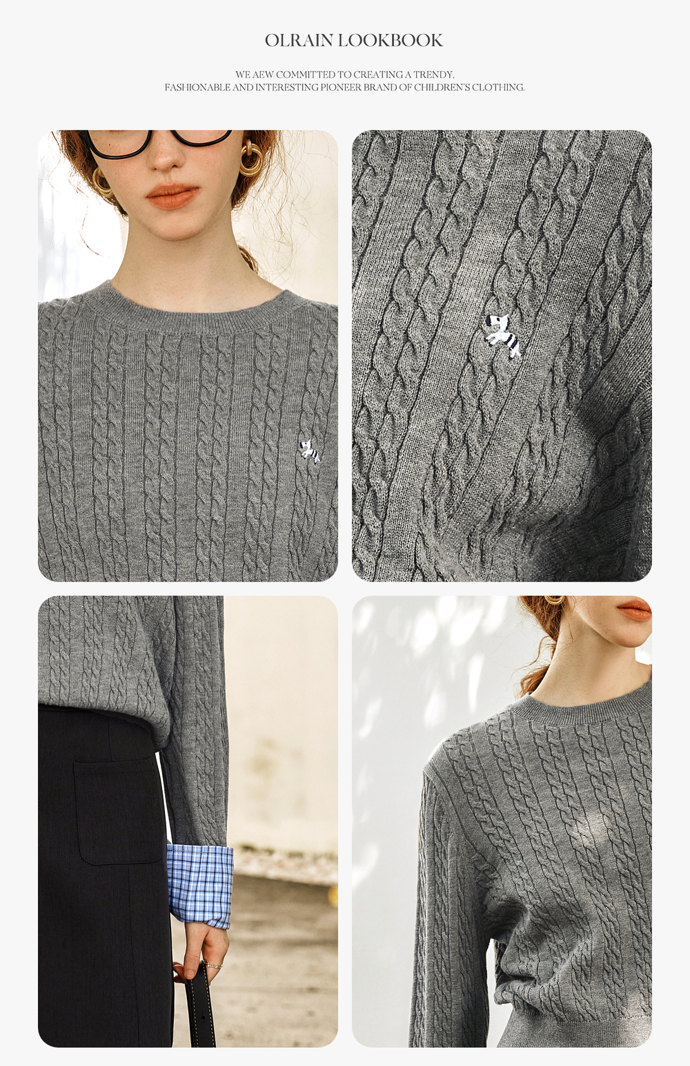 OLrain欧芮儿灰色套头毛衣女春季2025年新款拼接通勤圆领针织上衣