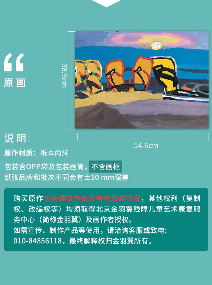 - 金羽翼将艺术与心理治疗相结合,用艺术教育的形式帮助残障青少年体现自身价值、提高生活质量、实现艺术梦想,并将绘画作品开发成衍生品销售,收入扣除成本后,20%返还给学员家庭,80%用于金羽翼艺术康复教学。