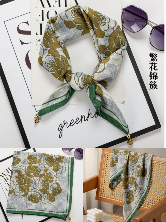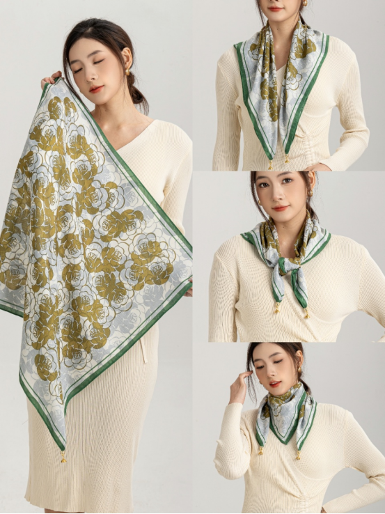这款围巾主要是以山茶花为主, 采用浅绿色和白色作为主色调, 给人一种清新自然的感觉。 上面印有草木绿的花图案,增添了几分优雅和浪漫。 围巾的质地柔软舒适,佩戴起来非常舒适。 总之,这款围巾绝对是时尚又实用的好东西!
