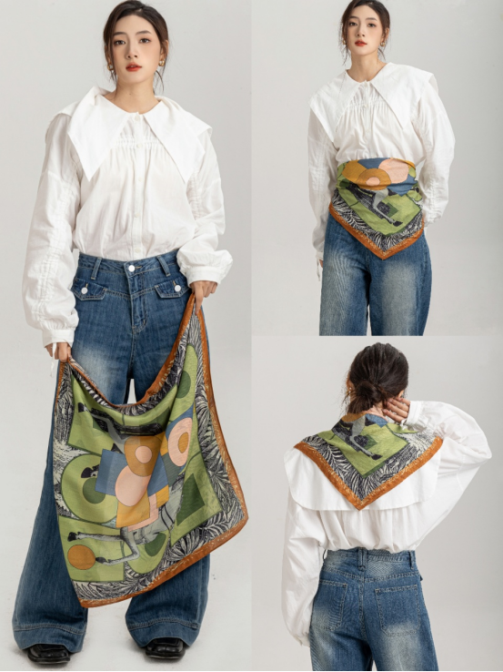 “丛林”“马”等都是大牌丝巾的元素, 抽象款式以及亮丽的配色是时尚优雅的, 它采用了柔软的丝质材料, 轻盈飘逸,非常适合春夏季节佩戴。 围巾的长度适中,可以系在脖子上或系在腰间,展现出不同的风格。 这款围巾款式简约大方,非常适合日常穿搭。 无论是搭配衬衫、T恤还是牛仔裤,都能轻松打造出时尚休闲的风格。