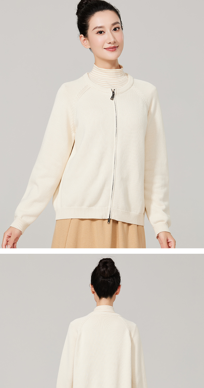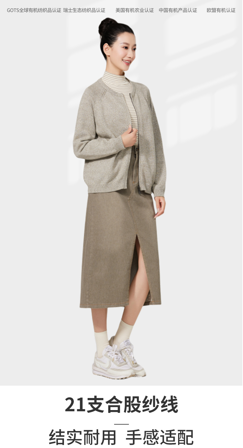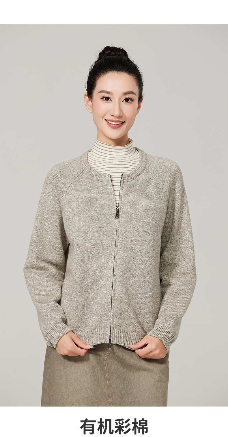 素道有机彩棉纯棉针织拉链衫女士白色秋冬开衫上衣简约灰色保暖衫