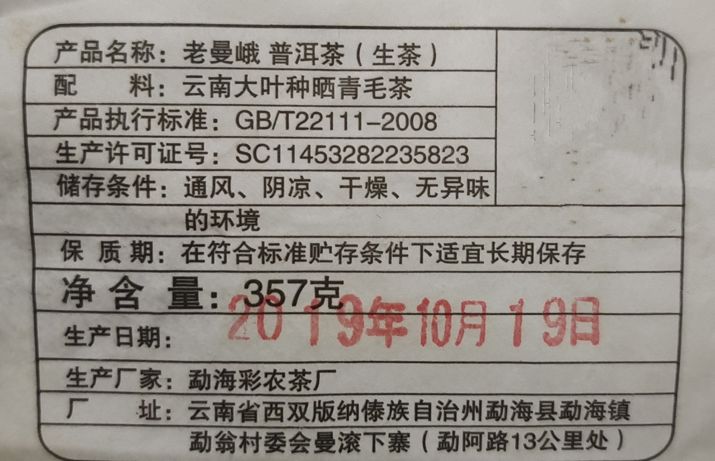 彩农茶|老曼峨2019秋古树纯料青饼