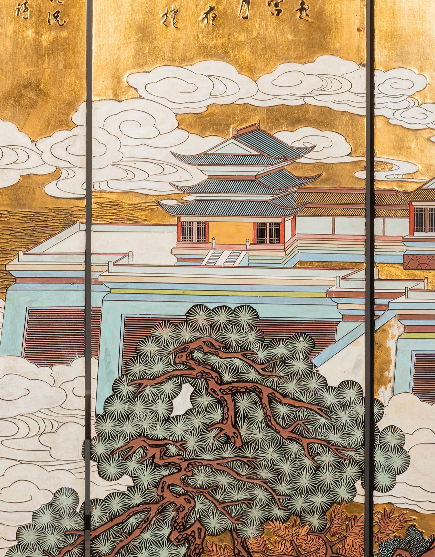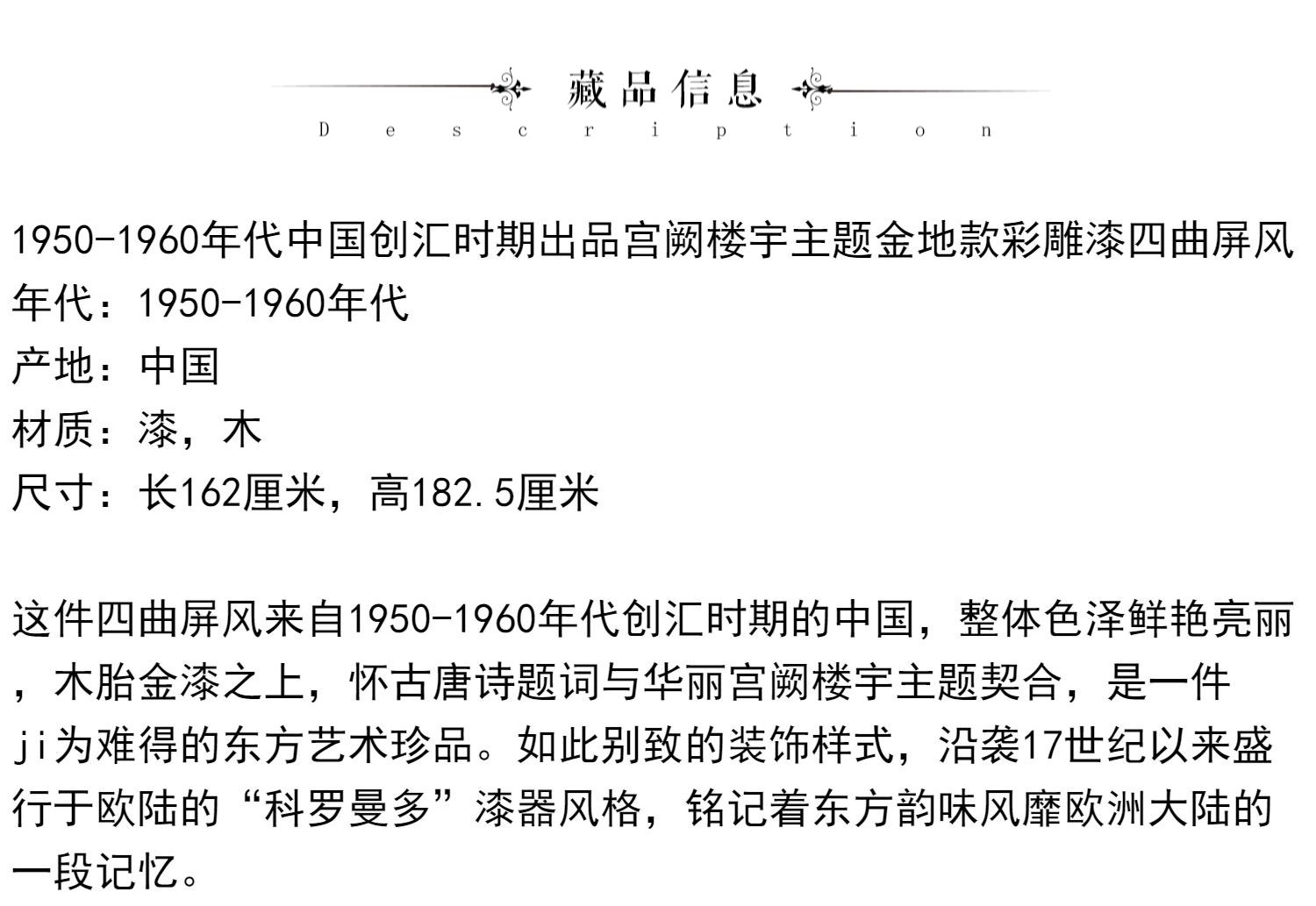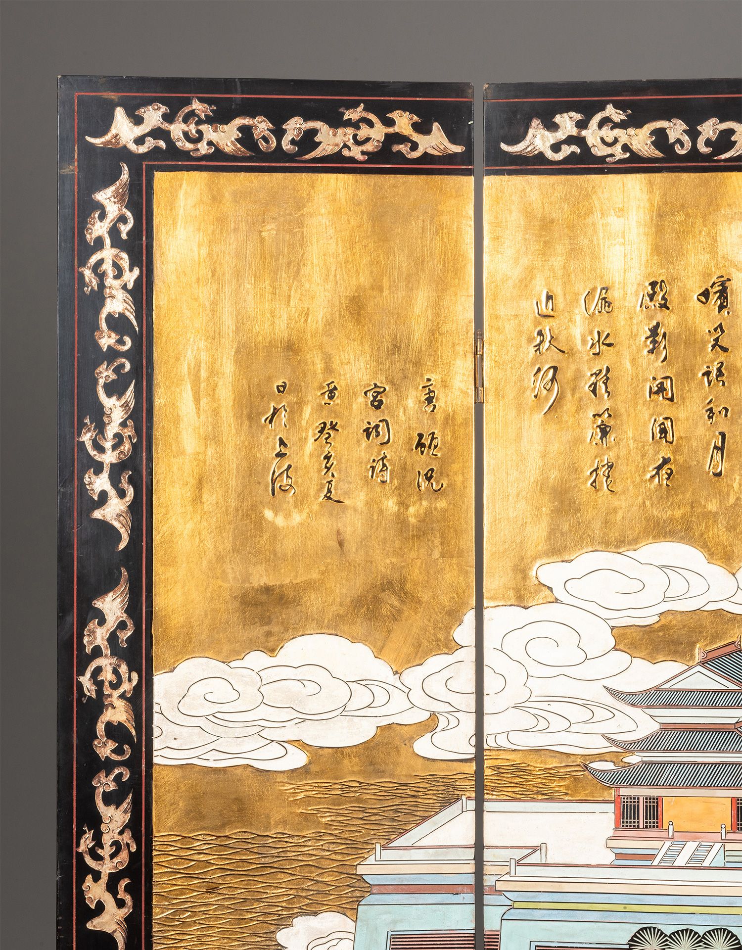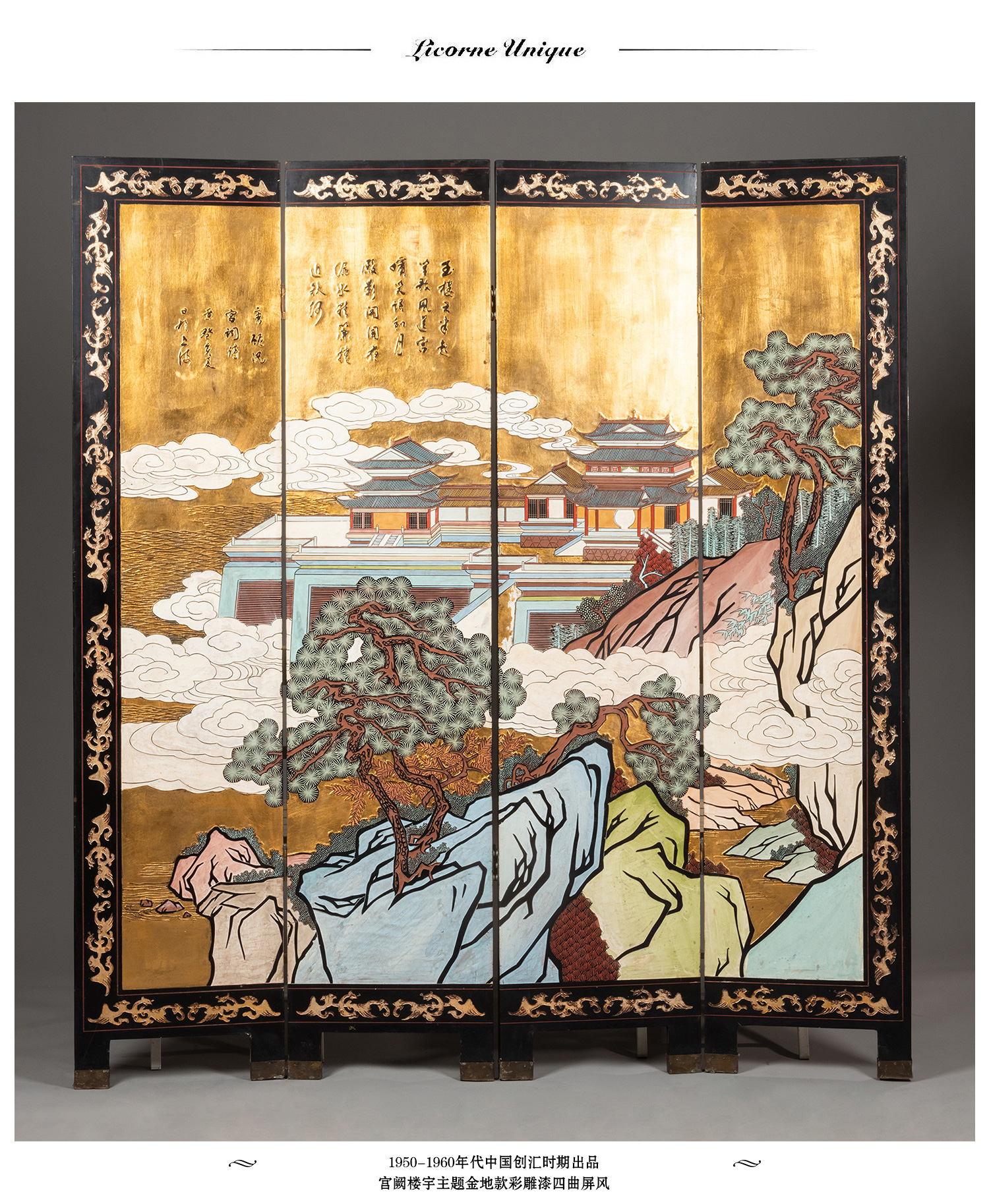 独角鹿西洋古董中国创汇时期宫阙楼宇主题金地款彩雕漆四曲屏风