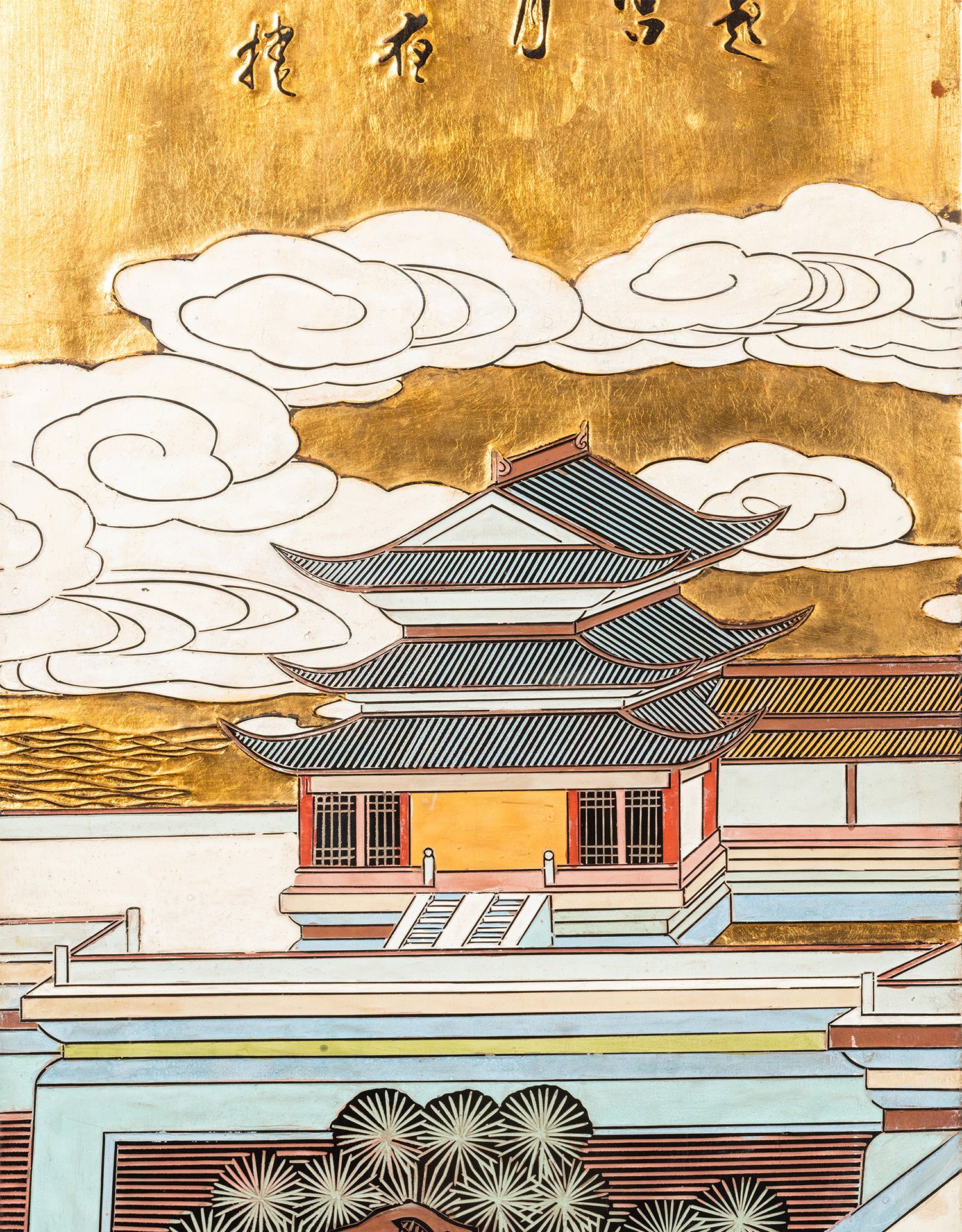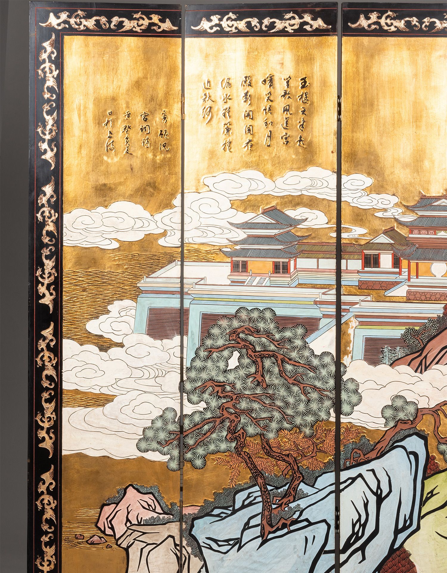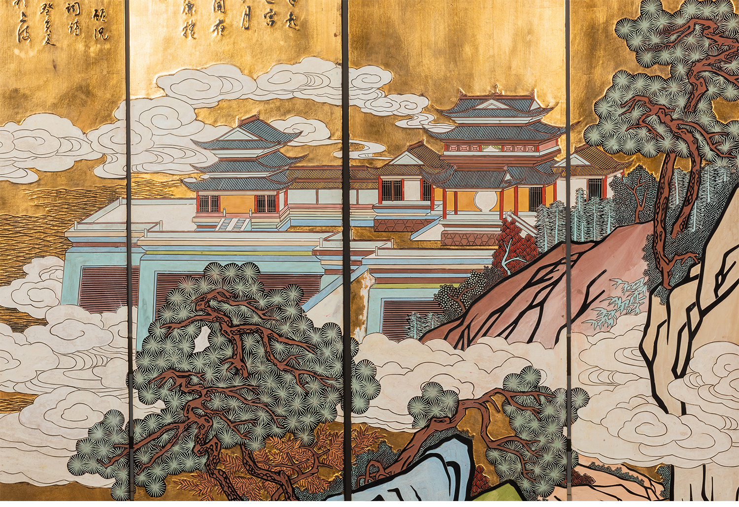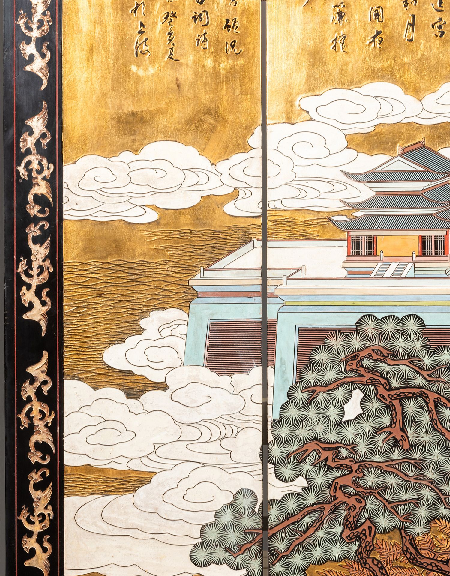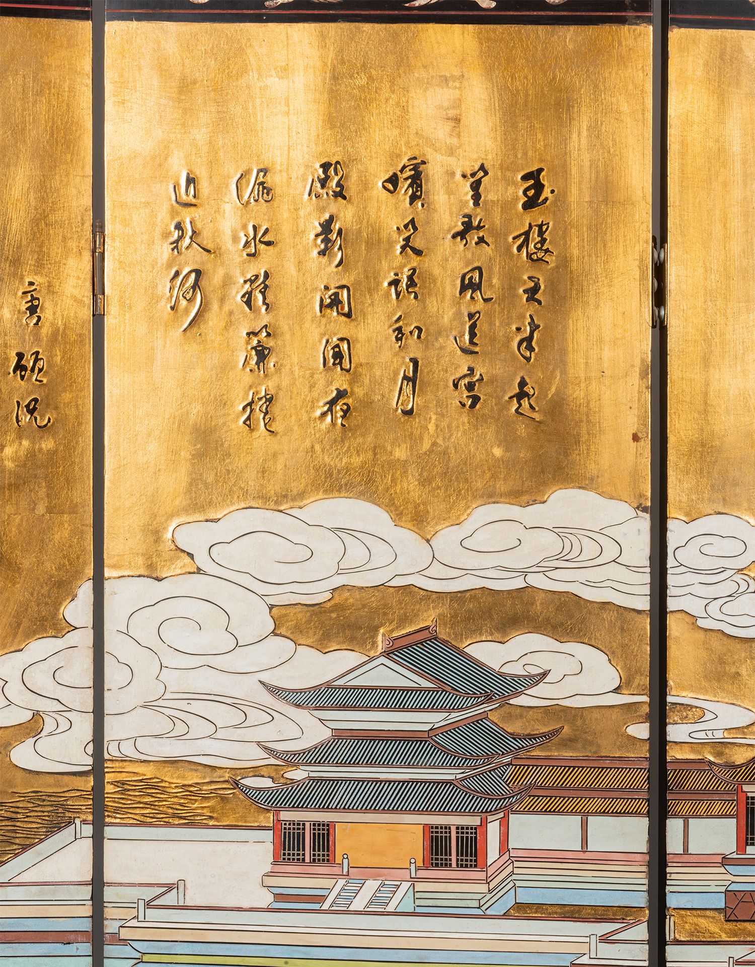 独角鹿西洋古董中国创汇时期宫阙楼宇主题金地款彩雕漆四曲屏风