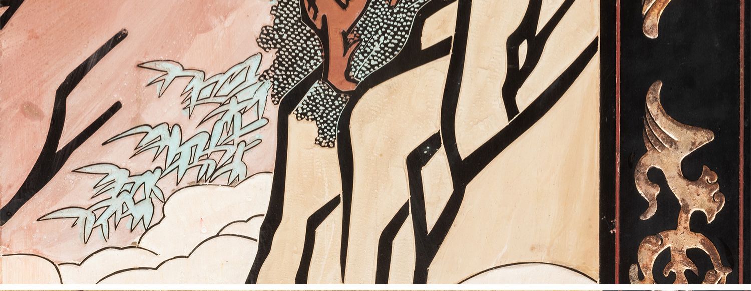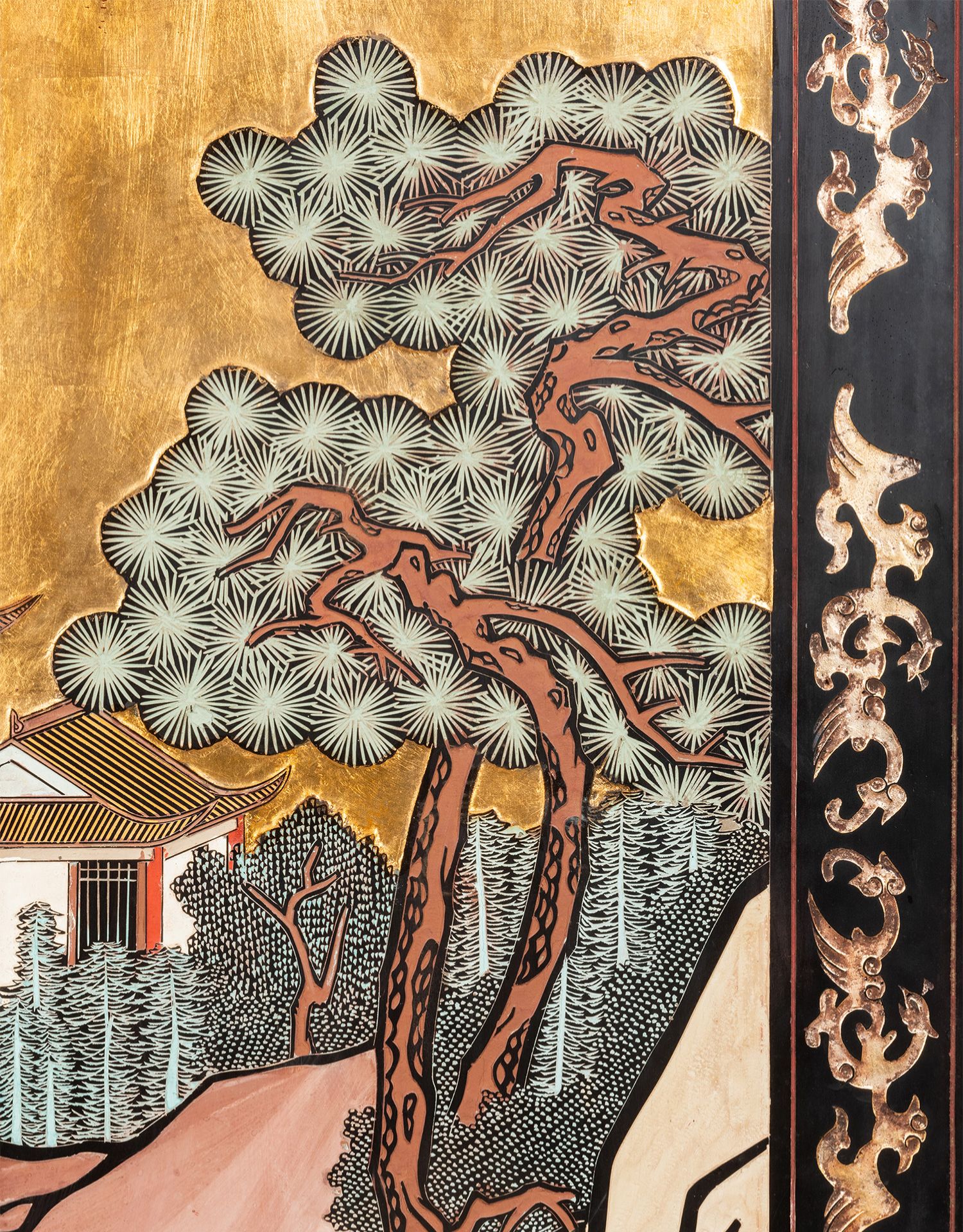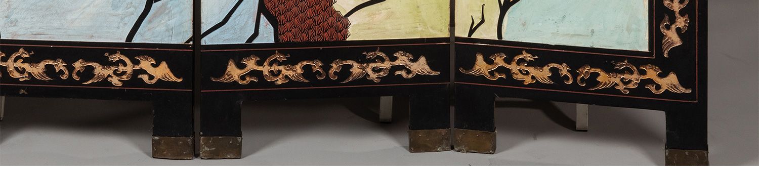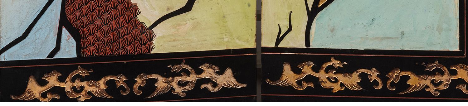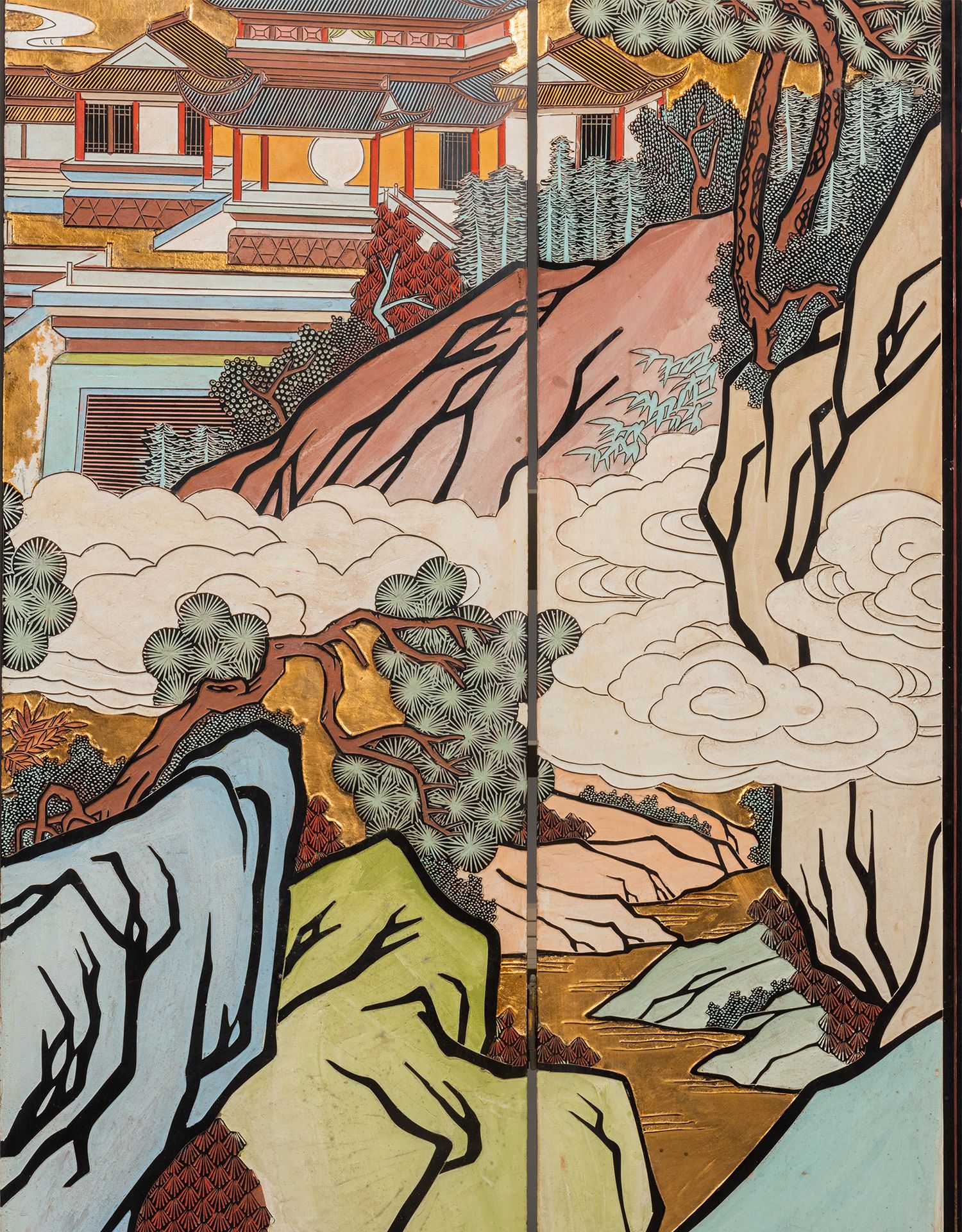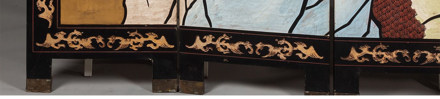 独角鹿西洋古董中国创汇时期宫阙楼宇主题金地款彩雕漆四曲屏风