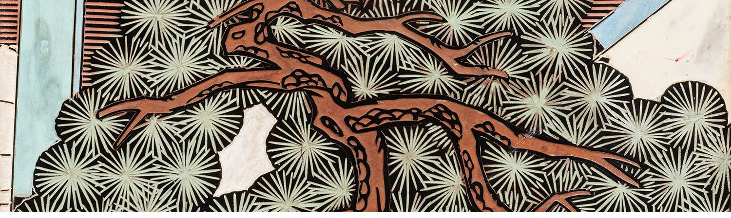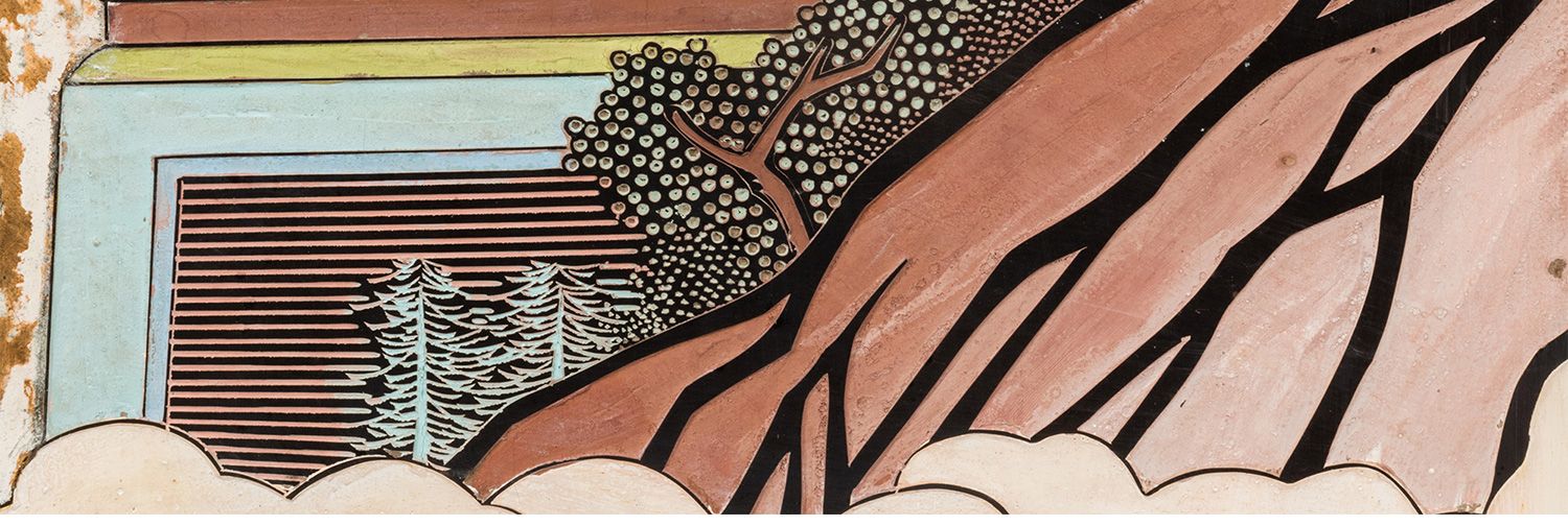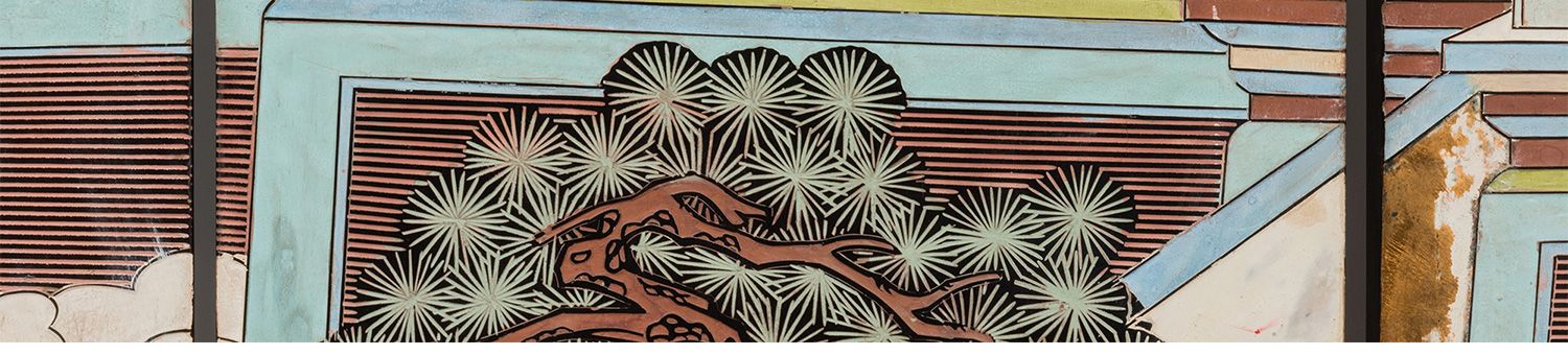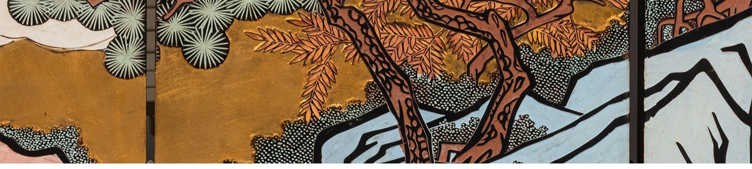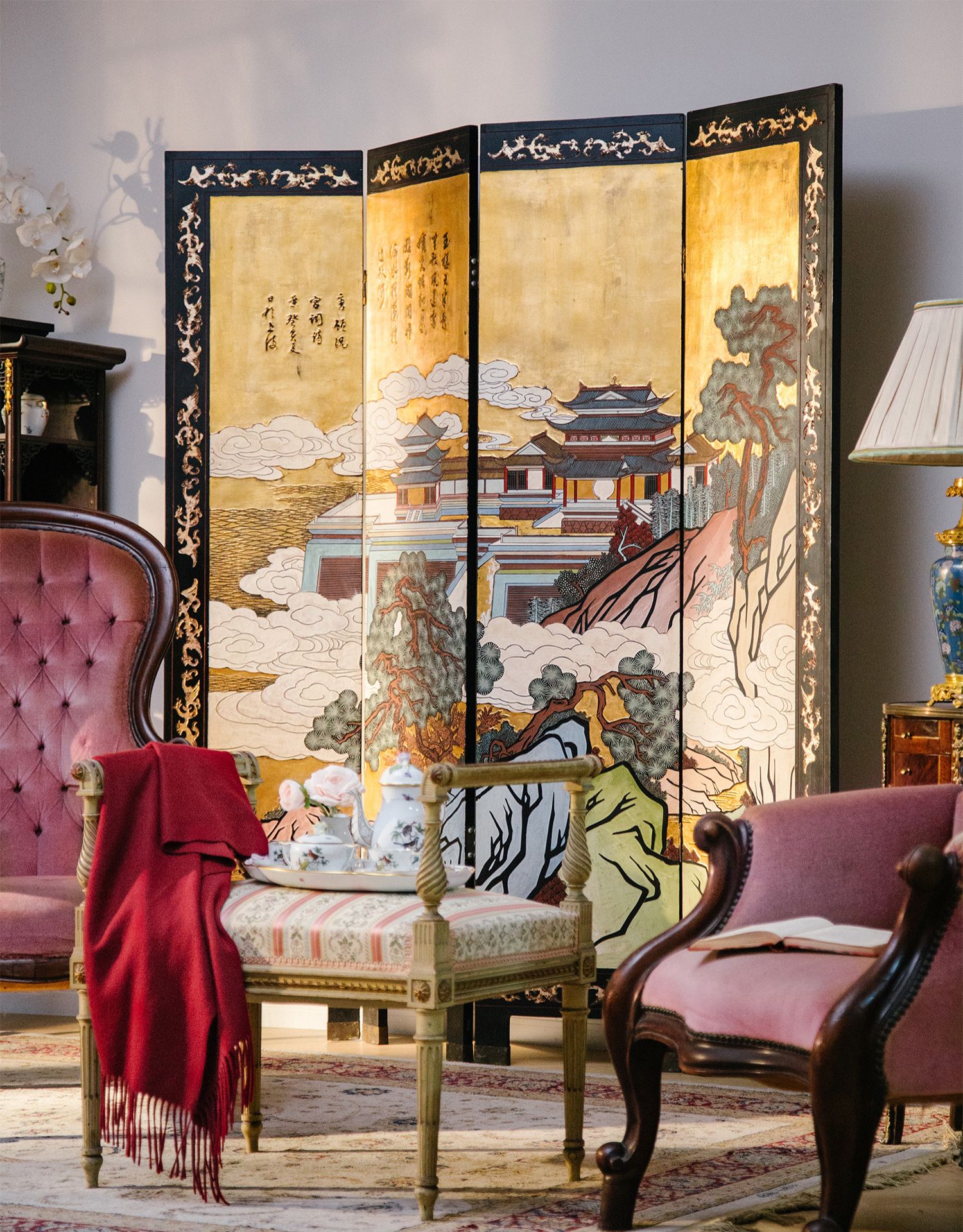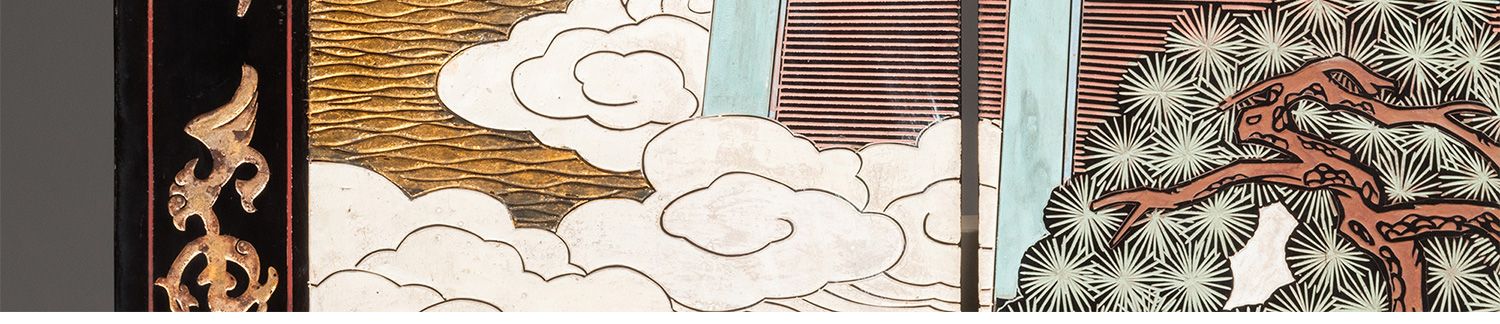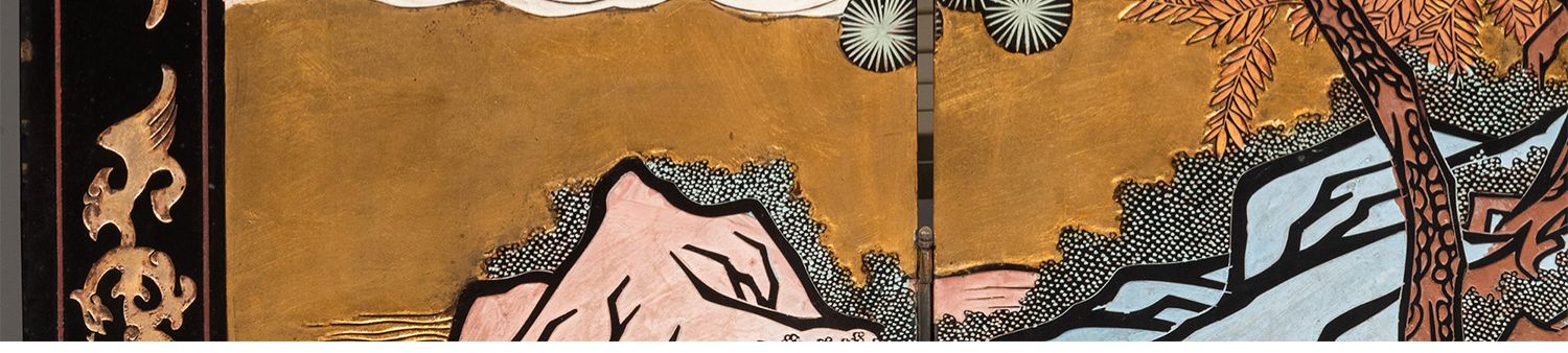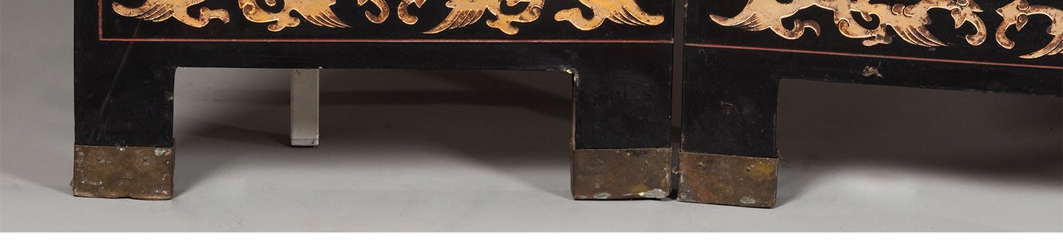 独角鹿西洋古董中国创汇时期宫阙楼宇主题金地款彩雕漆四曲屏风