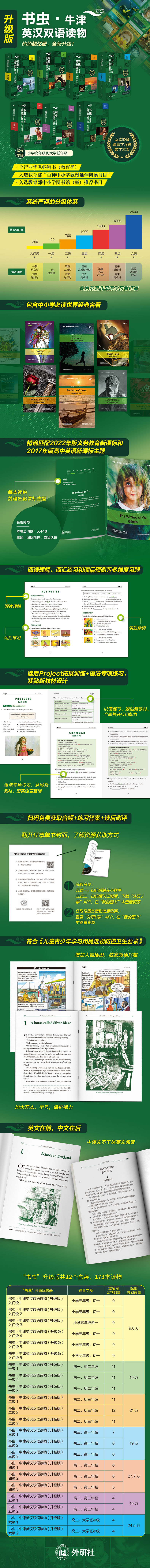 《书虫·牛津英汉双语读物(升级版)入门级5》内含9本英汉双语读物:《卖火柴的小女孩》、《海滩上的鹅卵石》、《福尔摩斯探案故事:垂死的侦探》、《交换人生》、《睡谷的传说》、《威廉·退尔》、《快乐王子》、《白鲸》和《大力神的传说》。这些读物既有经典名著,也有现代原创故事,帮助读者在享受文学的同时提升英语阅读和理解能力。比如,《卖火柴的小女孩》以细腻的笔触和感人的情节,呼吁人们珍惜幸福、关爱他人;《快乐王子》通过王子和燕子的无私行为,传递了爱与奉献的精神;《海滩上的鹅卵石》则透过普通中学女生的故事,引导读者提升沟通能力,和家人、邻居共同营造和谐美满的生活。图书可点读,还可扫码免费听音频,并配有免费资源(音频、习题答案和读后测试),适合小学高年级至初一年级学生阅读与学习。