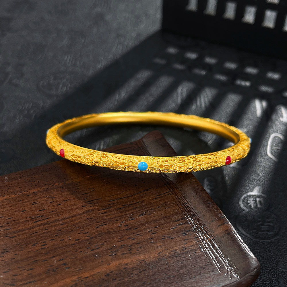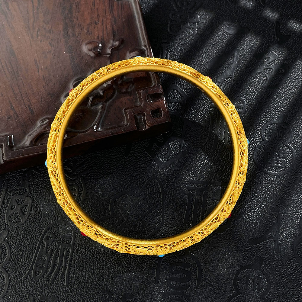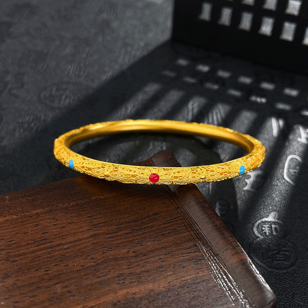 【限时克减150元】足金999.9 #宫廷风 #低温珐琅 古法镂空固口手镯古风花开富贵花丝皇后手镯(ANWZGFSZ00068-1)(预售产品下单后不退款不退货不换货不补差价