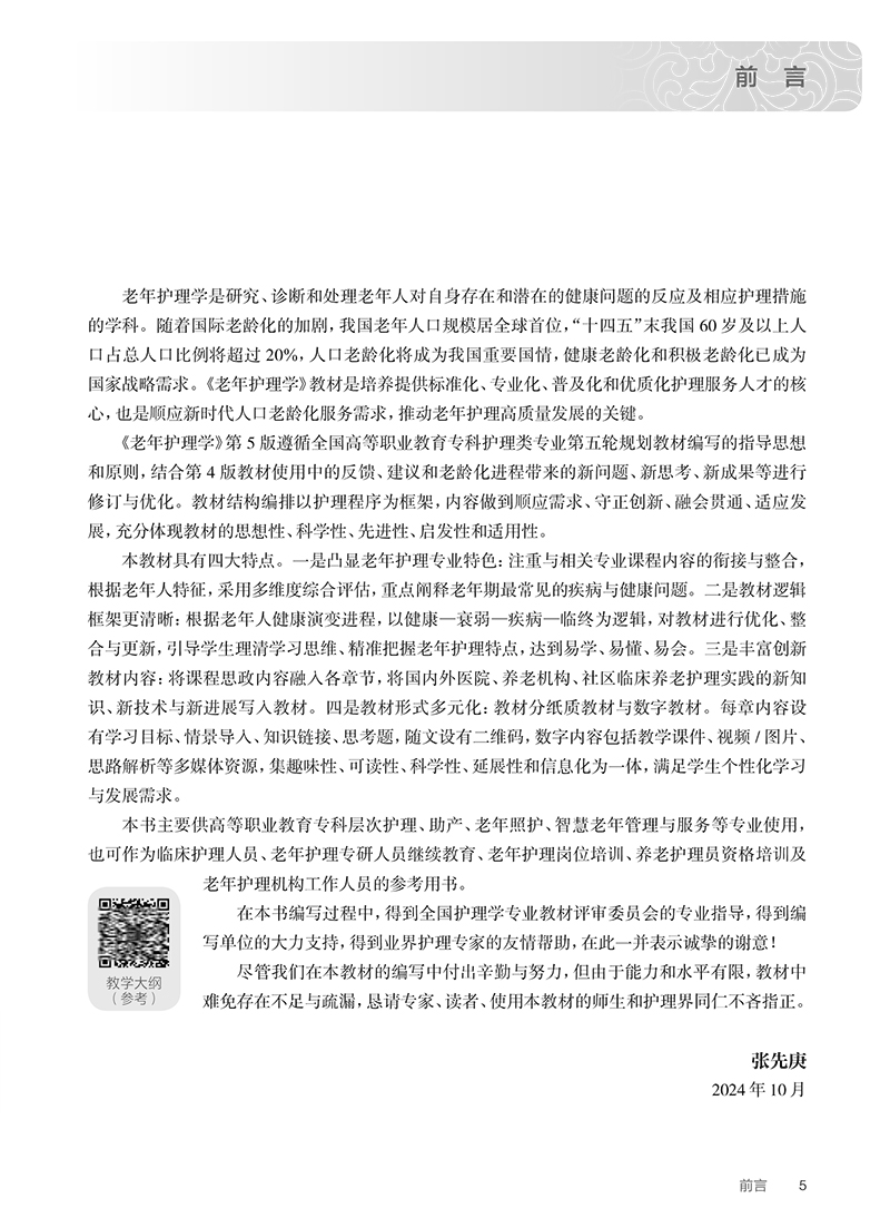 以“三基、五性、三特定”原则,立足立德树人,紧扣高职护理专业人才培养目标,突出新时代高职教育理念,把握传承与创新,以老年健康需求为导向、老年护理岗位胜任力为主线锤炼编写内容,使教材更具思想性、科学性、先进性、适用性和启发性。重构课程模块后全书内容包括绪论、老年人的健康保健、老年人的综合评估、老年人的安全用药与护理、老年人的常见心理与精神护理、老年人常见综合征的护理、老年人常见疾病的护理等十章。内容上:①突显老年护理专业特色。因老年人常呈现出多病共存,多种疾病或不同原因造成同一种健康问题,需要多维度综合评估、多学科综合干预。本教材既体现老年健康的整体护理观,又重视与各相关专业课程内容的衔接与交叉,并避免与其他相关教材重复。②调整了教材逻辑框架。在延续前一版教材内容科学性与实用性基础上,根据老年人健康演变进程,从健康一衰弱一疾病一临终逻辑,对教材进行调整、补充与更新,引导学生理清学习思维、精准把握老年护理学特点,利于学生理解、记忆与灵活应用。③丰富教材的内容与形式。已参考国内外老年护理学领域新知识、新技术与新进展,补充、更新与拓展各章节内容,并与数字化建设、媒体资源相结合,使教材更具有趣味性、可读性、延伸性,有助于满足学生学习与发展的需求。