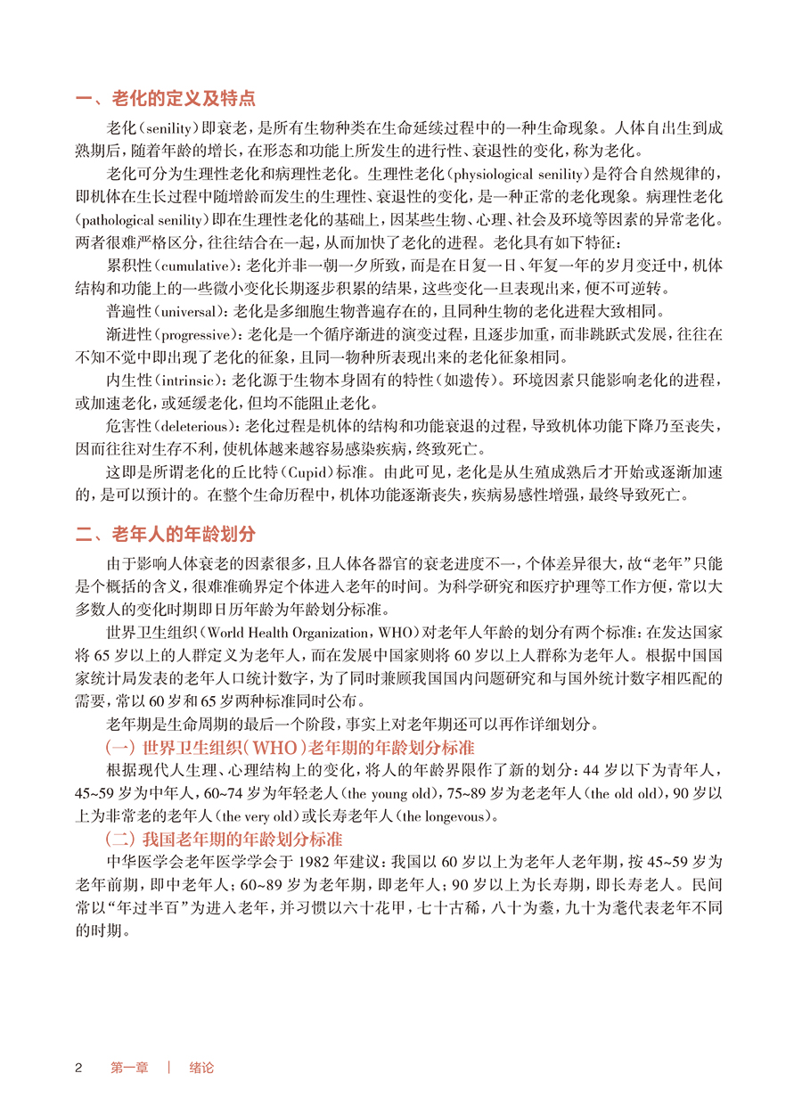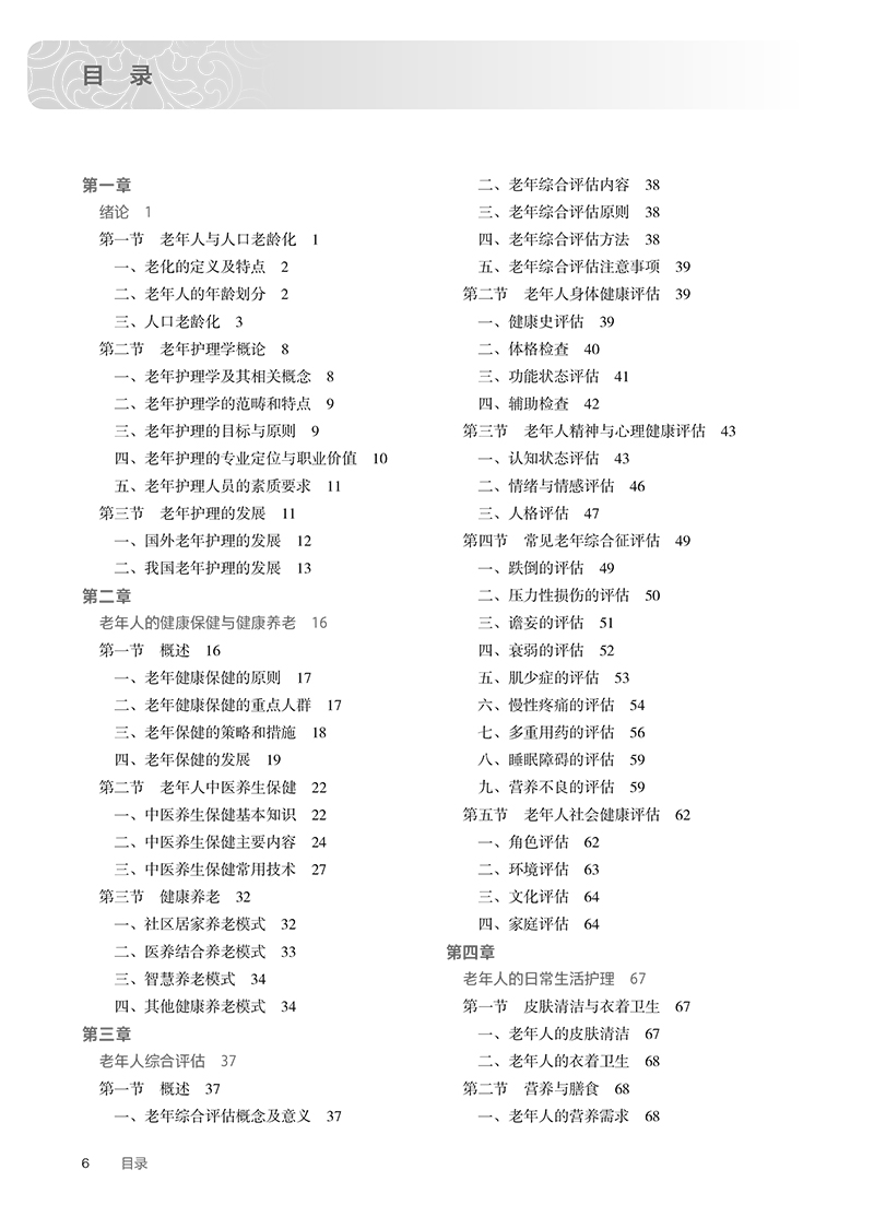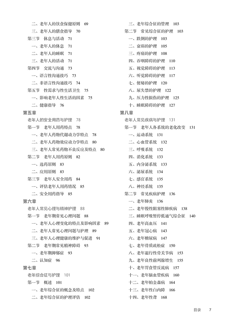 第一章 绪论 1 第一节 老年人与人口老龄化 1 一、 老化的定义及特点 2 二、 老年人的年龄划分 2 三、 人口老龄化 3 第二节 老年护理学概论 8 一、 老年护理学及其相关概念 8 二、 老年护理学的范畴和特点 9 三、 老年护理的目标与原则 9 四、 老年护理的专业定位与职业价值 10 五、 老年护理人员的素质要求 11 第三节 老年护理的发展 11 一、 国外老年护理的发展 12 二、 我国老年护理的发展 13 第二章 老年人的健康保健与健康养老 16 第一节 概述 16 一、 老年健康保健的原则 17 二、 老年健康保健的重点人群 17 三、 老年保健的策略和措施 18 四、 老年保健的发展 19 第二节 老年人中医养生保健 22 一、 中医养生保健基本知识 22 二、 中医养生保健主要内容 24 三、 中医养生保健常用技术 27 第三节 健康养老 32 一、 社区居家养老模式 32 二、 医养结合养老模式 33 三、 智慧养老模式 34 四、 其他健康养老模式 34 第三章 老年人综合评估 37 第一节 概述 37 一、 老年综合评估概念及意义 37 二、 老年综合评估内容 38 三、 老年综合评估原则 38 四、 老年综合评估方法 38 五、 老年综合评估注意事项 39 第二节 老年人身体健康评估 39 一、 健康史评估 39 二、 体格检查 40 三、 功能状态评估 41 四、 辅助检查 42 第三节 老年人精神与心理健康评估 43 一、 认知状态评估 43 二、 情绪与情感评估 46 三、 人格评估 47 第四节 常见老年综合征评估 49 一、 跌倒的评估 49 二、 压力性损伤的评估 50 三、 谵妄的评估 51 四、 衰弱的评估 52 五、 肌少症的评估 53 六、 慢性疼痛的评估 54 七、 多重用药的评估 56 八、 睡眠障碍的评估 59 九、 营养不良的评估 59 第五节 老年人社会健康评估 62 一、 角色评估 62 二、 环境评估 63 三、 文化评估 64 四、 家庭评估 64 第四章 老年人的日常生活护理 67 第一节 皮肤清洁与衣着卫生 67 一、 老年人的皮肤清洁 67 二、 老年人的衣着卫生 68 第二节 营养与膳食 68 一、 老年人的营养需求 68 二、 老年人的饮食保健原则 69 三、 老年人的膳食指导 70 第三节 休息与活动 71 一、 老年人的休息 71 二、 老年人的睡眠 71 三、 老年人的活动 71 第四节 交流与沟通 73 一、 语言性沟通技巧 73 二、 非语言性沟通技巧 74 第五节 性需求与性生活卫生 75 一、 影响老年人性生活的因素 75 二、 健康指导 76 第五章 老年人的安全用药与护理 78 第一节 老年人用药特点 78 一、 老年人药物代谢动力学特点 78 二、 老年人药物效应动力学特点 80 三、 老年人常见药物不良反应及特点 80 第二节 老年人用药原则 82 一、 选药原则 83 二、 应用原则 83 第三节 老年人安全用药 84 一、 评估老年人用药情况 85 二、 安全用药指导 85 第六章 老年人常见心理与精神护理 88 第一节 老年期常见心理问题 88 一、 老年人心理变化的特点及影响因素 89 二、 老年人常见心理问题与护理 89 三、 老年人心理健康的维护与促进 91 第二节 老年期常见精神障碍 93 一、 老年期抑郁症 93 二、 认知症 96 第七章 老年综合征与护理 101 第一节 概述 101 一、 老年综合征的概念及特点 102 二、 老年综合征的护理评估 102 三、 老年综合征的管理 103 第二节 常见综合征的护理 103 一、 跌倒的护理 103 二、 衰弱的护理 105 三、 疼痛的护理 108 四、 吞咽障碍的护理 110 五、 视觉障碍的护理 113 六、 听觉障碍的护理 117 七、 便秘的护理 120 八、 尿失禁的护理 122 九、 压力性损伤的护理 125 十、 睡眠障碍的护理 127 第八章 老年人常见疾病与护理 131 第一节 老年人各系统的老化改变 131 一、 运动系统 131 二、 心血管系统 132 三、 呼吸系统 132 四、 消化系统 133 五、 内分泌系统 133 六、 泌尿系统 134 七、 感官系统 135 八、 神经系统 135 第二节 常见疾病护理 136 一、 老年肺炎 136 二、 老年慢性阻塞性肺疾病 138 三、 睡眠呼吸暂停低通气综合征 140 四、 老年高血压 141 五、 老年冠心病 143 六、 老年糖尿病 147 七、 老年骨质疏松症 150 八、 老年退行性骨关节病 153 九、 老年良性前列腺增生 155 十、 老年胃食管反流病 157 十一、 老年脑血管疾病 160 十二、 老年帕金森病 164 十三、 老年性白内障 166 十四、 老年性聋 168 第九章 老年人的安宁疗护 171 第一节 概述 171 一、 安宁疗护的概念 171 二、 安宁疗护起源与发展 172 三、 影响我国老年安宁疗护的因素 173 四、 老年人安宁疗护的意义 173 第二节 老年人安宁疗护技术 174 一、 临终常见身体症状与护理 174 二、 老年人安宁疗护心理干预技术 176 第三节 老年人的死亡教育 178 一、 濒死及死亡的概念 178 二、 死亡教育的内容 179 第四节 老年丧亲家属的哀伤辅导 181 一、 哀伤辅导的概述 181 二、 哀伤反应与过程 182 三、 哀伤辅导过程与技术 182 四、 丧偶老年人的照护 182 第五节 老年人死亡后照护技术 183 一、 遗物处理原则及法律规范 183 二、 遗体照护技术 184 三、 终末消毒 185 第十章 老年人被虐待问题与权益保障 187 第一节 老年人被虐待问题 187 一、 虐待老年人的概念及形式 188 二、 虐待老年人的原因、影响与理论研究 189 三、 对老年人被虐待问题的预防及干预 191 第二节 老年人的权益保障 192 一、 我国老年人权益保障的状况 192 二、 国外老年人权益保障的状况 193 附录 195 附录一 Katz 日常生活能力评定量表 195 附录二 Lawton 功能