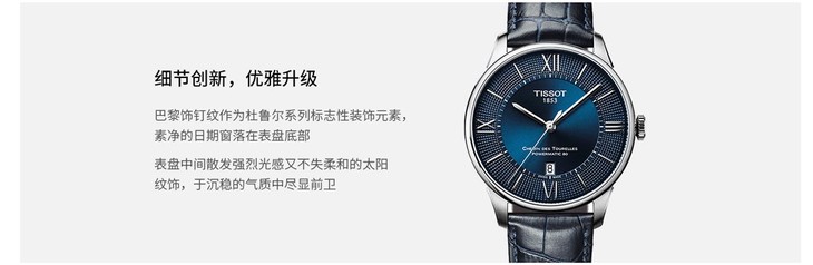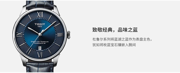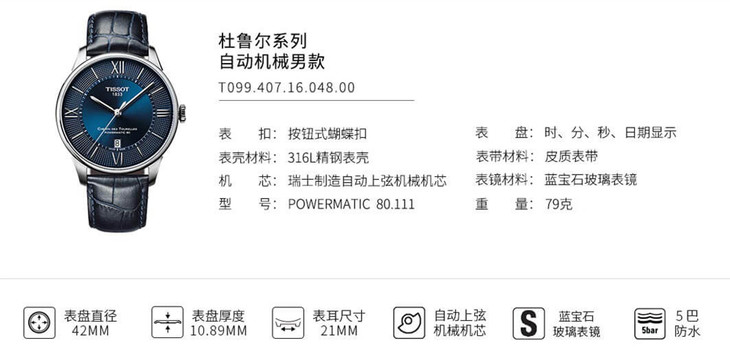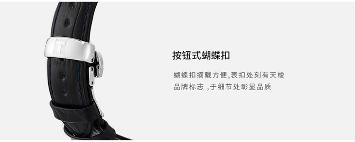 | 防水 | 50 m | 表带 | 蓝色皮质表带 按钮式蝴蝶扣 |