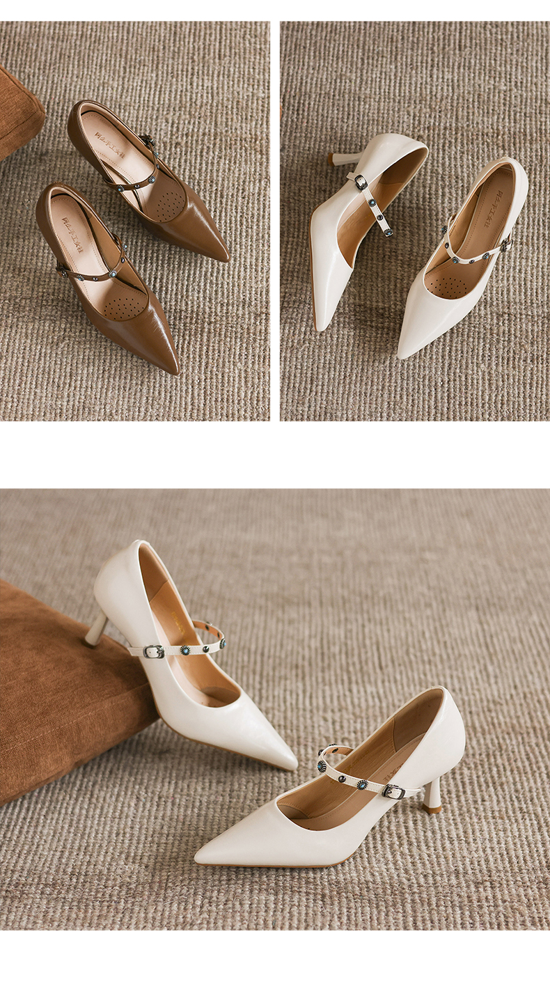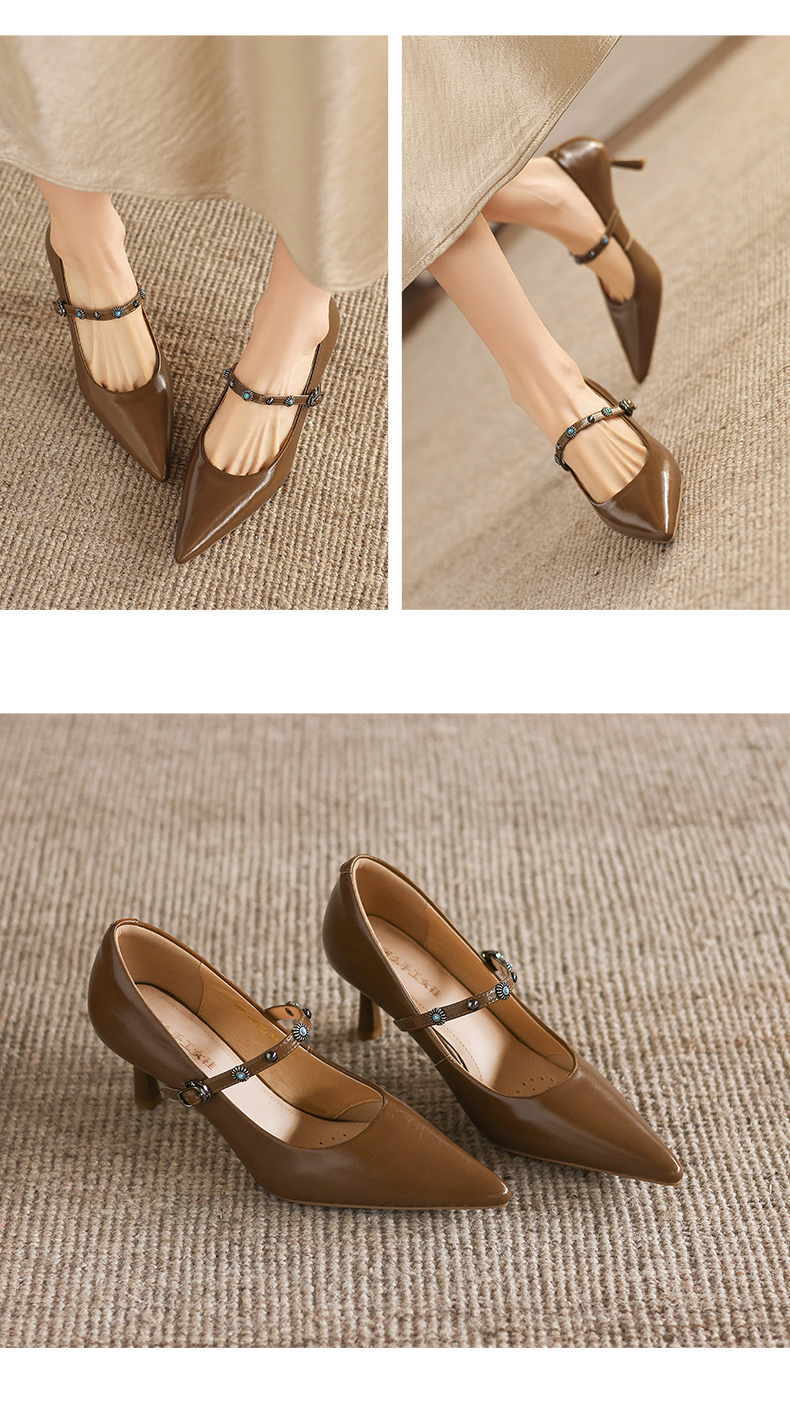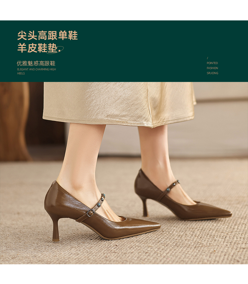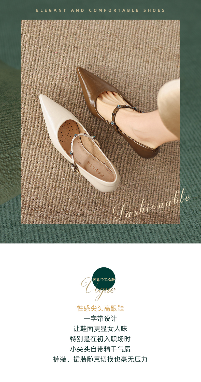 阿么手工女鞋法式细跟一字带尖头高跟鞋6.5CM春季新款浅口单鞋女