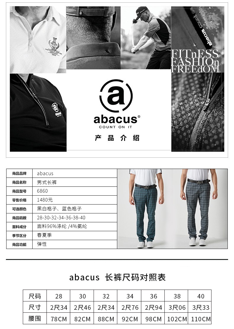 新款abacus高尔夫长裤 男士休闲运动速干球裤 高尔夫衣服 男士裤子 黑白格子 男长裤 28码